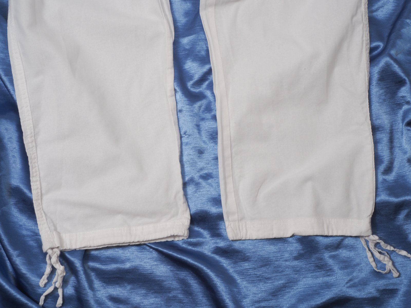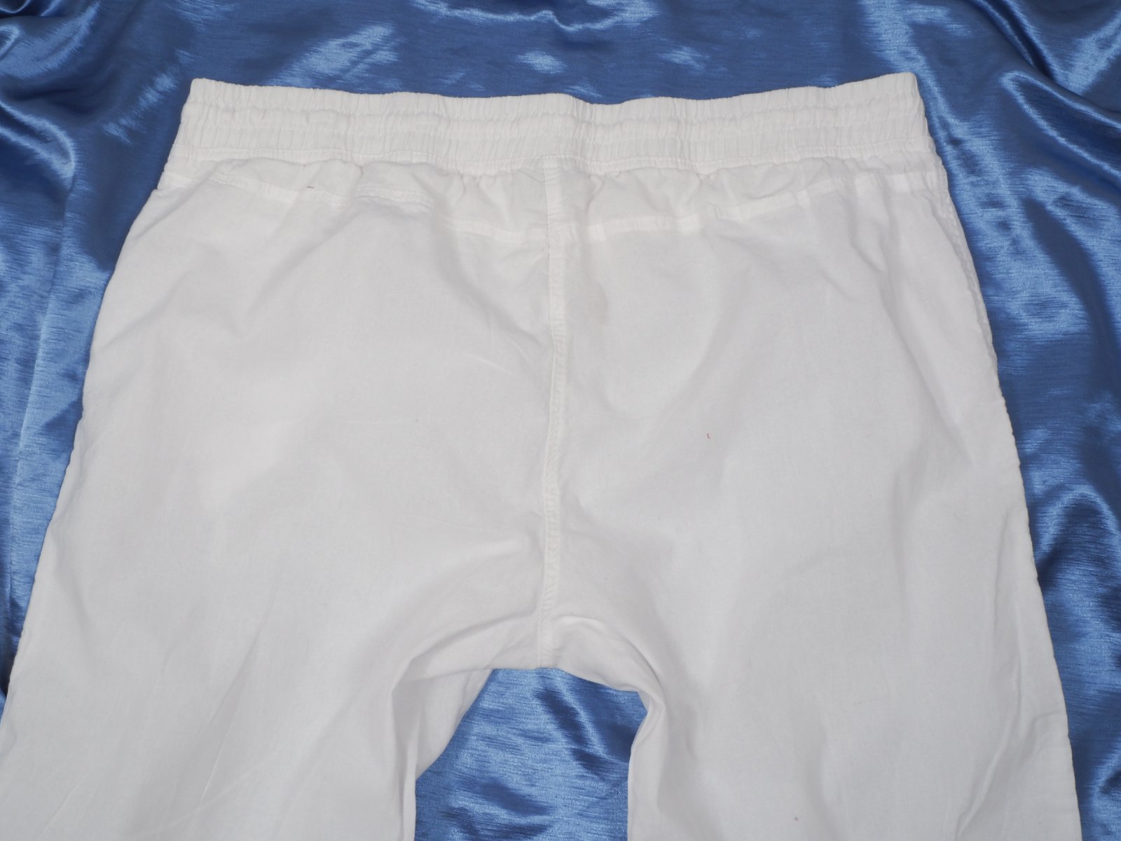 Kvalitné biele letné nohavice, gumka v páse, všité vrecká, dole s možnosťou stiahnutia šnúrkou, super stav.