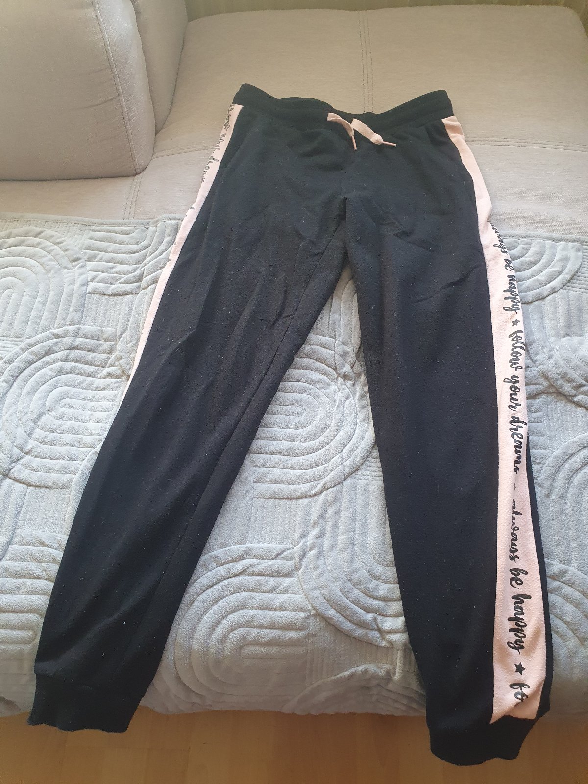 Pohodlné mierne lesklé dievčenské tepláky. Vhodné na telocvik, na doma aj na von. Uvedená je veľkosť 152/158, ale sú trošku menšie - sedia na 152, príp. už aj 146 (10 - 12 rokov). Nosené, ale v su...