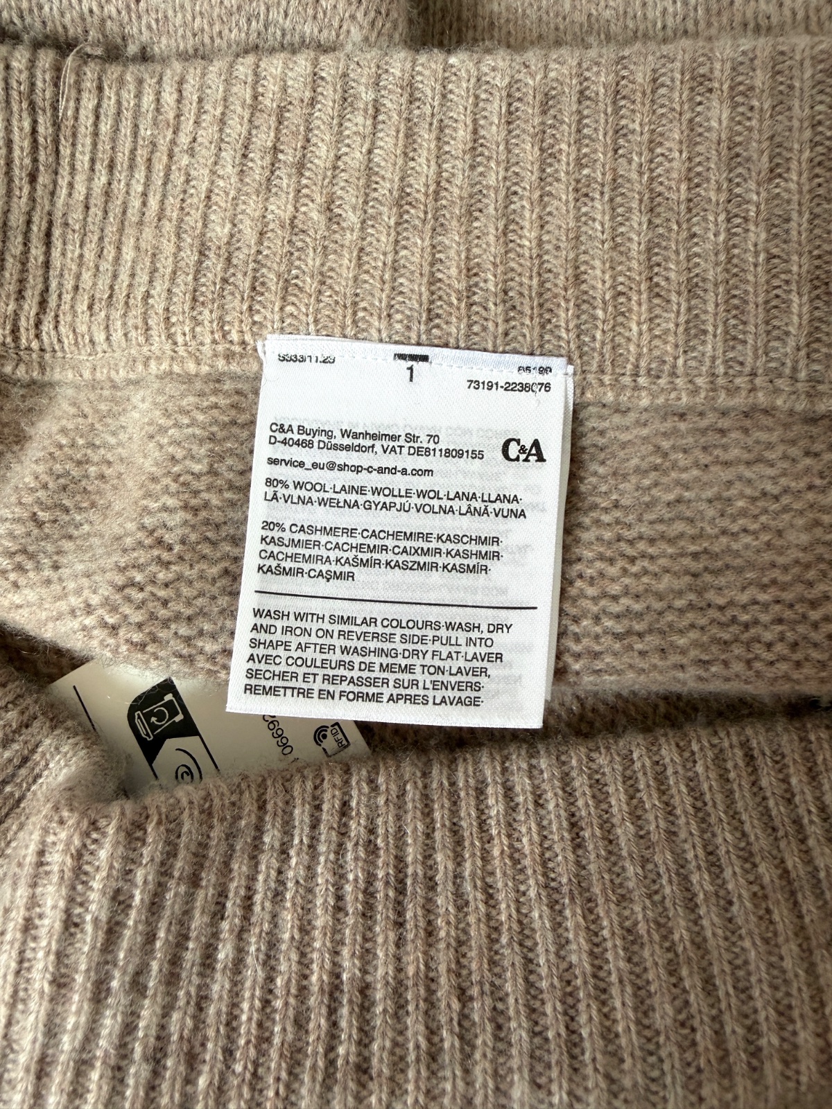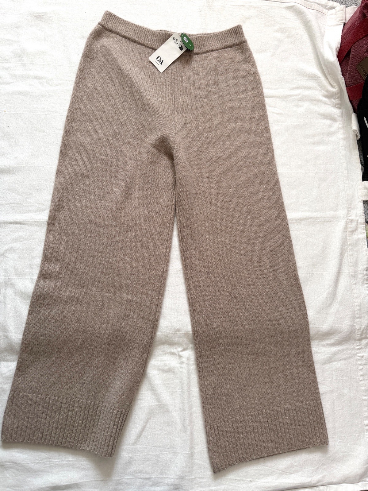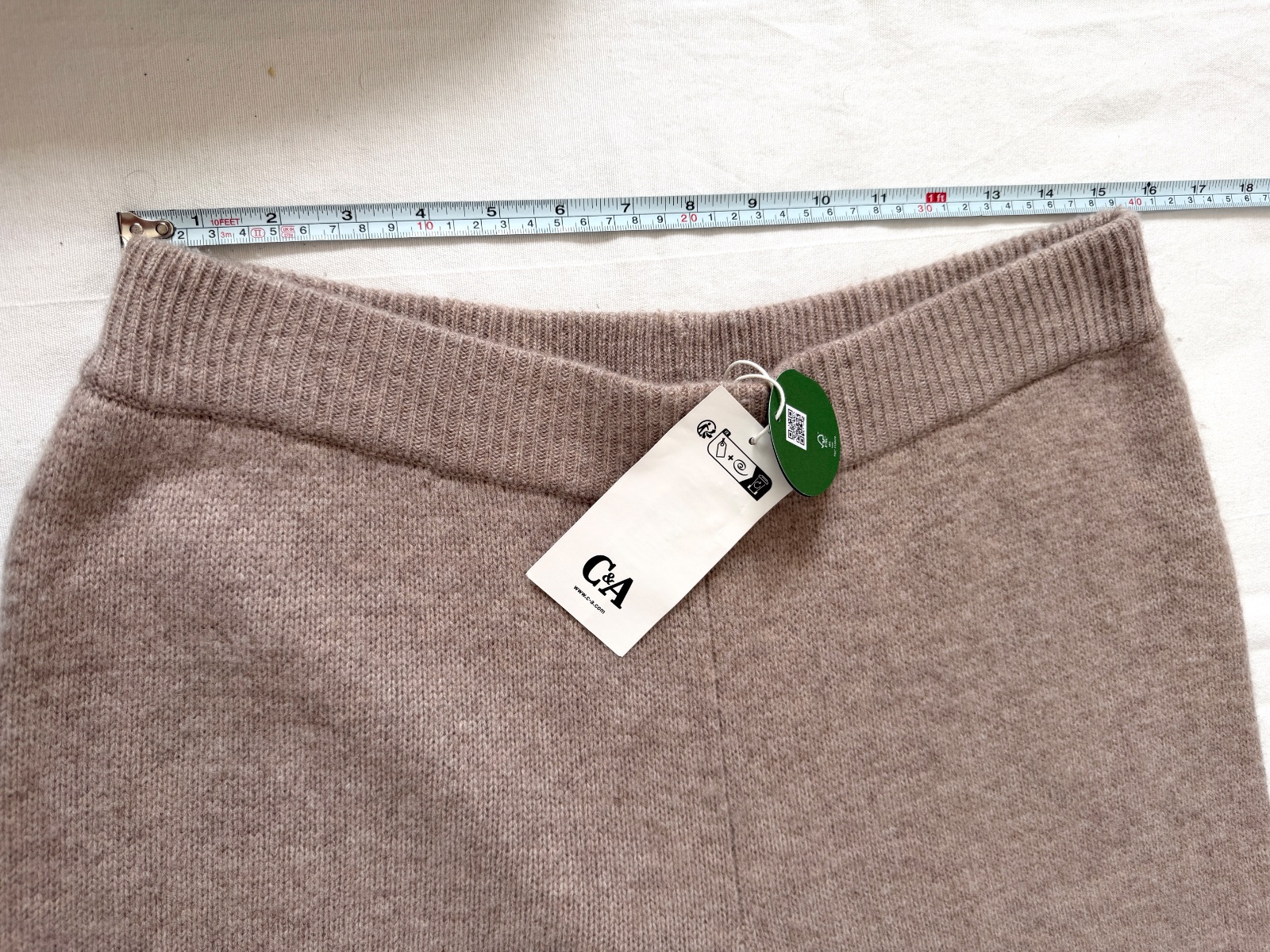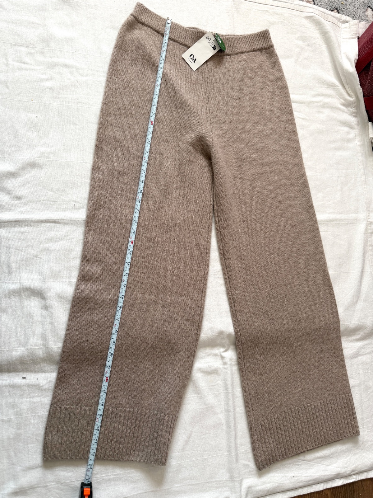 Nádherné, nové široké nohavice vyrobené z vysoko kvalitnej zmesi prírodných vlákien. Je to ideálna voľba pre ľudí, ktorí oceňujú štýl "quiet luxury" a bezkompromisné pohodlie. Nohavice sú mimoriadne mäkké, teplé a príjemné na pokožku. Podrobnosti o produkte. Materiálové zloženie je prírodná zmes – 80 % vlna, 20 % kašmír. Sú to nohavice typu wide leg v elegantnej béžovej farbe. Majú široký elastický pás a ozdobné vrúbkované lemovanie na spodnej časti nohavíc. Nohavice sú nové s visačkami. Veľkosť na visačke je L, všetky rozmery sú na fotkách. Vďaka vysokému obsahu vlny a kašmíru nohavice skvele termoregulujú – hrejú v chladných dňoch, ale umožňujú pokožke dýchať. Ideálne na domáci styling (premium homewear), ako aj na bežné nosenie vonku – skvele vyzerajú s priliehavým rolákom, košeľou alebo oversized sakom.