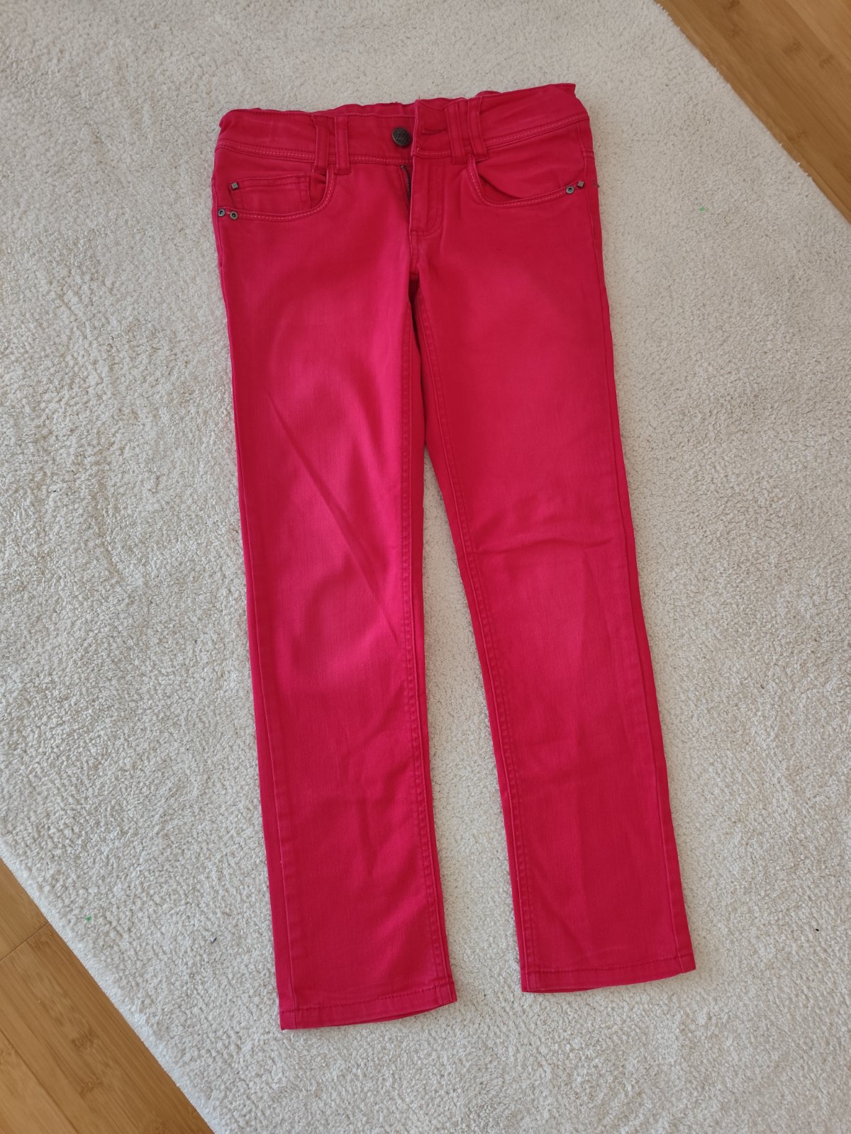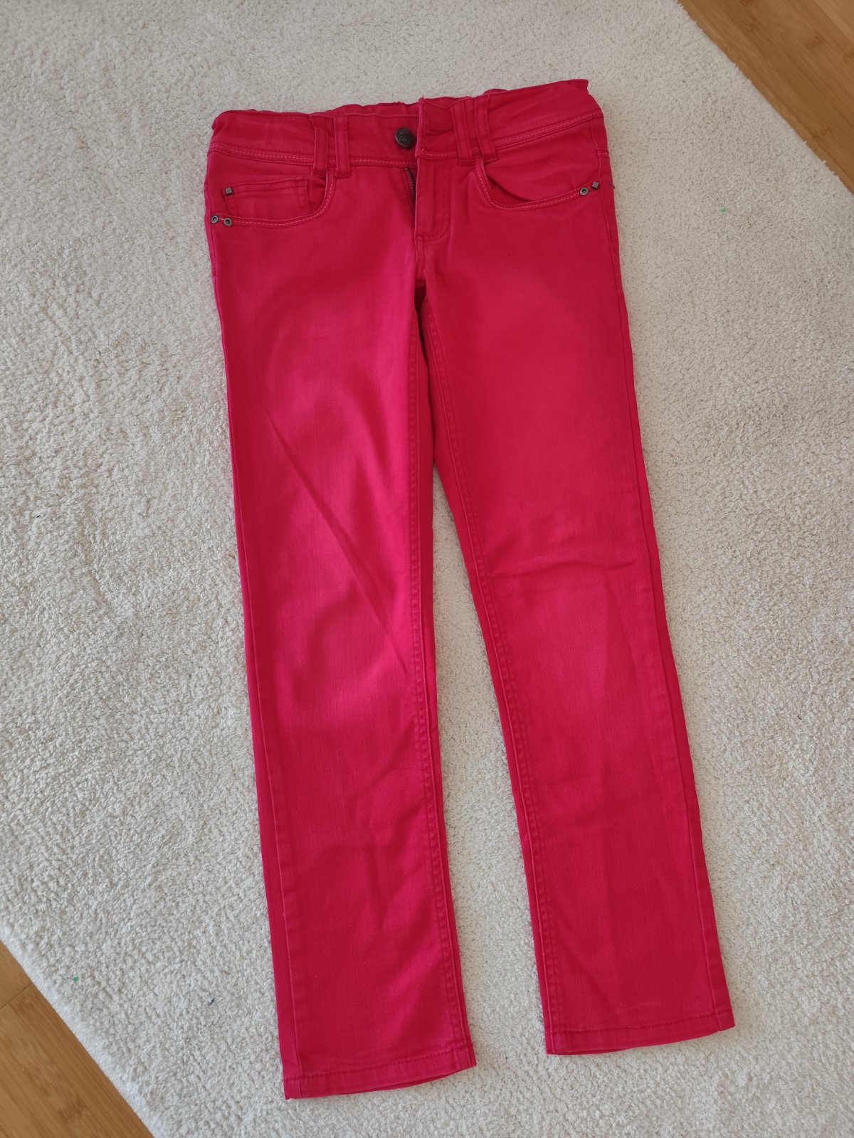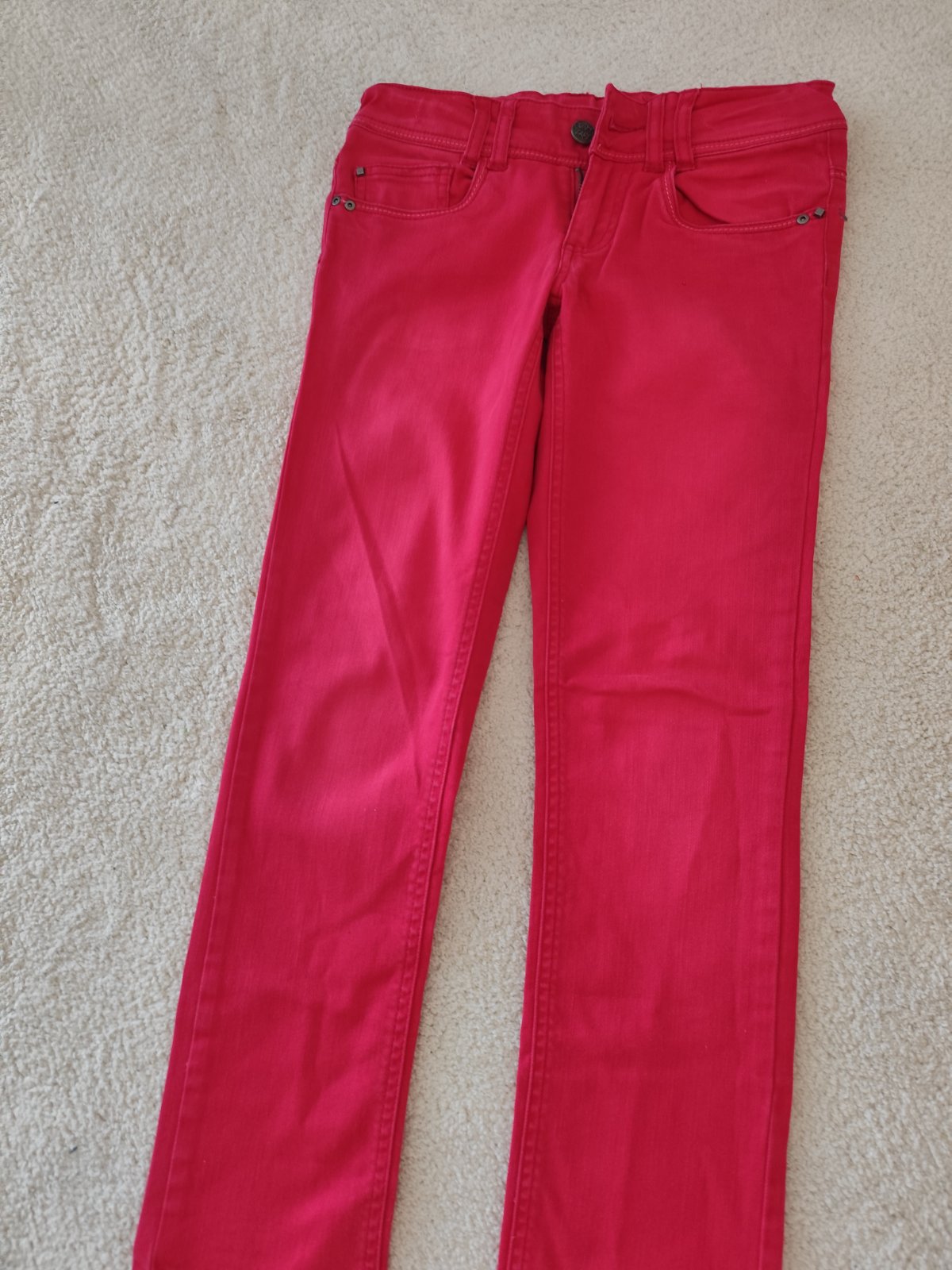 Nohavice som sila ja. Nie som krajčírka čiže sú naozaj len také že po domácky. Ten vrch je trošku zle zošity, ale noseniu nebráni. Inak bez flakov či dier. Farba neónova ružová. Veľkosť tak 146.