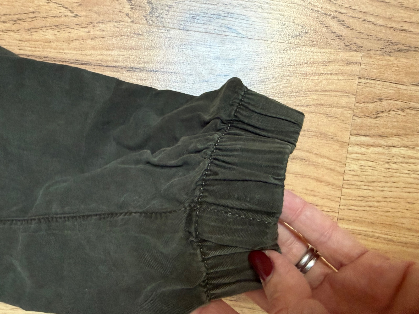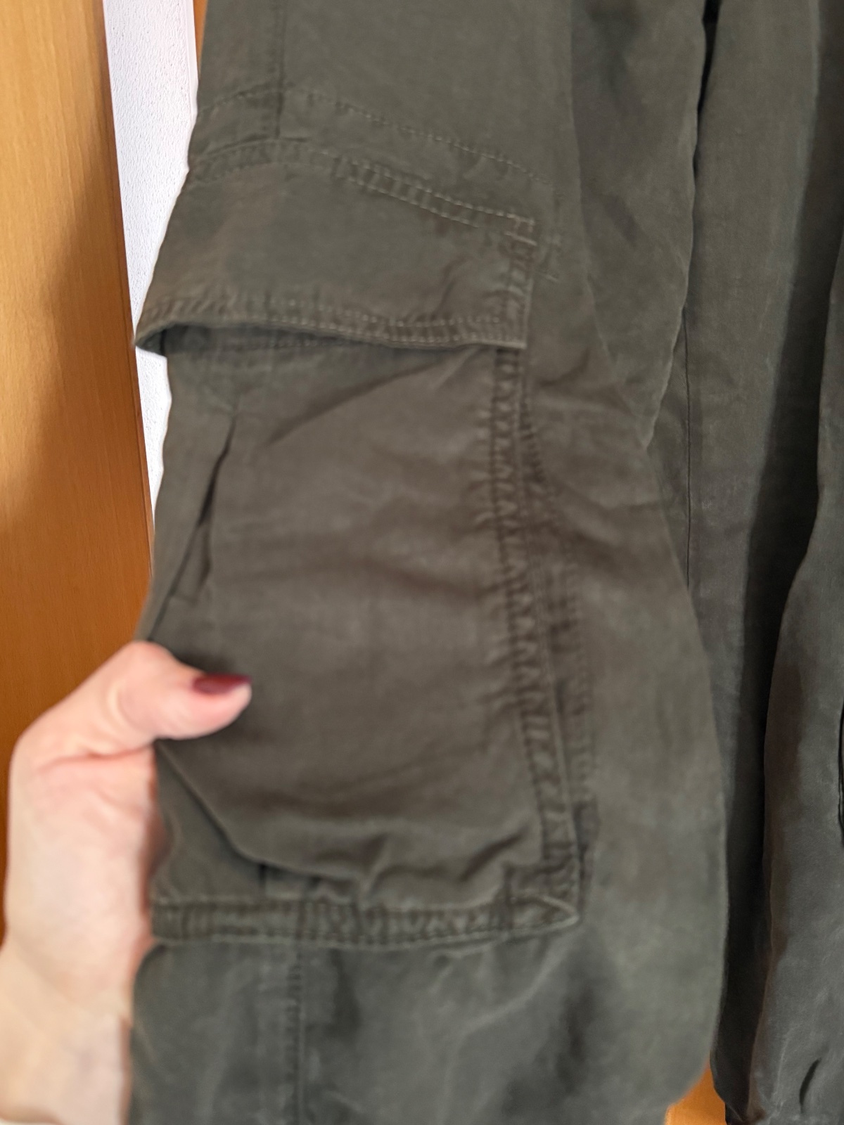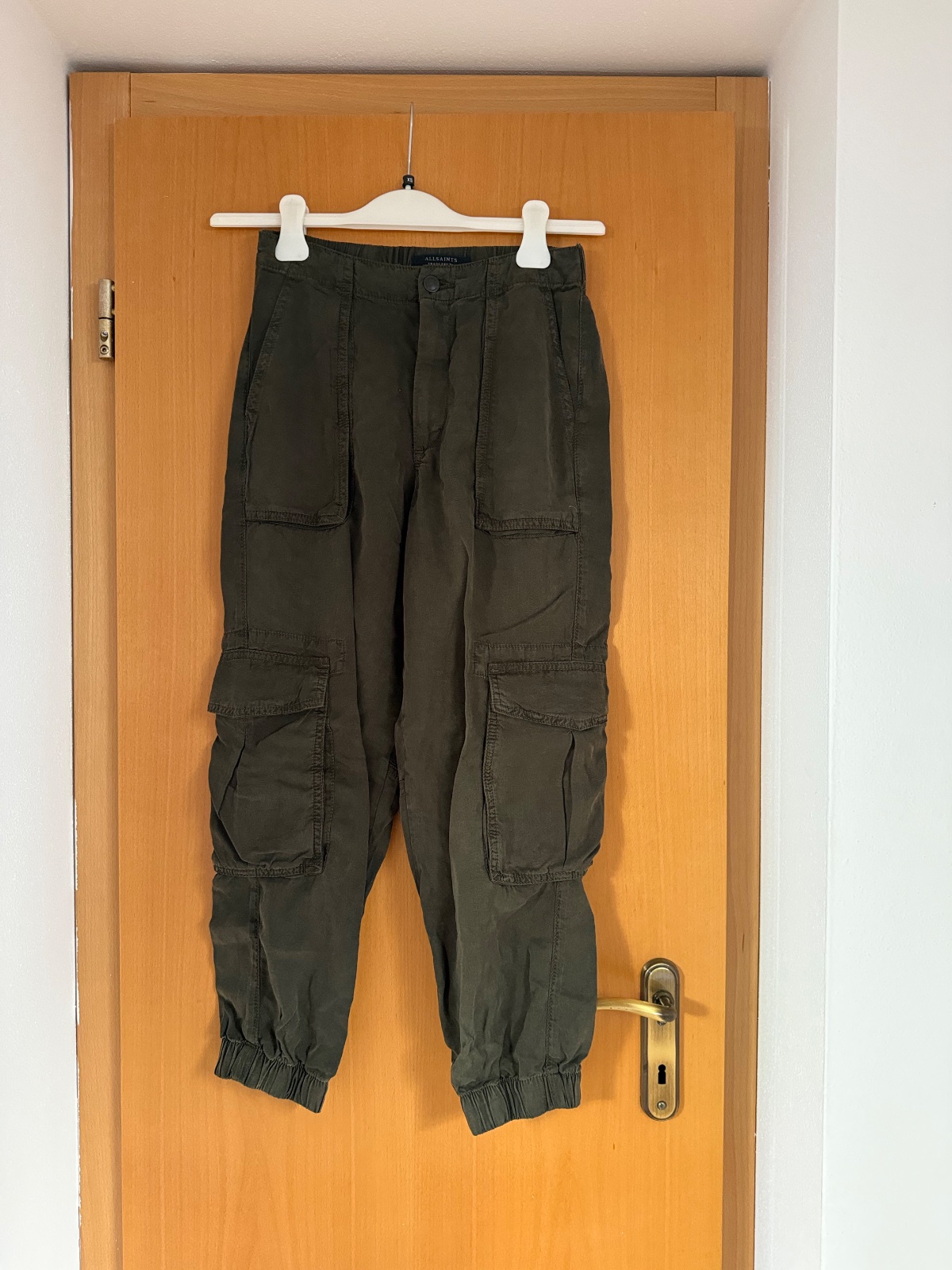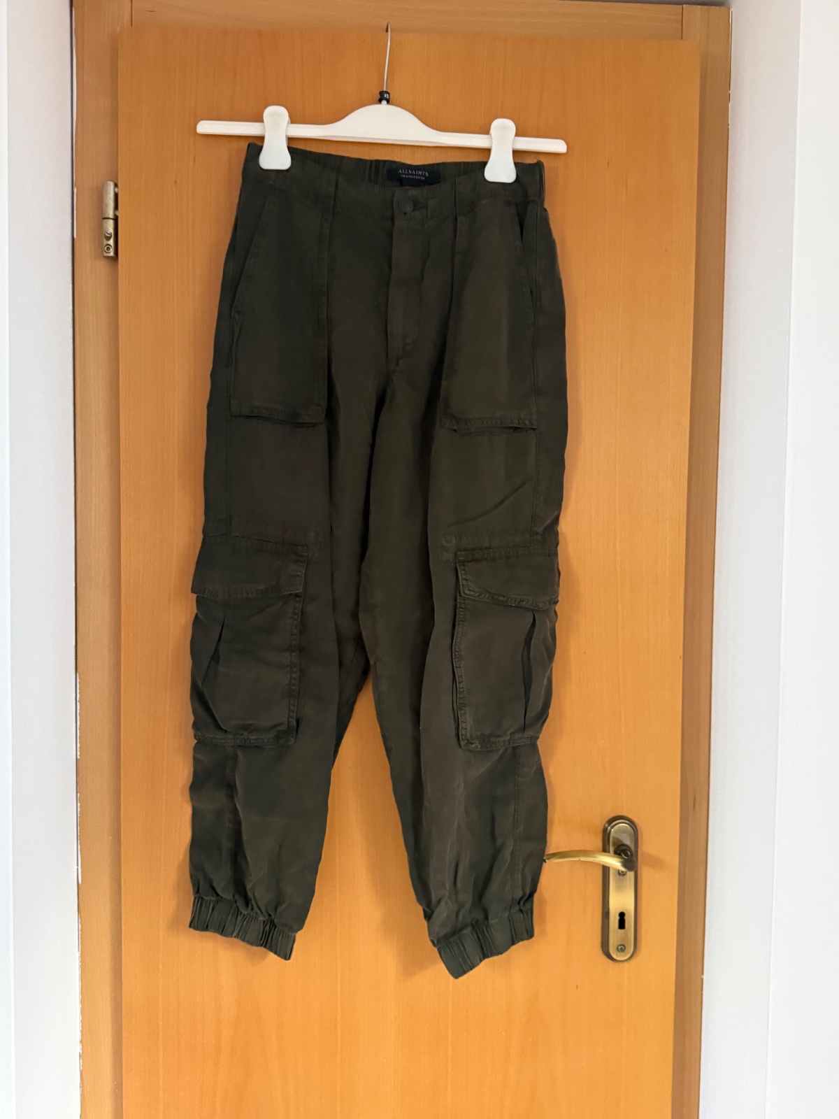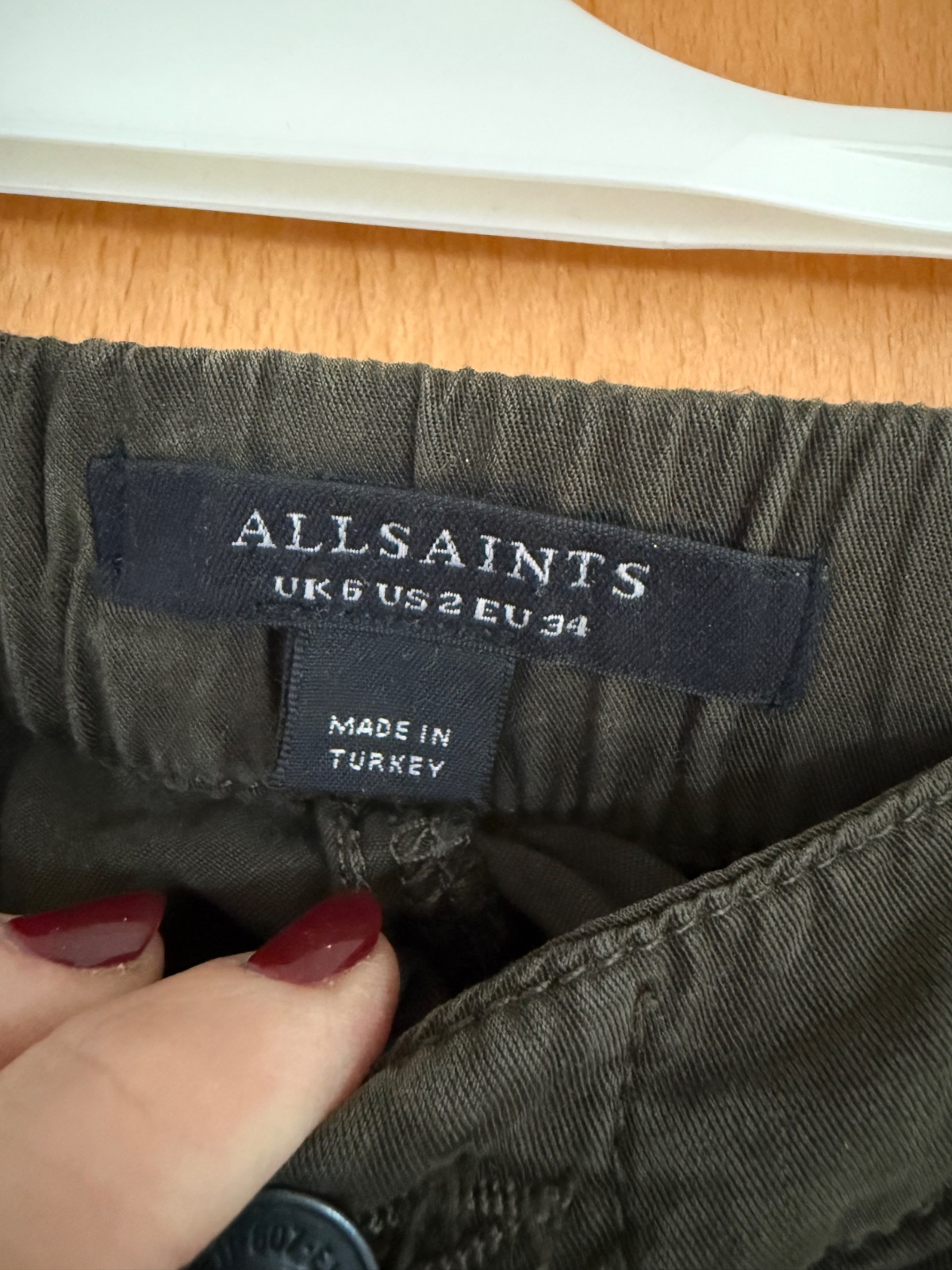 Kapsáčové nohavice v khaki zelenej farbe britskej značky All Saints. Veľkosť UK6 = EU34 (XS). Veľmi príjemný a tenký materiál. Sú pohodlné. Kupované boli v Londýne. Pôvodná cena bola cca 200€.