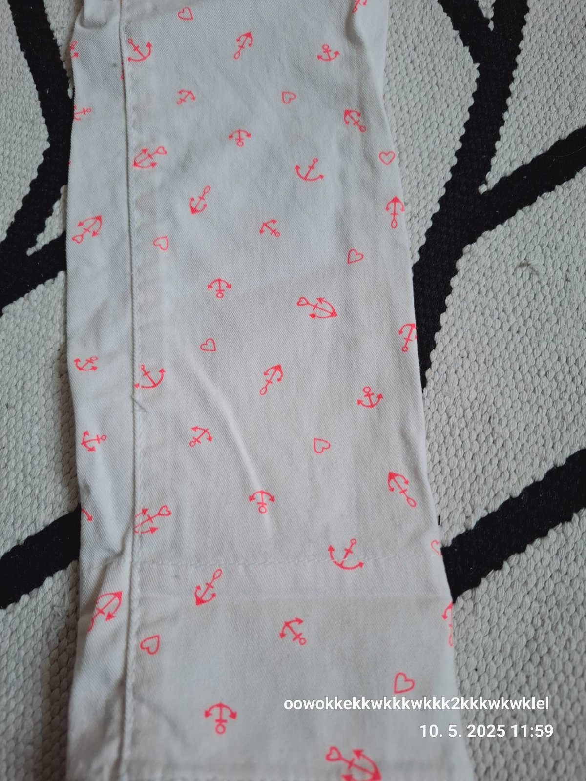 Krásne biele nohavice na leto.s opaskom .na nohaviciach vzor ružová kotva .Mozu sa podohnut a j na vnutornej strane vzor ,ruzova bodka aj opasok ktomu .