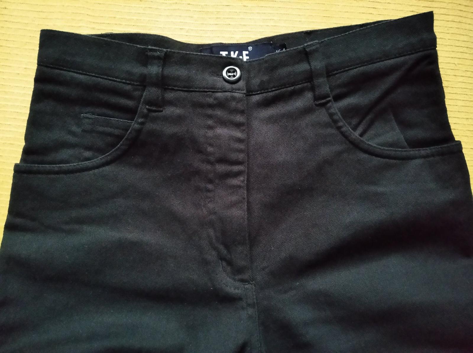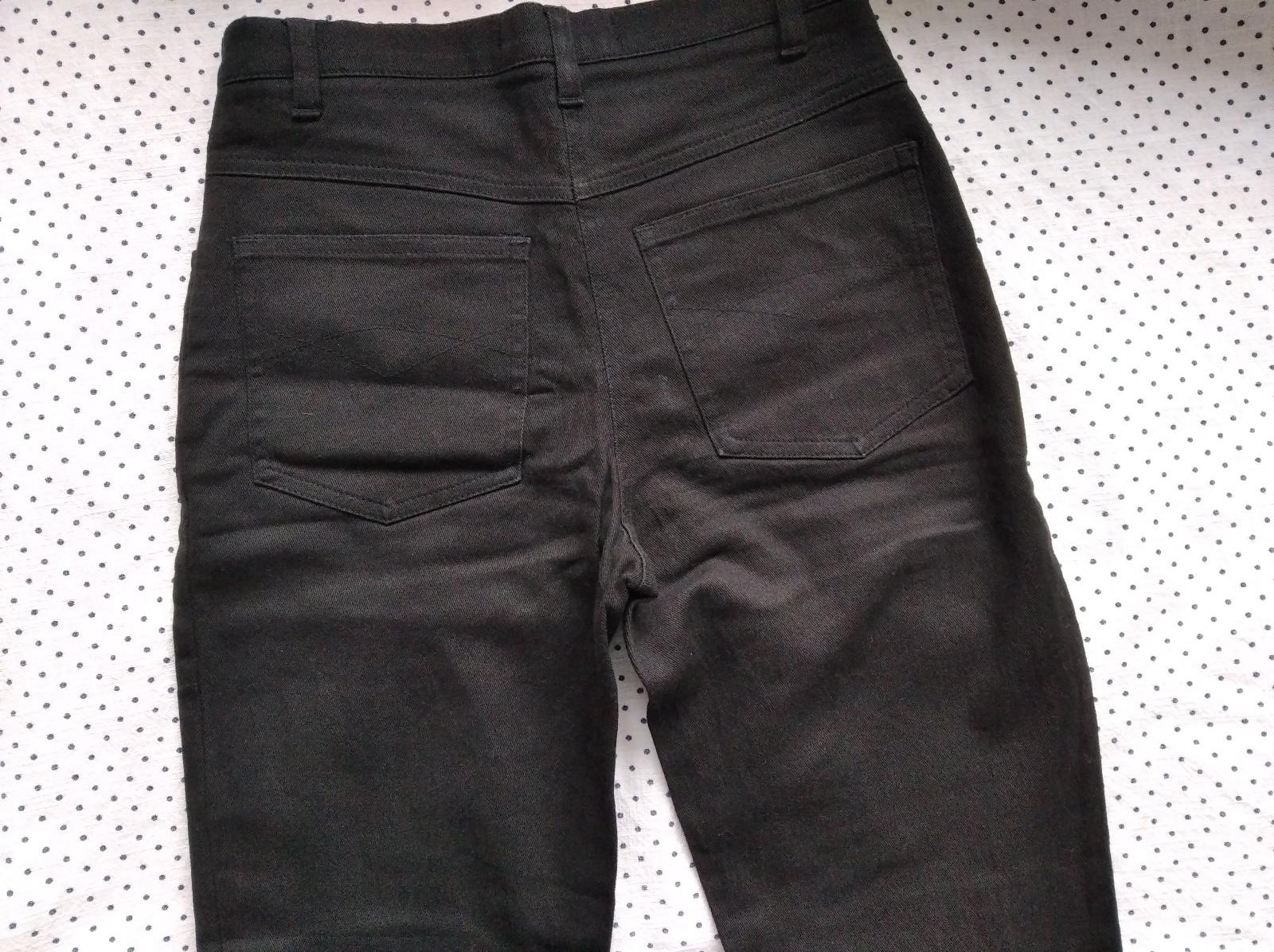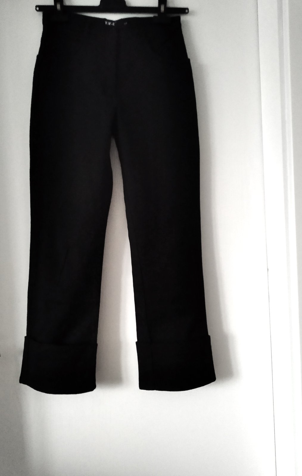 Kvalitné čierne nohavice s vyvýšeným pásom, skrátený strih, efektne vyhrnuté, bezchybné, nevyšedivené.