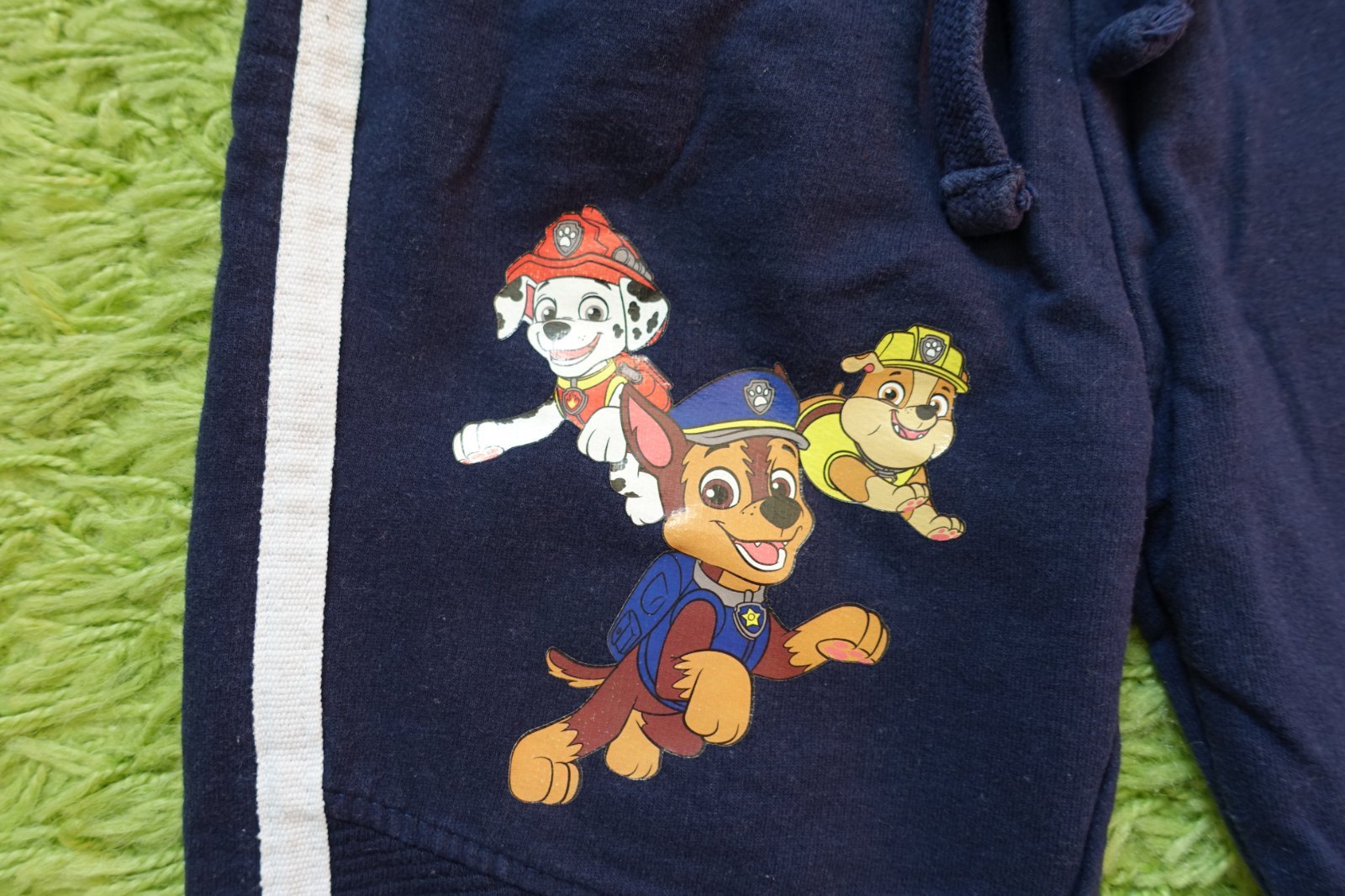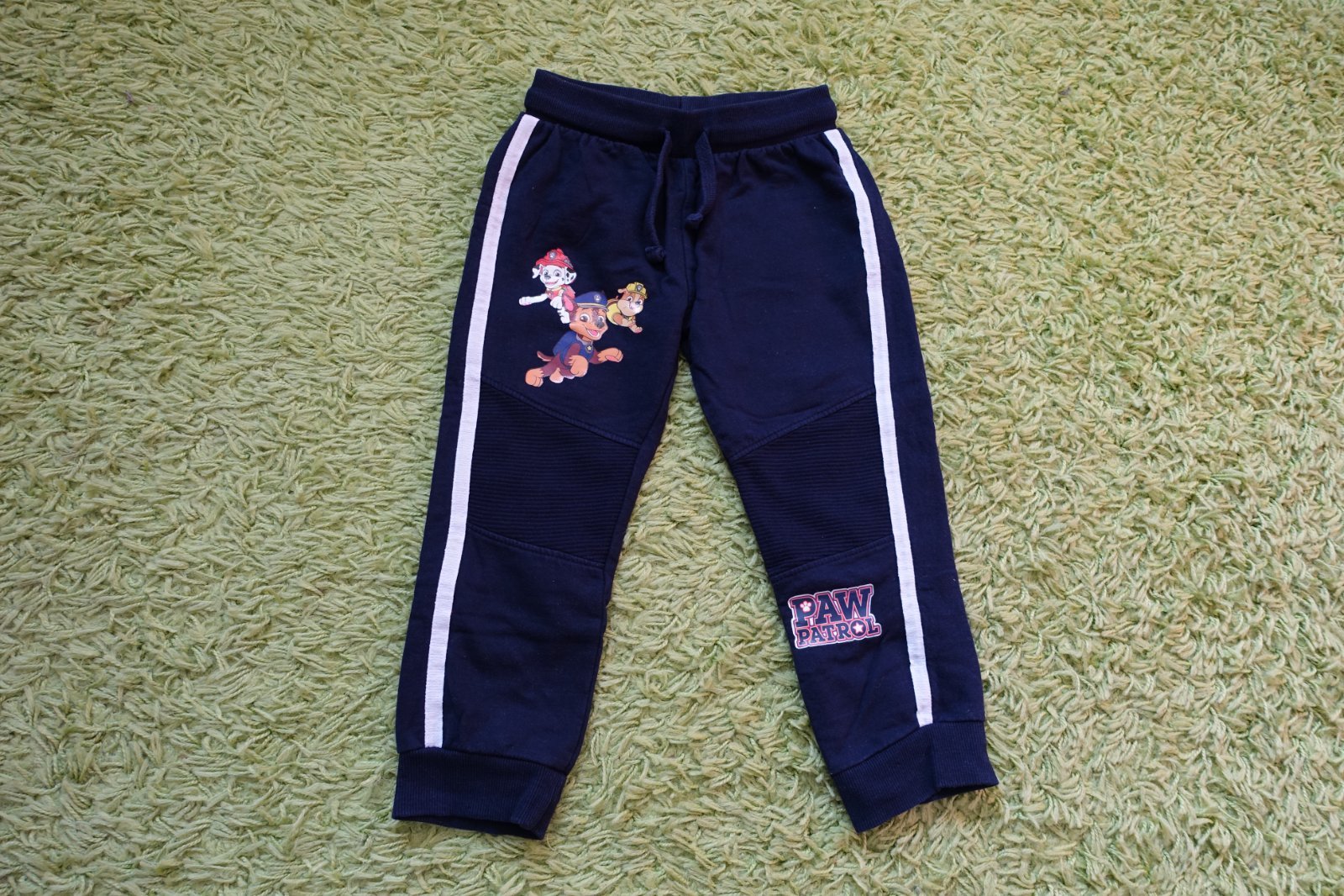 Predám krásne bavlnené tepláčiky s tlapkami. Štítok som žiaľ odstrihla, riaďte sa prosím mierami. Nám sedeli vo veľkosti 104. Boli nosené na striedačku aj s inými, ale sú v peknom nosenom stave. Je už vidno chĺpoček z prania ale len pri naklonení, iba začínajúci, ale nie sú ešte extra žmolkavé. Donosiť sa určite ešte dajú. Preto sú vhodné už len pre nenáročnú mamičku. Boli naše obľúbené. Celková dĺžka je 56 cm a šírka pásu v kľude je 23 cm. Nemajú vrecká, šnúrka sa dá plne zatiahnuť. (V10)