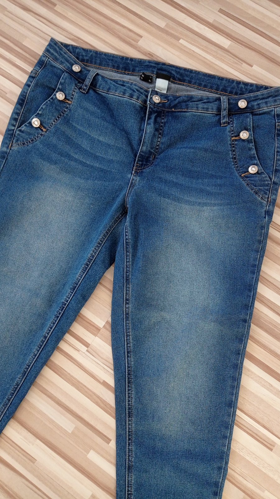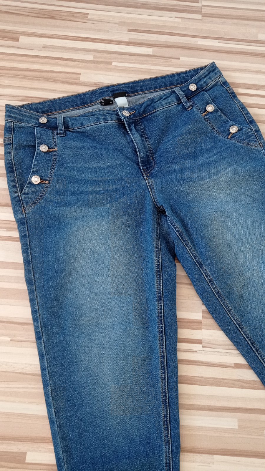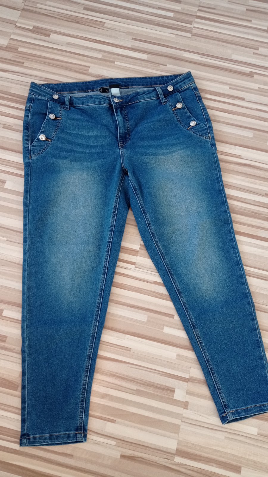 Predám krásne štýlové elastické rifle veľkosť 46, štýlové gombíky dodávajú super efekt, elastické poddajne, výborne na nosenie, funkčné vrecká vpredu i vzadu, bez poškodení, top stav