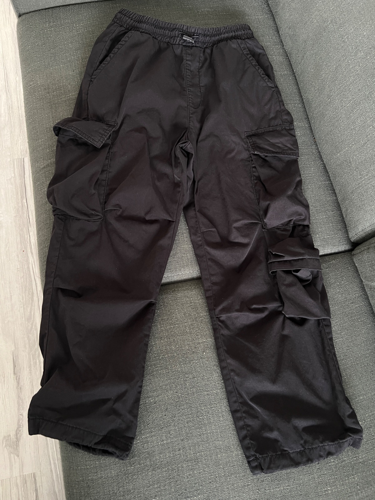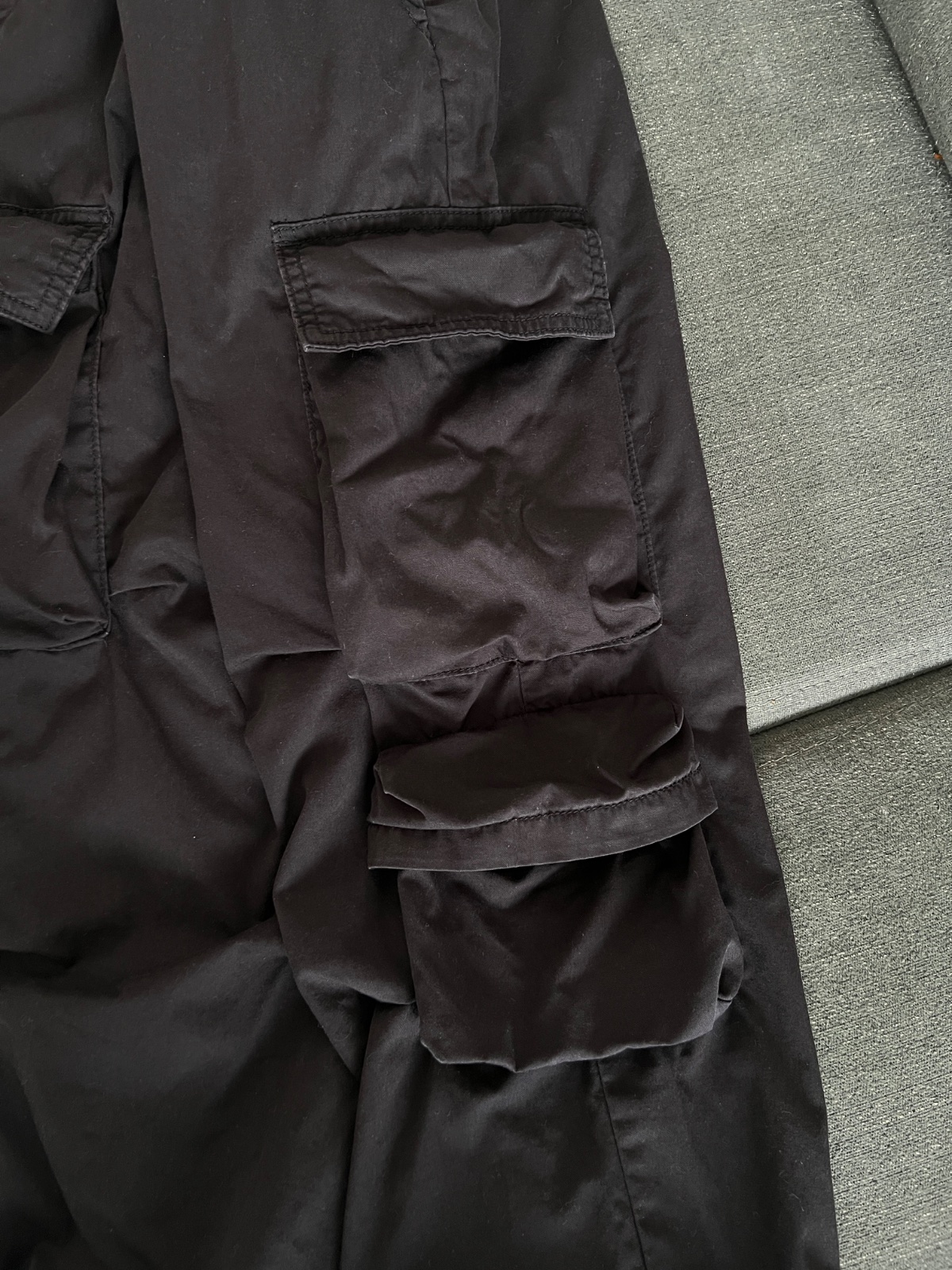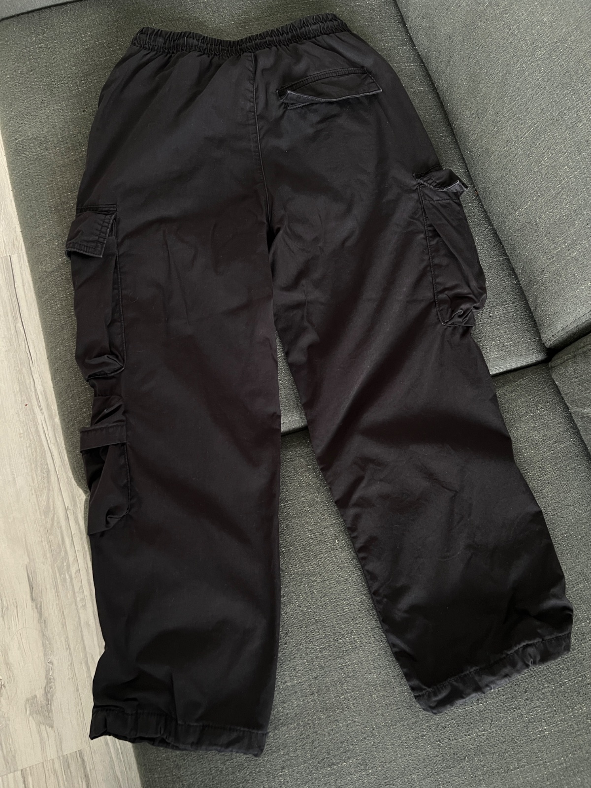 Strih a detaily: Nohavice majú praktické nakladné vrecká na stehnách. V páse je guma plus sťahovacia šnúrka s brzdičkou pre dokonalé prispôsobenie. Spodná časť nohavíc má integrované gumičky, takže sa dajú stiahnuť a nosiť ako "joggers" alebo nechať voľné.