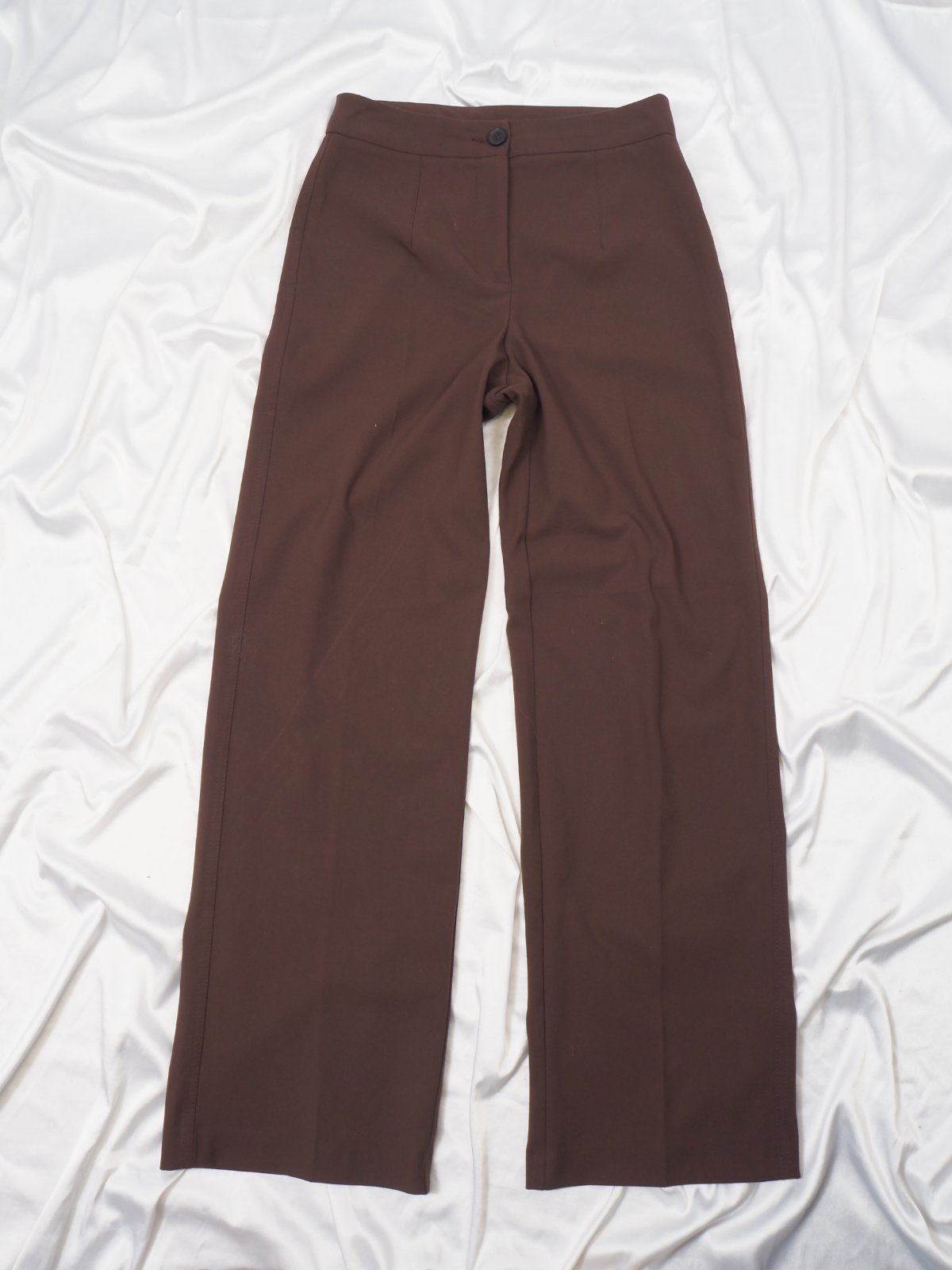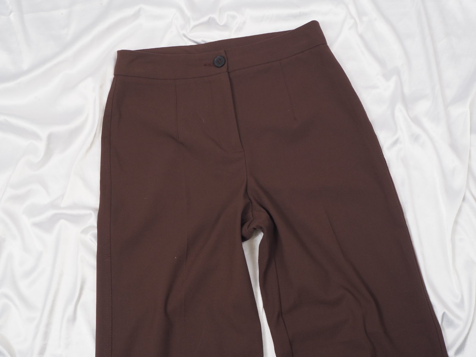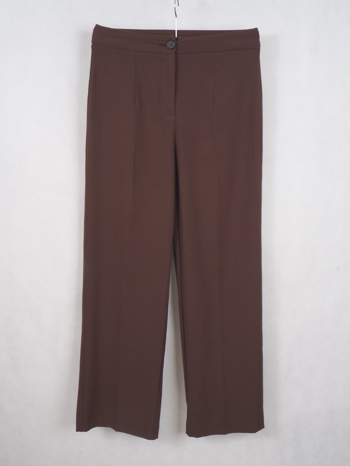 Kvalitné elegantné nohavice tmavohnedej farby, rovný strih, materiál 63% polyester, 32% viskóza, 5% elastan, super stav.