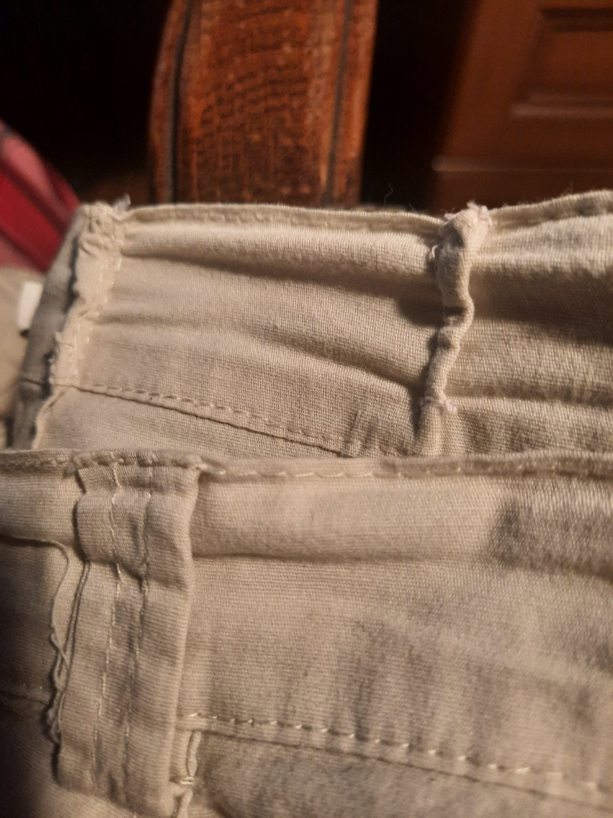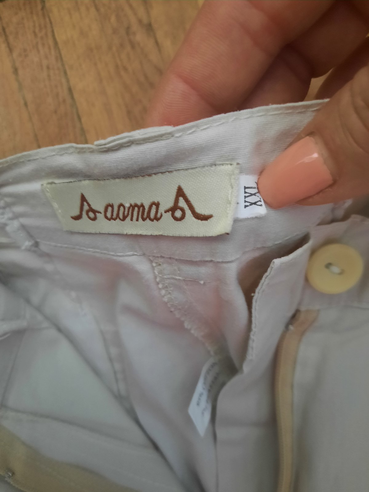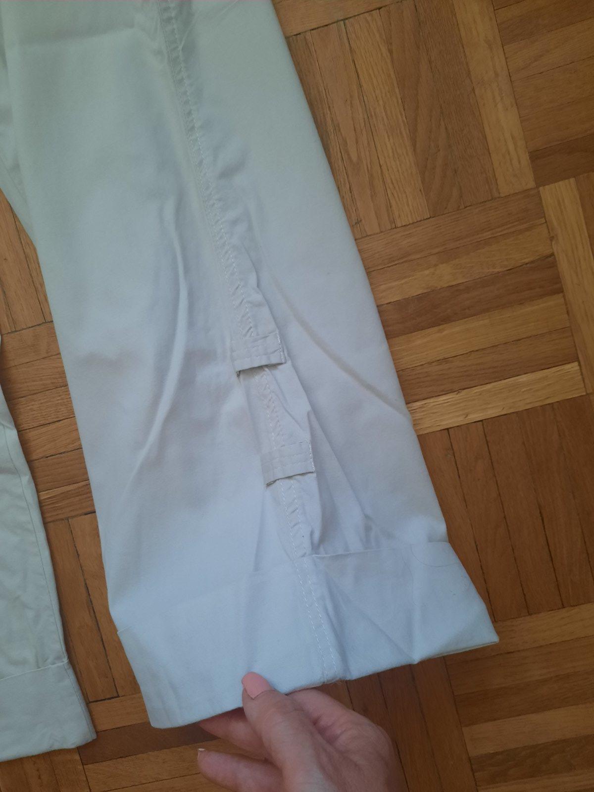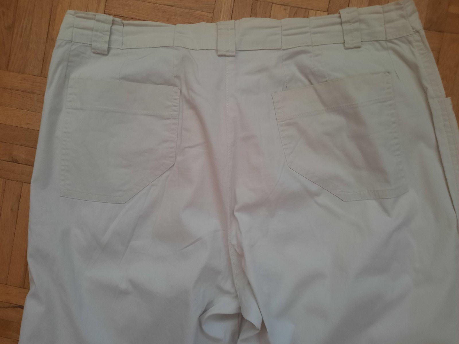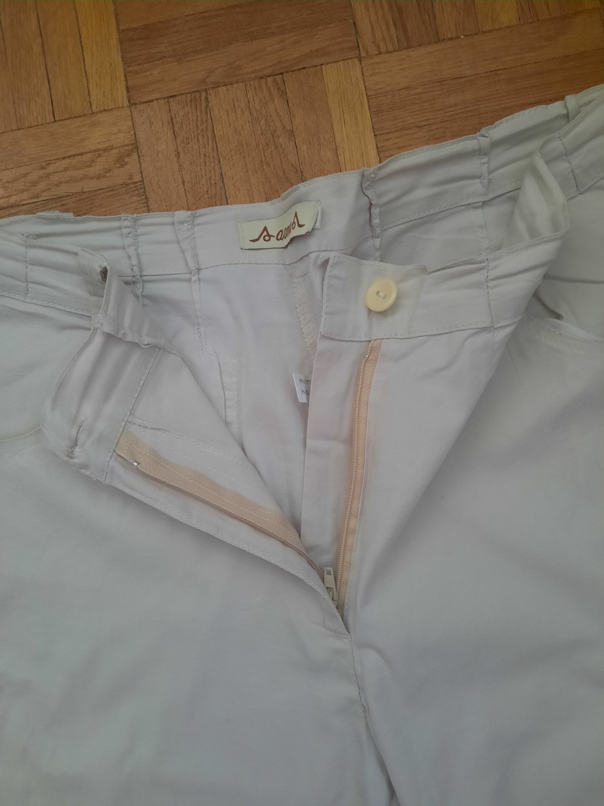 Super vzdušné nohavice jemne béžovej farby. Dĺžka je cca.7/8-ová. Veľmi dobrý stav, mierne aj elastické. Vačky sú vpredu aj vzadu. Na sáre dole je manžeta. Pás je ručne zúžený- stačí rozpárať.