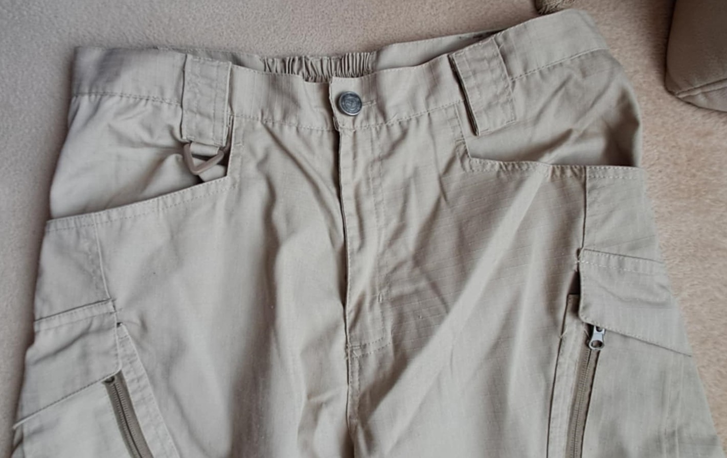 Letné nohavice waterproof - vodotesné- neviem neboli odskúšané do dažďa. materiál 65 = polyester, 35 % bavlna. Veľmi zaujímavý strih- až 7 vreciek, vzadu v páse guma, dĺžka vzadu 2 cm dlhšia ako vpredu.