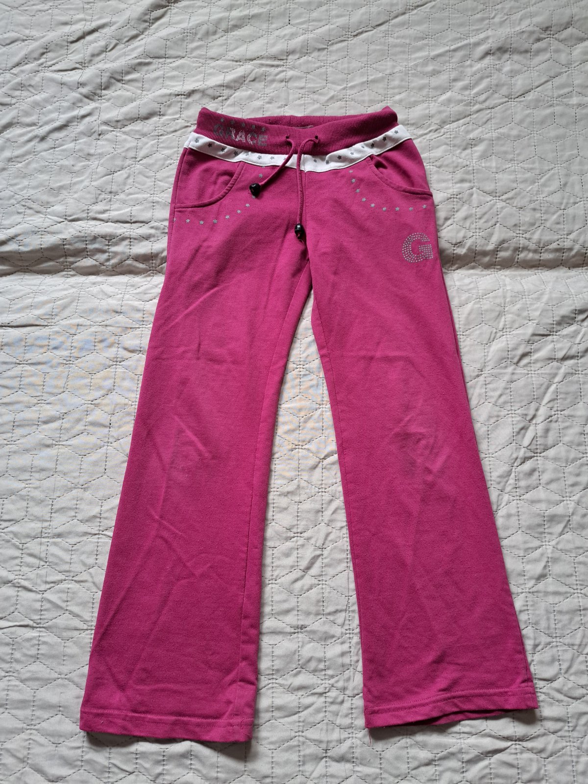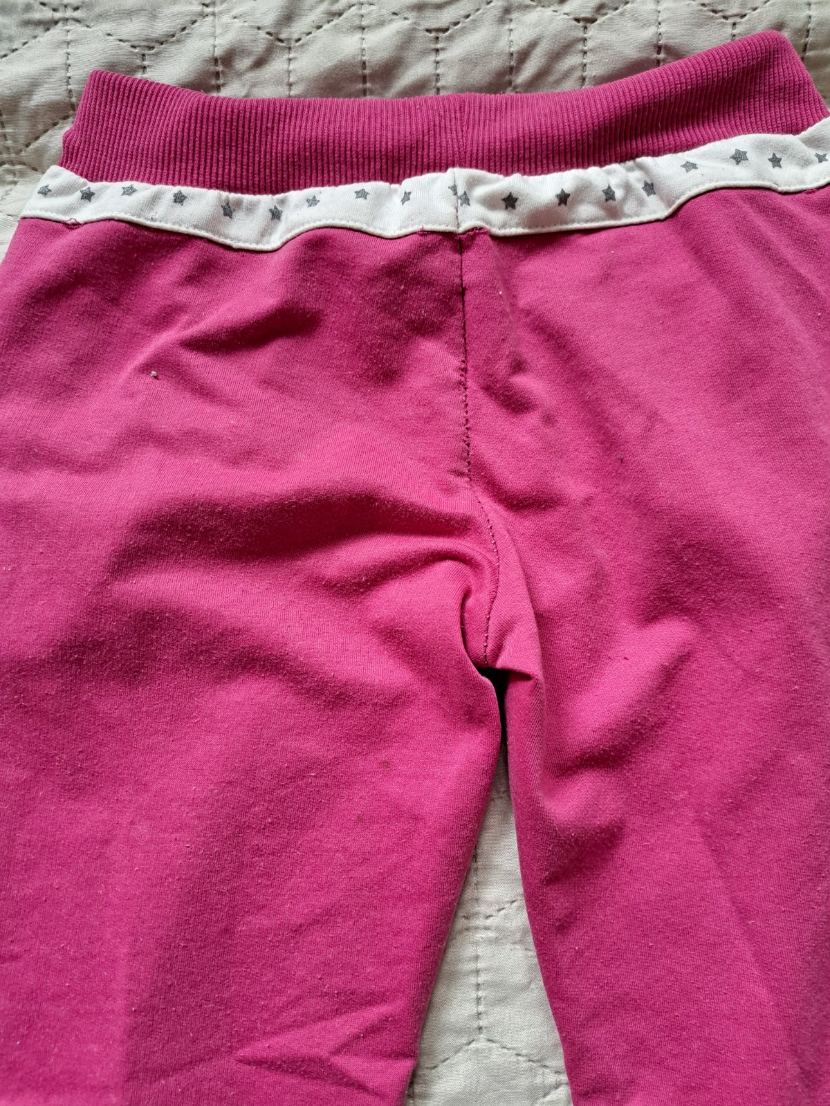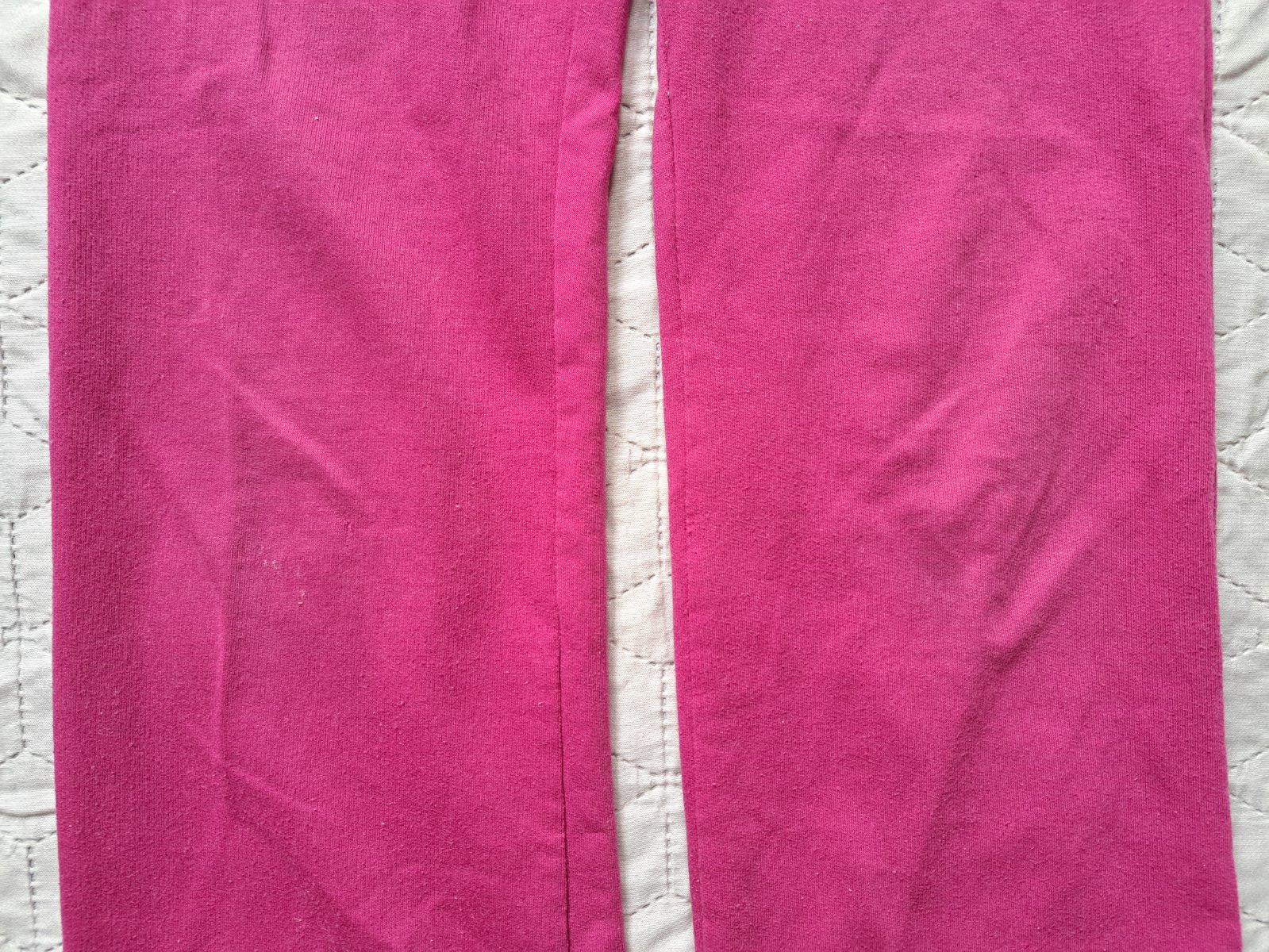 Dievčenské tepláky- majú jemné žmolky a na kolenách jemne šuchnuté. Farba je bordovo- ružová. Majú aj vačky. Váha: 207 gr. D- 78 cm ŠP- 26,5-31x2 cm