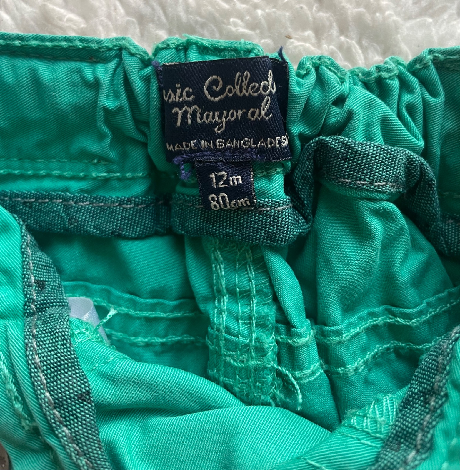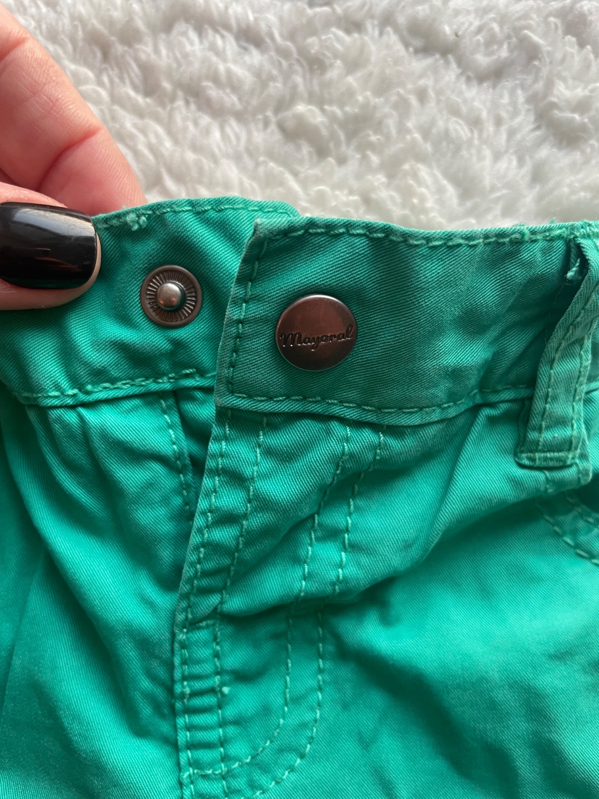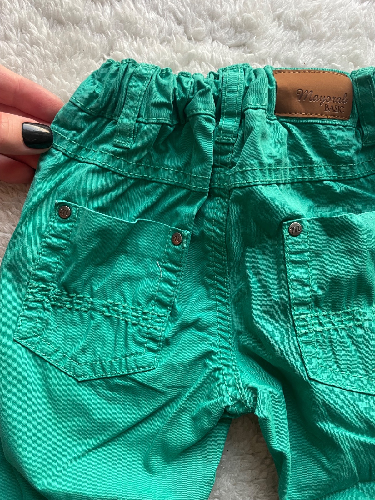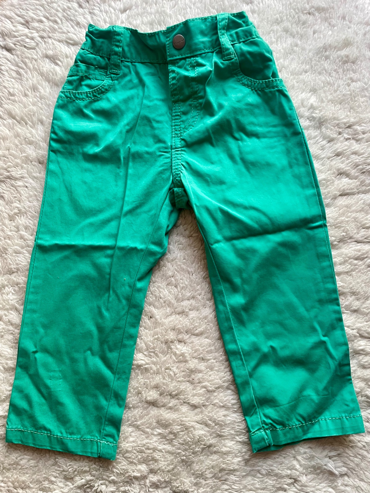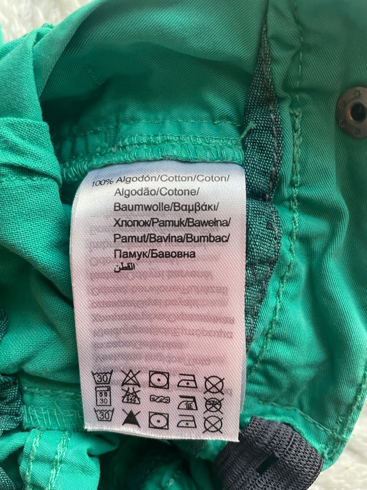 Ziarivo tyrkysove nohavice tenkej latky s prednymi i zadnymi vreckami, zapinanie na cvok, na pase vsita guma, vnutri zmensovacia gumicka, velkost 80, neposkodene, cakaju na sibaca :)