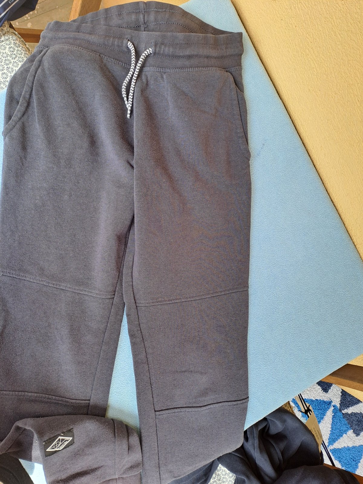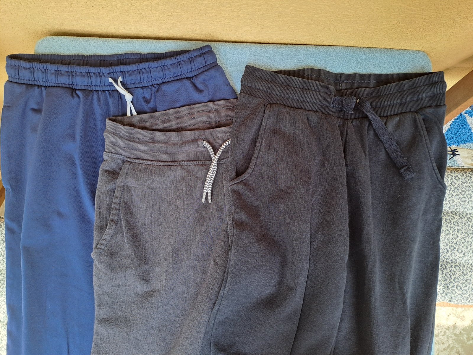 Tepláky všetky modrej farby. Z Decathlonu a z lidla. Všetky v dobrom nosenom stave s malými zmolkami. Nepoškodené ale mierne vidiet pranie.