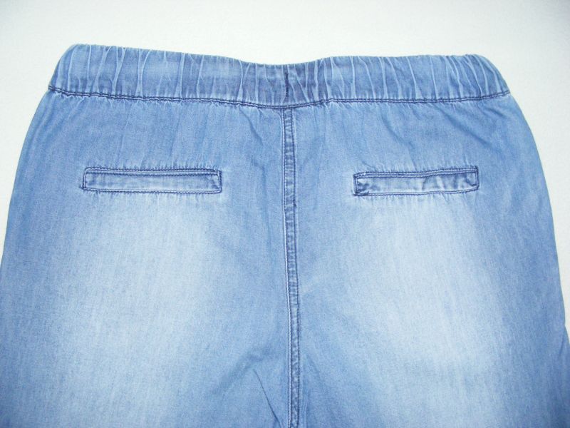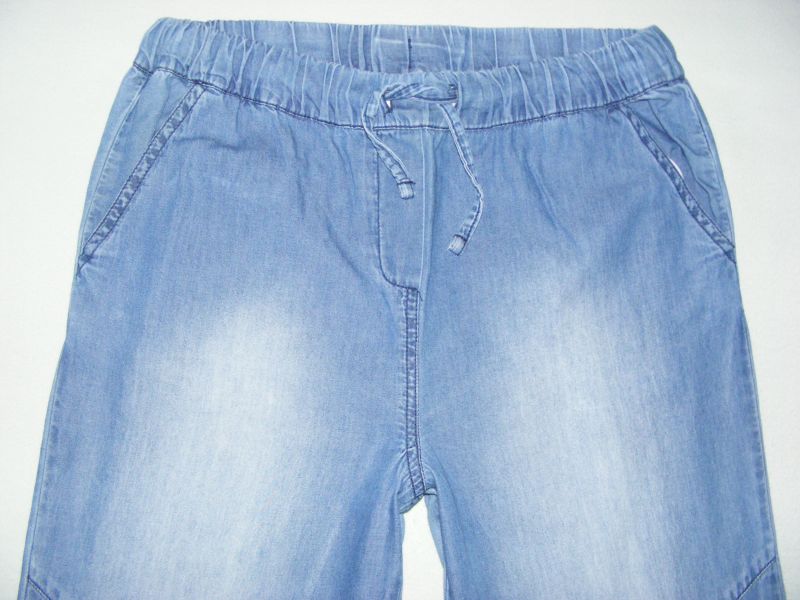 Tenké rifľové nohavice zn. Yigga, pás na gumu + funkčná šnúrka, dolu do gumy, bočné funkčné vrecká. Materiál 100% bavlna.