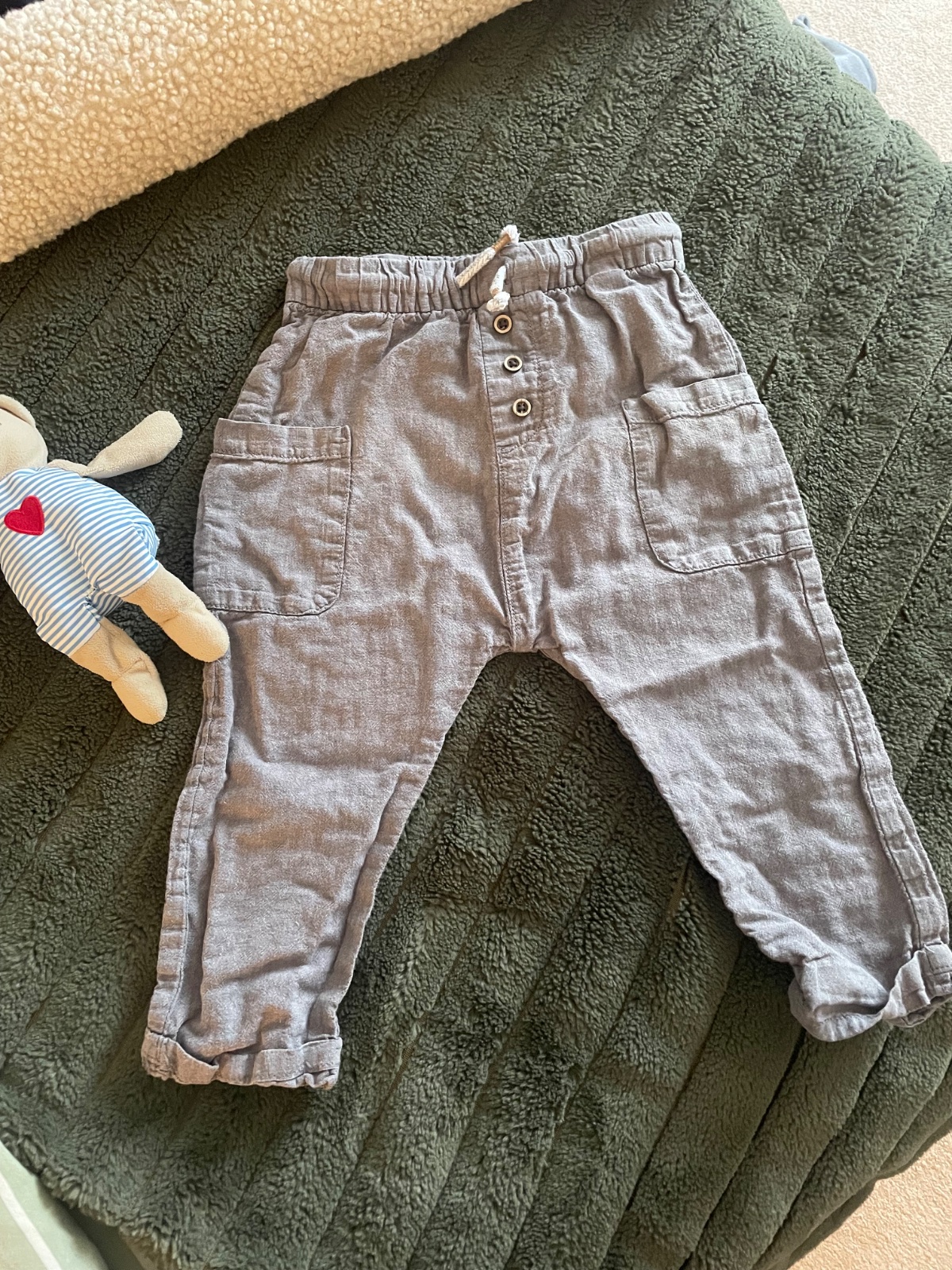 Chlapčenské letné bavlnené nohavice, sú v super stave, nosili sme veľmi málo, ale majú jeden malý fliačik dolu na pravej nohe (viď foto). Inak nemajú žiadne iné poškodenia. V páse majú reguláciu. C...