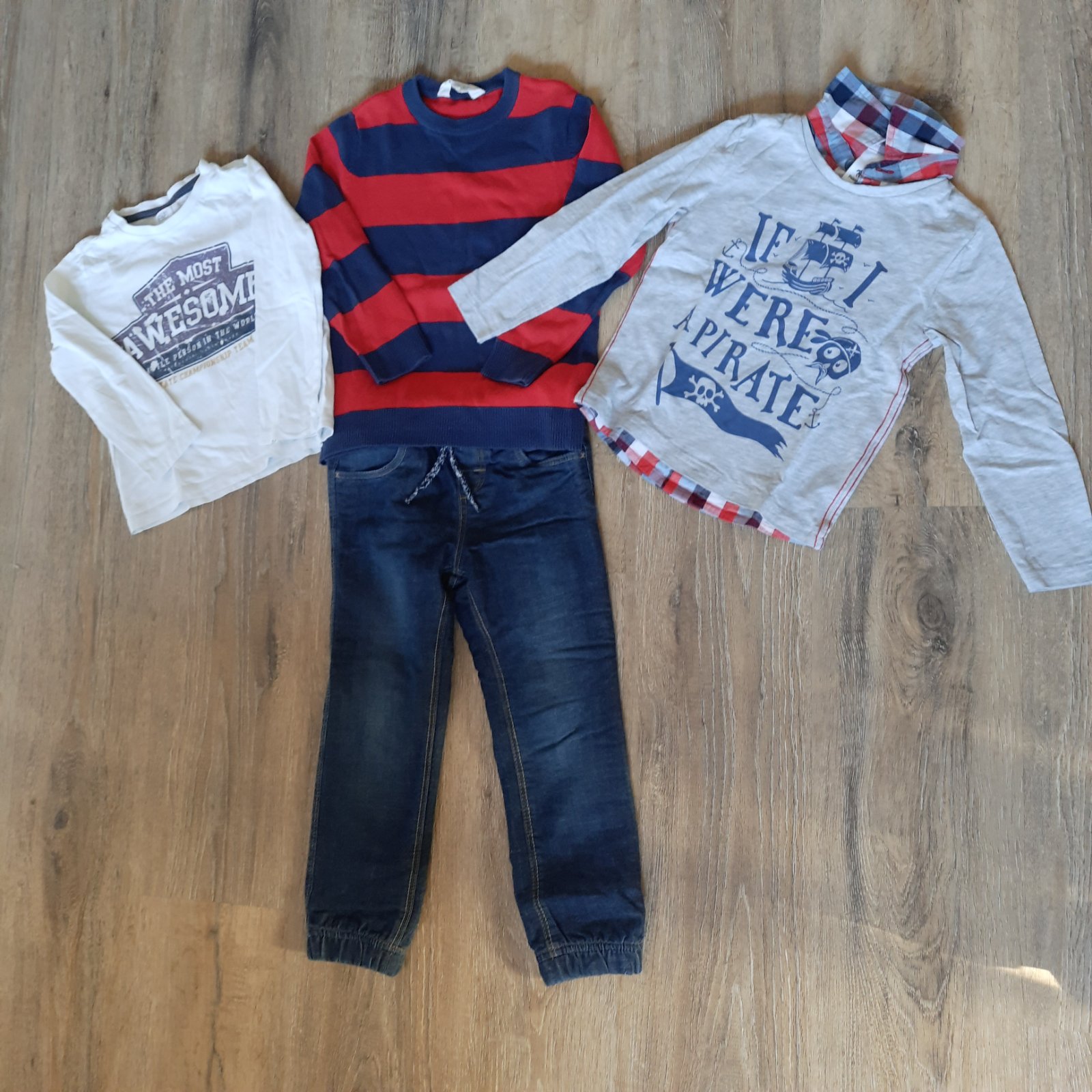 Nové, nenosené nohavic, rifle, kapsáče. 1. Svetlohnedé nohavice (obr. 2-3) - veľkosť 104 - pevnejšieho materiálu. Nezateplené. Vhodné na bežné nosenie aj na "príležitosť" (tá naša sa nakoniec nekon...