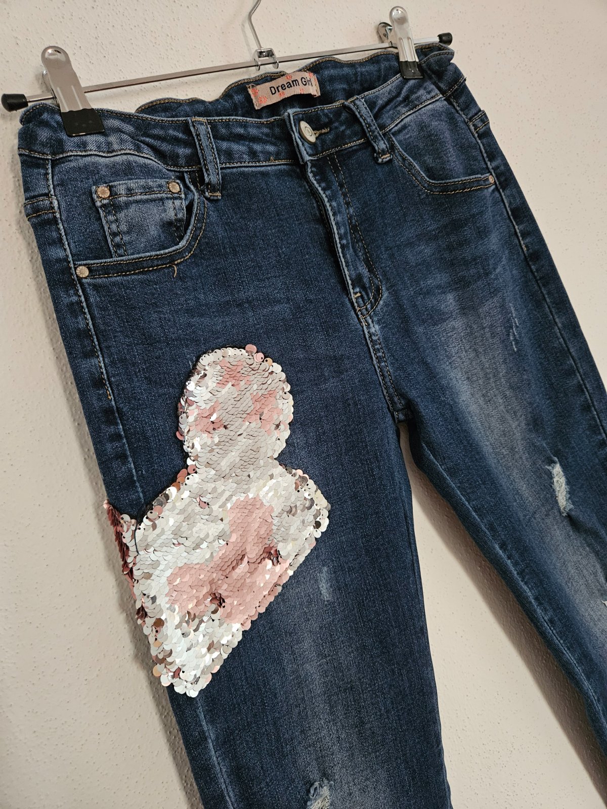 Dream Girl perfektné rifle/džínsy, v páse pružná posuvná gumka s reguláciou, vrecká vpredu aj vzadu, potrhaný vzhľad, na pravom stehne preklápacie flitre Mickeyho hlava. Perfektný stav, veľ. 16 yrs