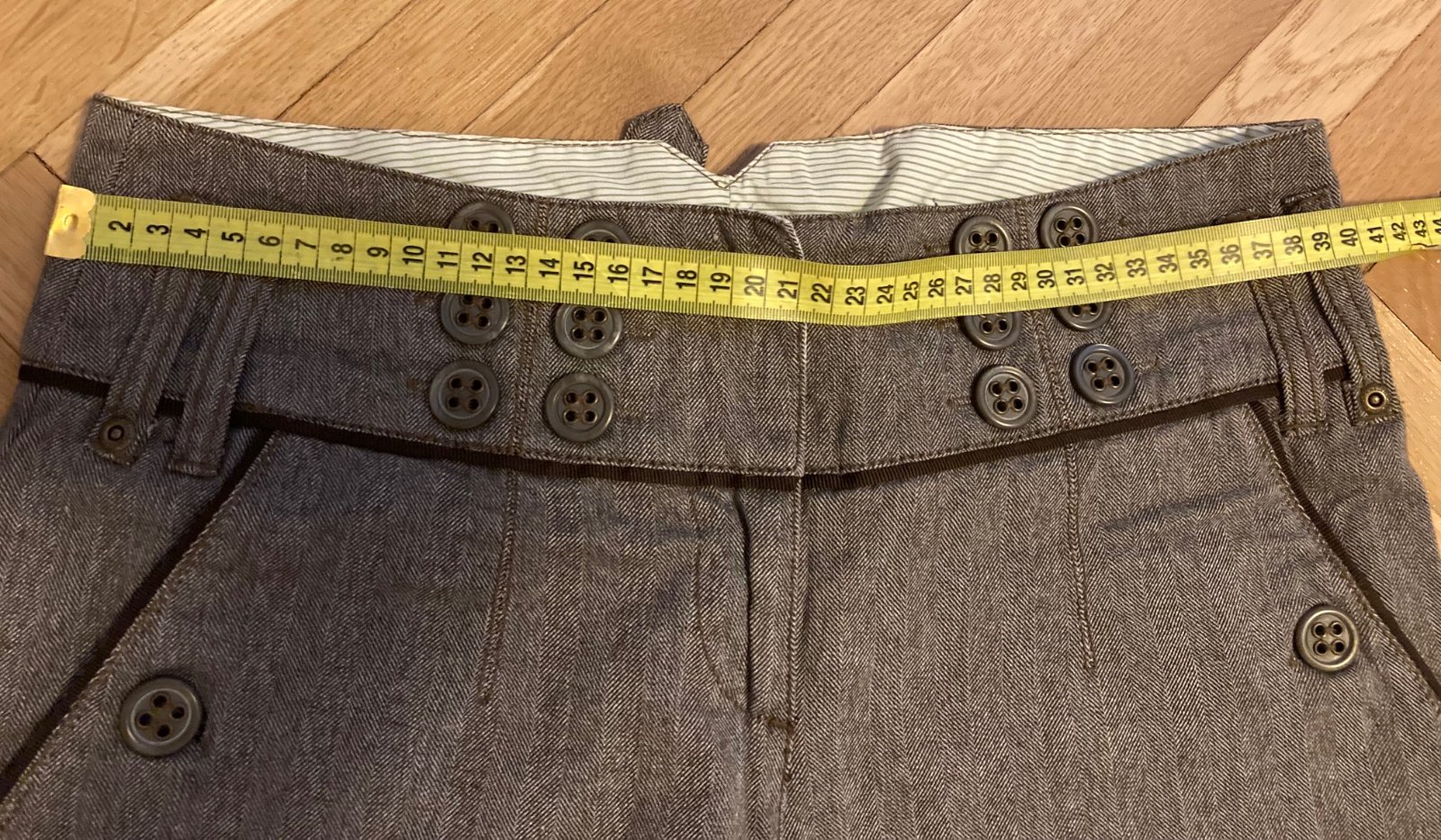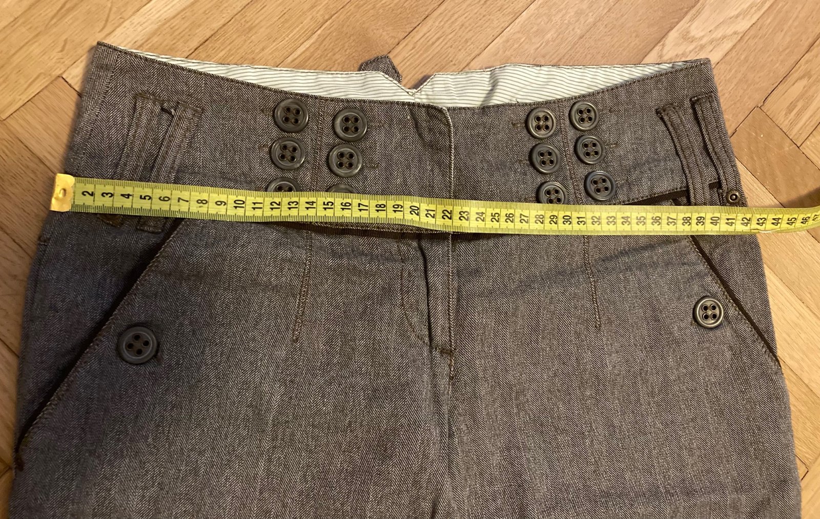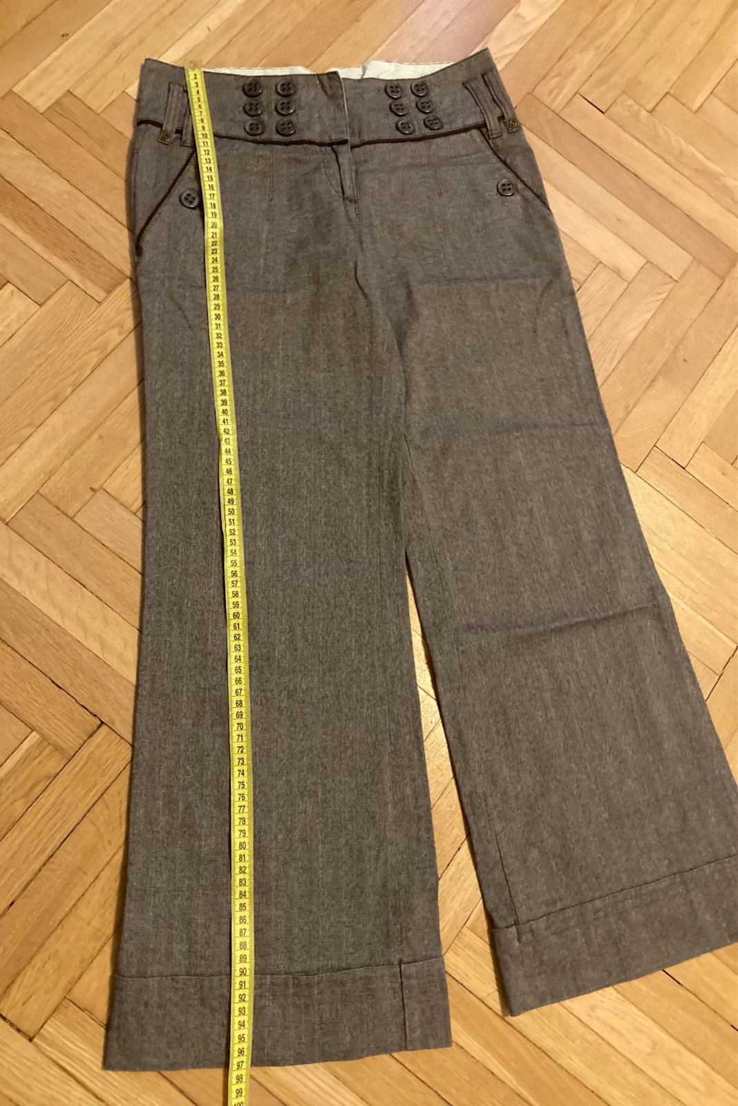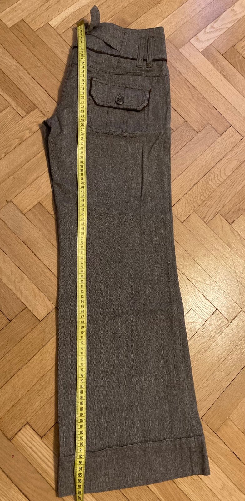 Nohavice NEXT - dole široké, veľ 8 - sedí na XS - M, veľmi kvalitný materiál, farba sivo hnedá - v páse pútka, v zadu pracka - je možné prispôsobiť pás - ako nové - ozvi sa, zmerám :)