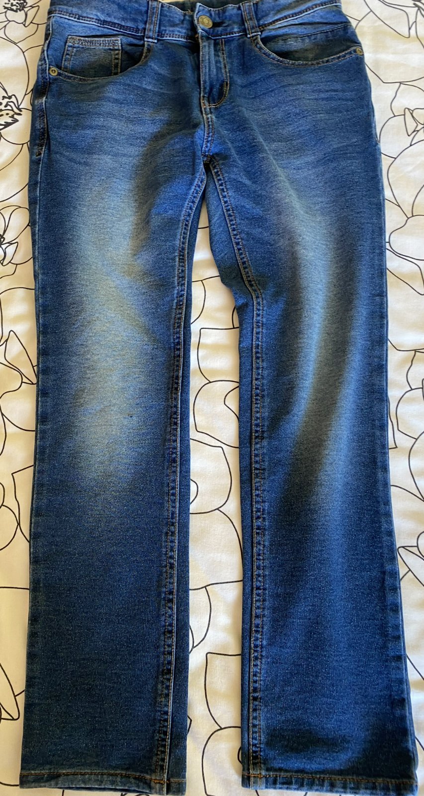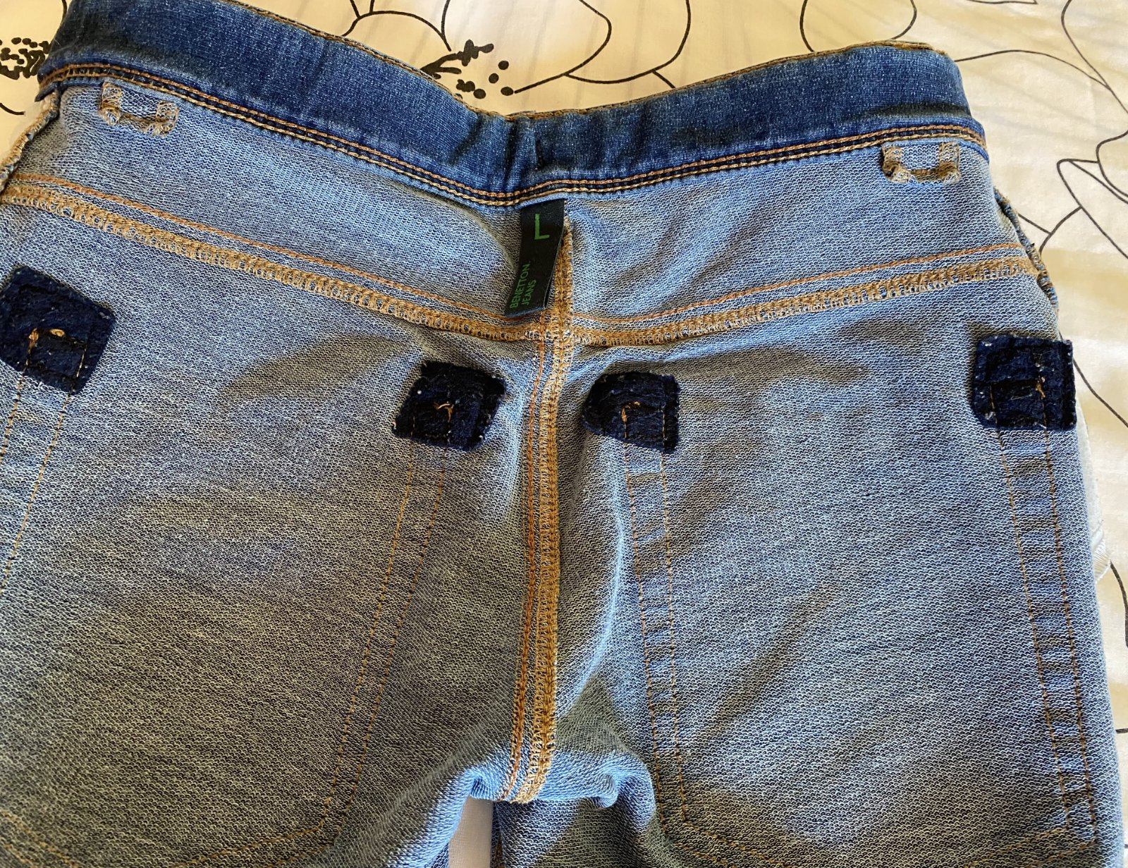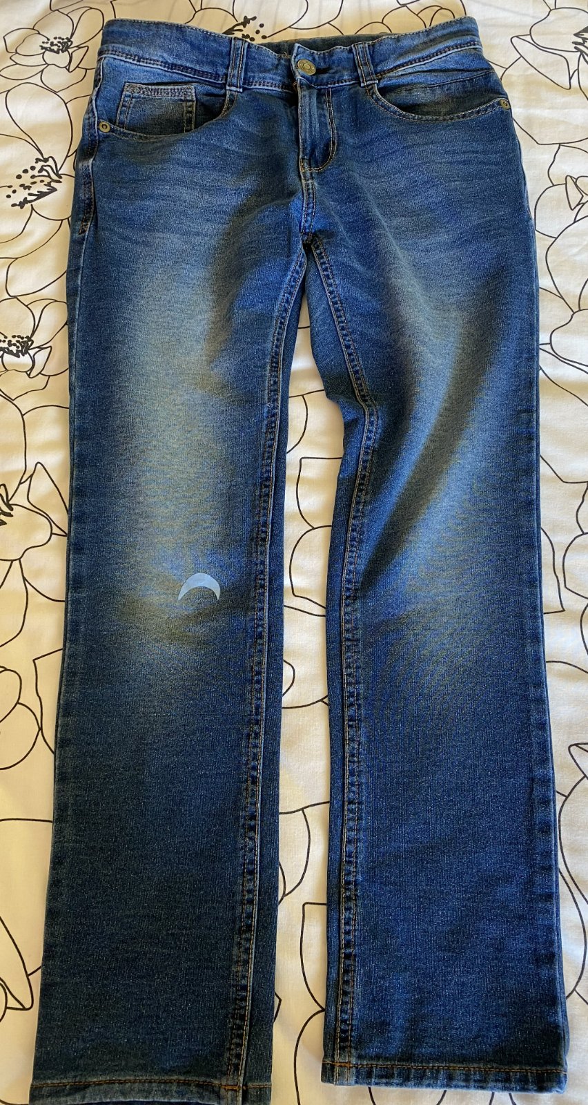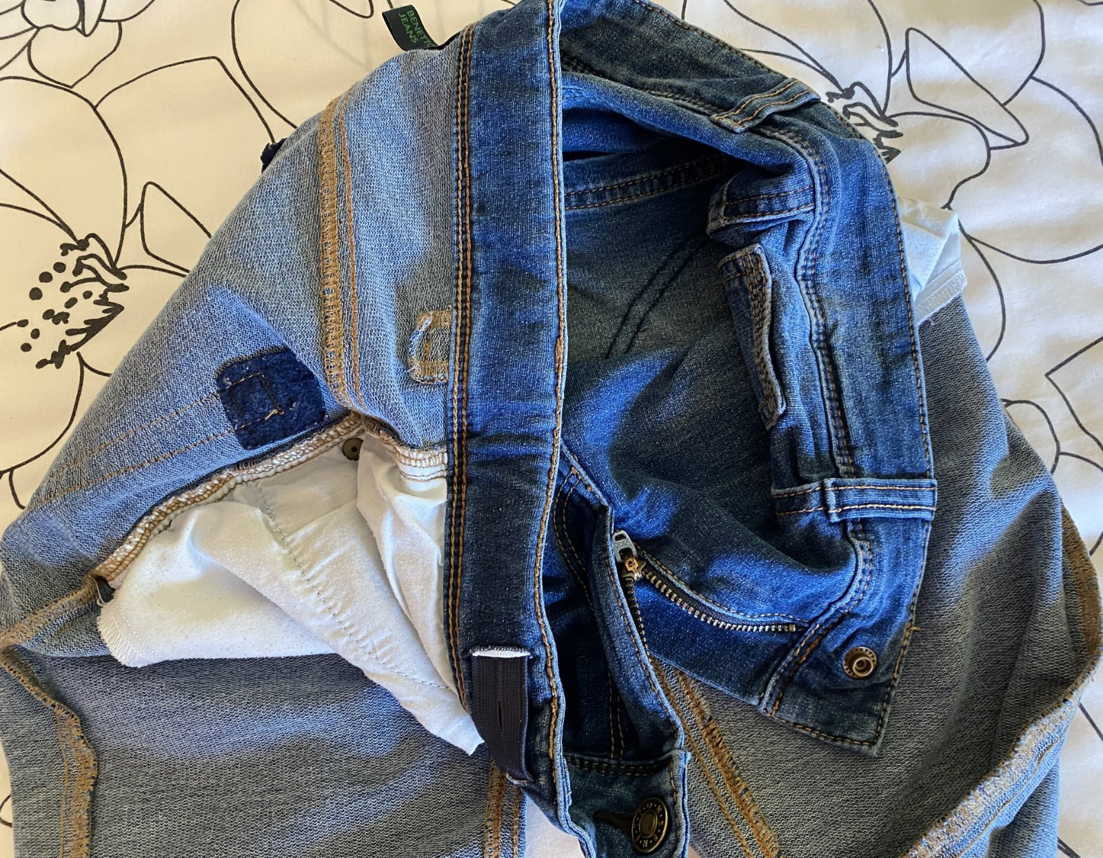 Elastické šúchané nohavice riflového vzhľadu Benetton, písaná v. L - detská - v. 140/146, kvalitne prepracované, kopa funkčných detailov (viď detail. foto), materiál 86% bavlna, 11% polyester, 3% elastan - materiál je hrubší, nie tenký, mäkký, príjemný na nosenie, málo nosené, vo veľmi dobrom stave - mal chybičku krásy - malá dieročka, opravené vodoodolnou páskou - mesiačik - viď fofo. Miery: vonkajšia dĺžka: 80cm, vnútorná po sed: 60cm, pás v kľude: 33cmx2 - dá sa regulovať.