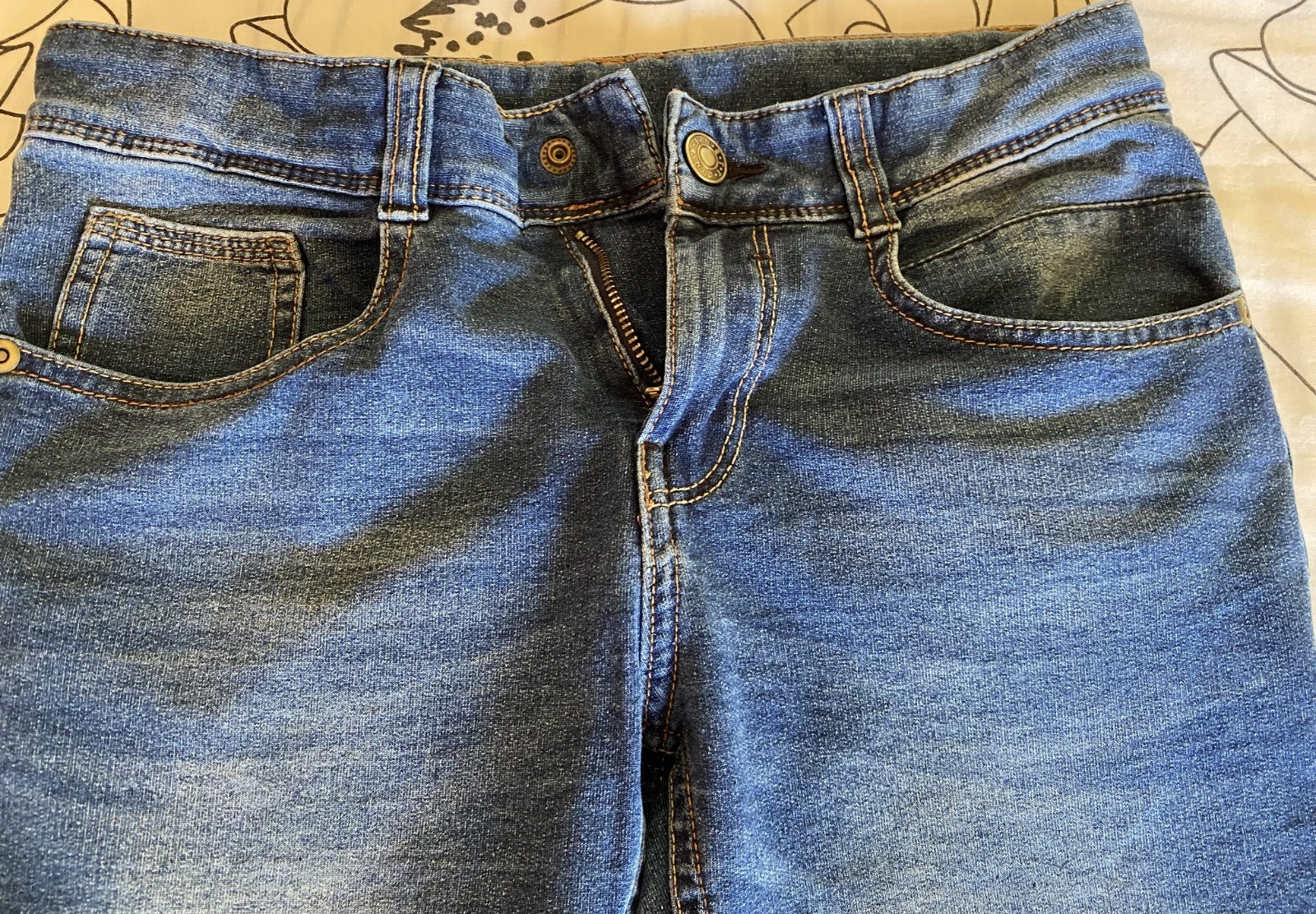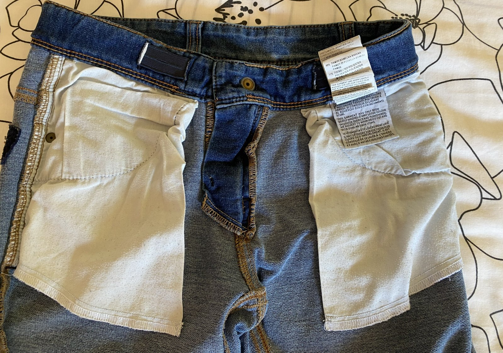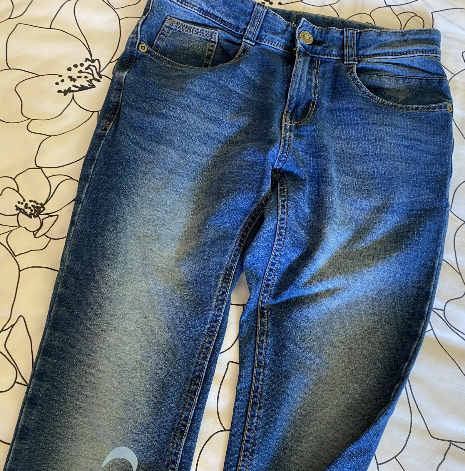 Elastické šúchané nohavice riflového vzhľadu Benetton, písaná v. L - detská - v. 140/146, kvalitne prepracované, kopa funkčných detailov (viď detail. foto), materiál 86% bavlna, 11% polyester, 3% elastan - materiál je hrubší, nie tenký, mäkký, príjemný na nosenie, málo nosené, vo veľmi dobrom stave - mal chybičku krásy - malá dieročka, opravené vodoodolnou páskou - mesiačik - viď fofo. Miery: vonkajšia dĺžka: 80cm, vnútorná po sed: 60cm, pás v kľude: 33cmx2 - dá sa regulovať.