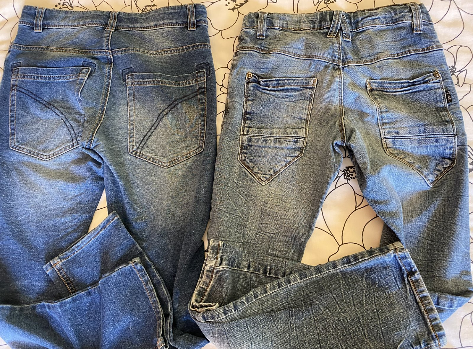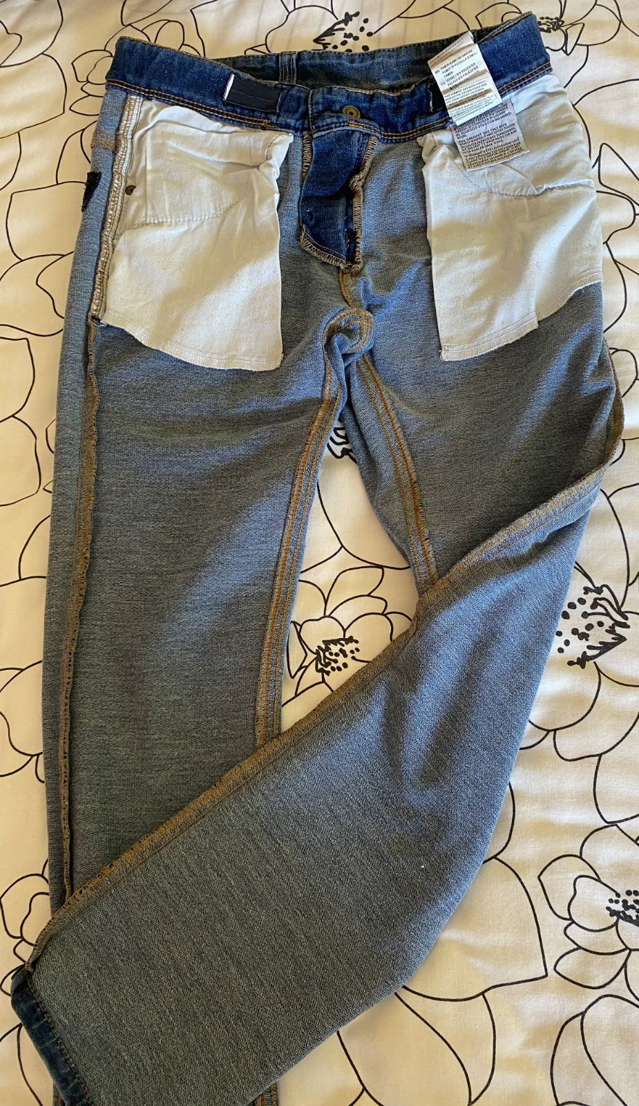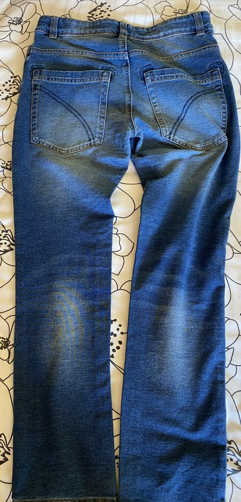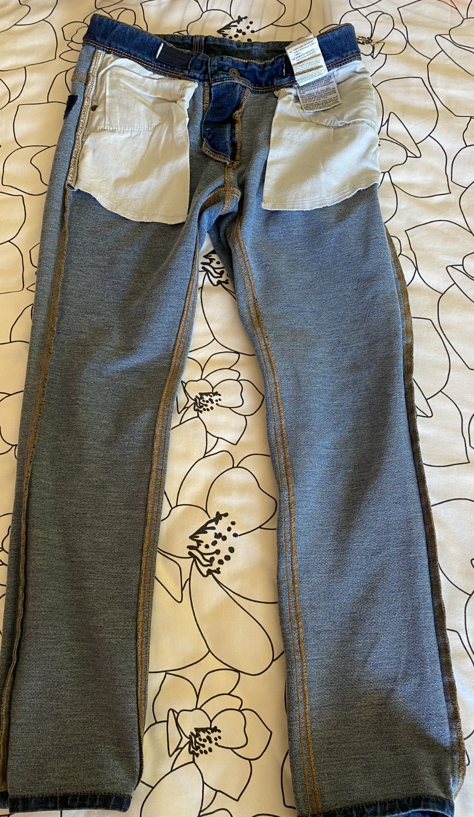 Elastické šúchané nohavice riflového vzhľadu Benetton, písaná v. L - detská - v. 140/146, kvalitne prepracované, kopa funkčných detailov (viď detail. foto), materiál 86% bavlna, 11% polyester, 3% elastan - materiál je hrubší, nie tenký, mäkký, príjemný na nosenie, málo nosené, vo veľmi dobrom stave - mal chybičku krásy - malá dieročka, opravené vodoodolnou páskou - mesiačik - viď fofo. Miery: vonkajšia dĺžka: 80cm, vnútorná po sed: 60cm, pás v kľude: 33cmx2 - dá sa regulovať.