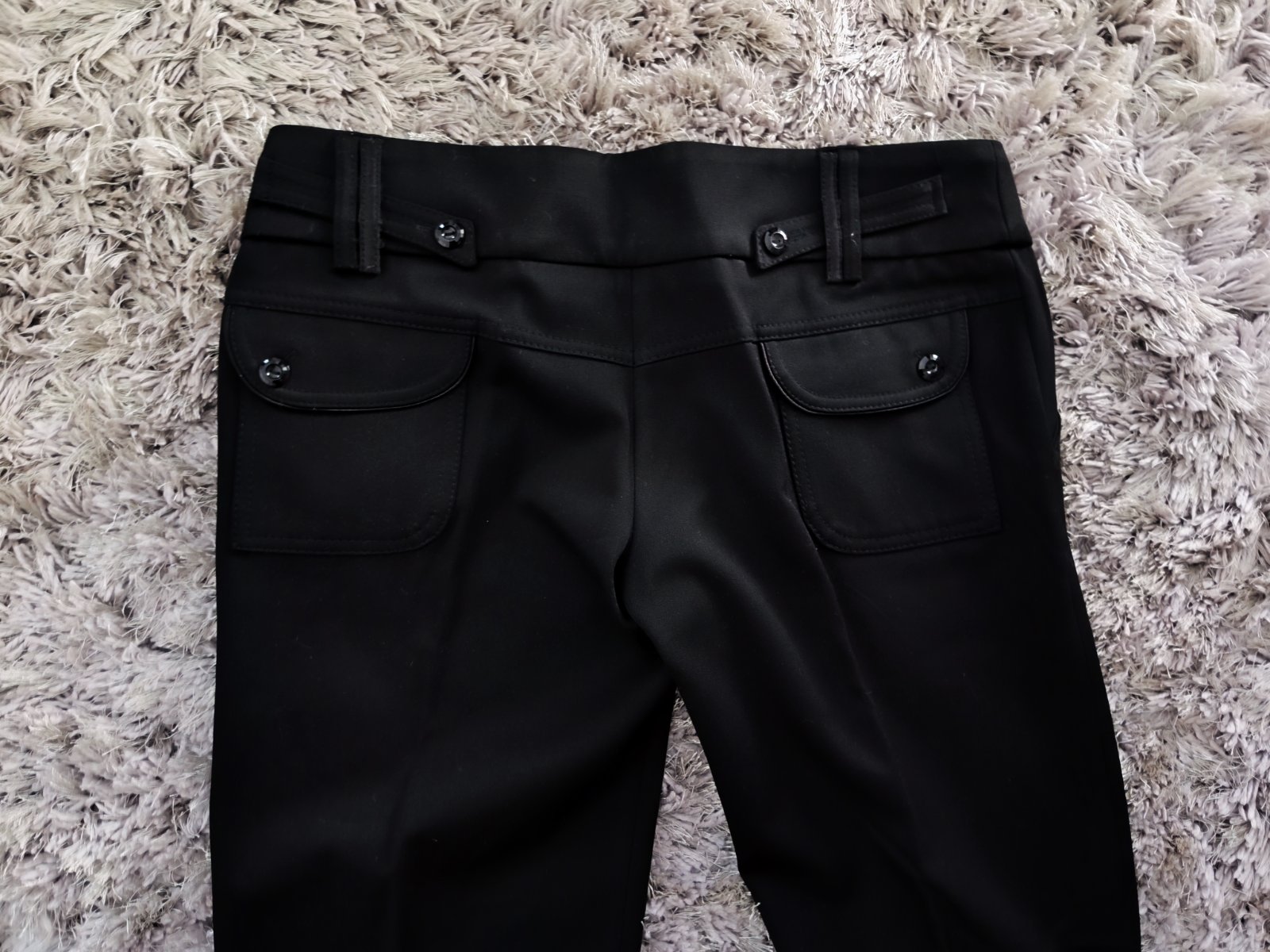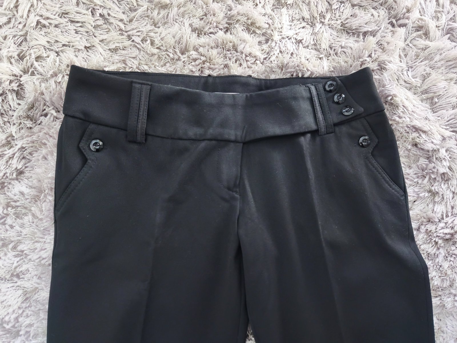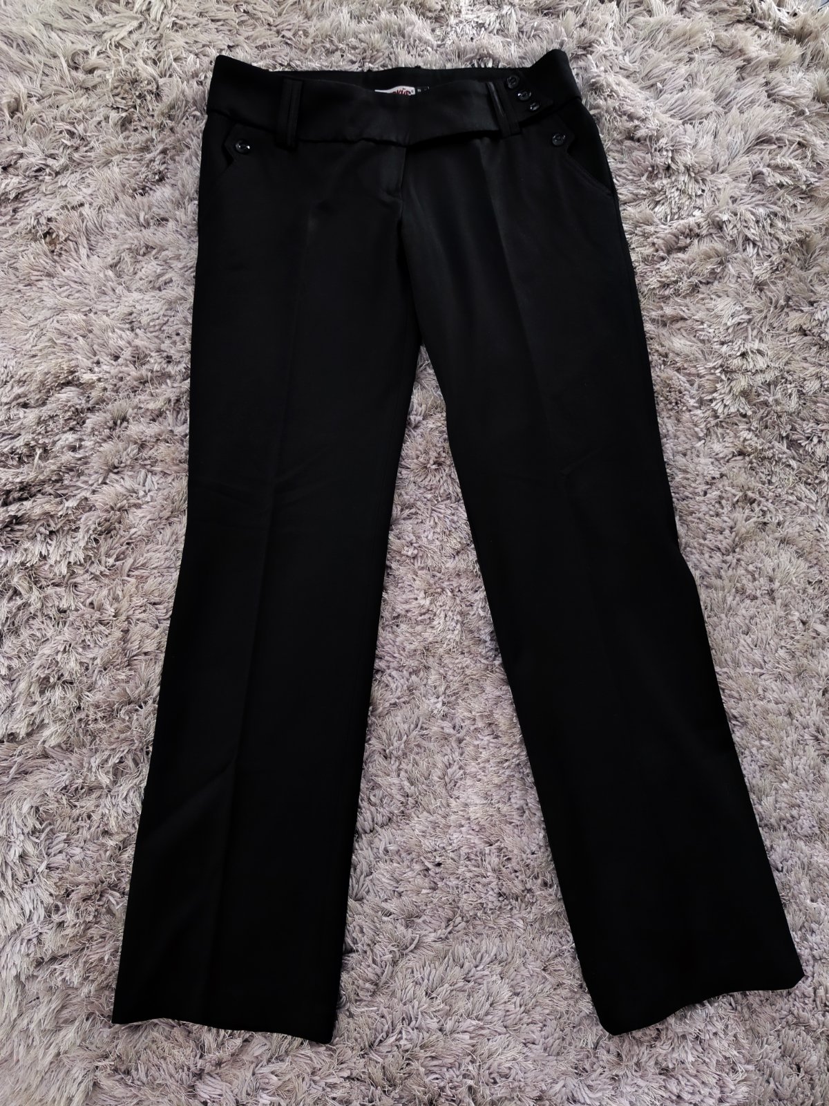 Krásne čierne nohavice úzkeho rovného strihu so širším pásom a zažehlenými pukmi.. Elegantné, mala som na krstinách. Sú nové, iba 1x oblečené. Je to pekný rovný strih elegantných nohavíc s nižším pásom. Veľkosť na nohaviciach XL ale rozhodne sú menšie.