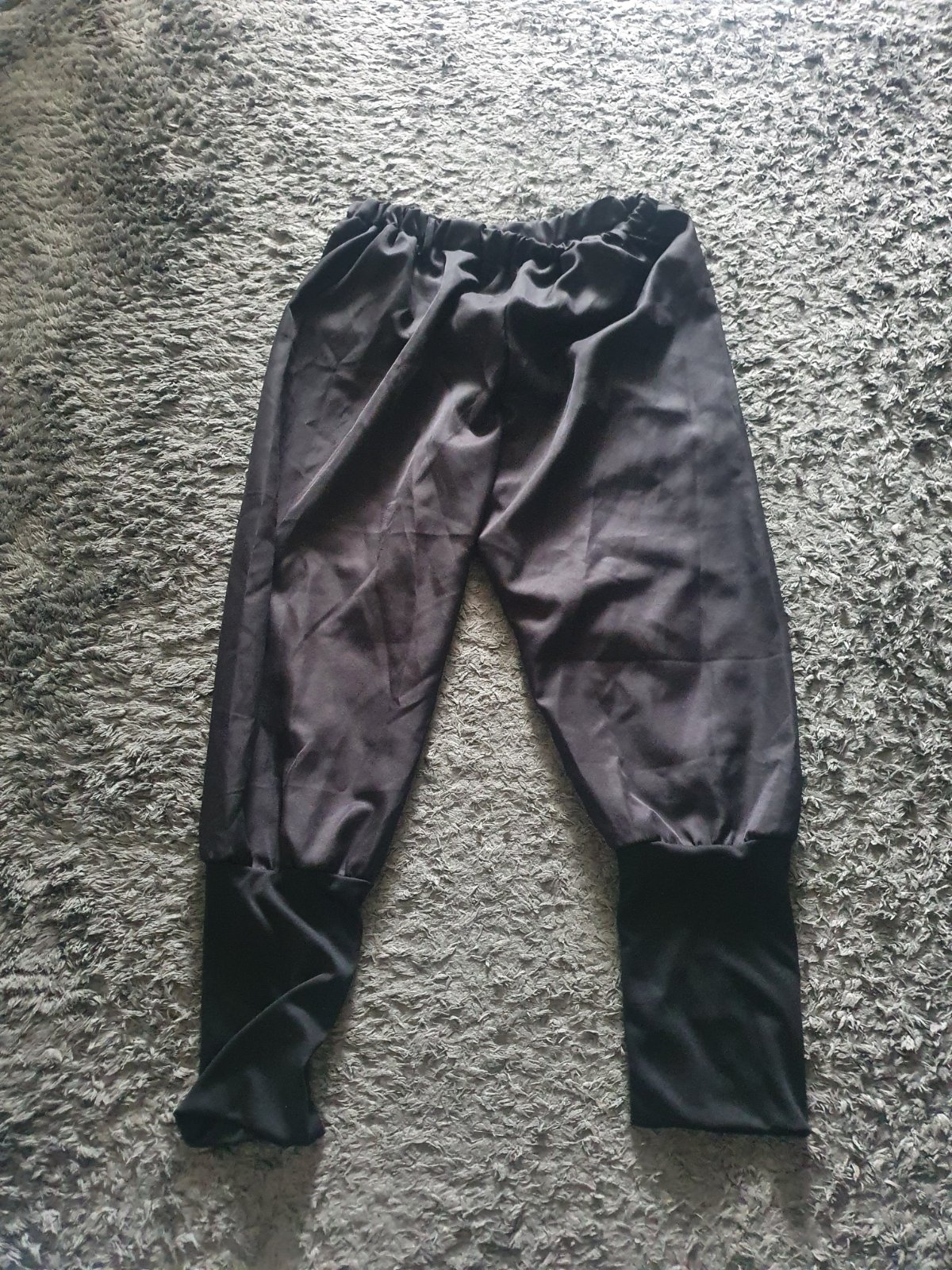Nenosene nohavice dolu mierne rozsirene. V pase je guma a snurka. Dl. 98 cm, od rozkroku 76 cm, pas 70-74 cm.