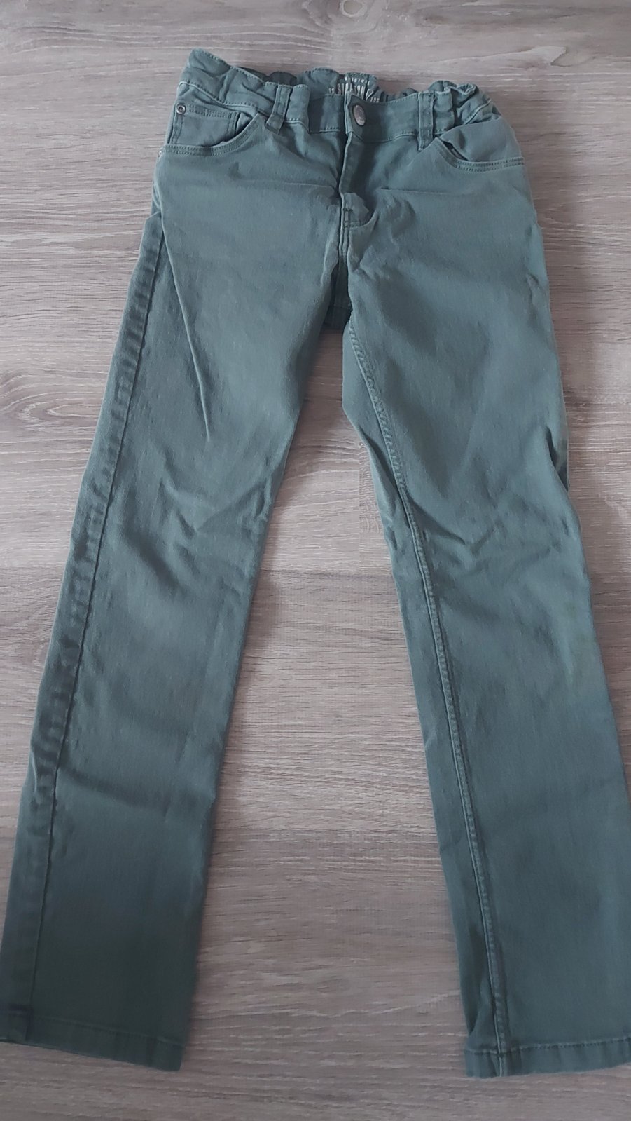 Detské nohavice tmavej zelenej farby. Sú vo veľmi dobrom stave. Veľkosť 134/140. V páse majú gumičku, dajú sa prispôsobiť. Kupované v HM