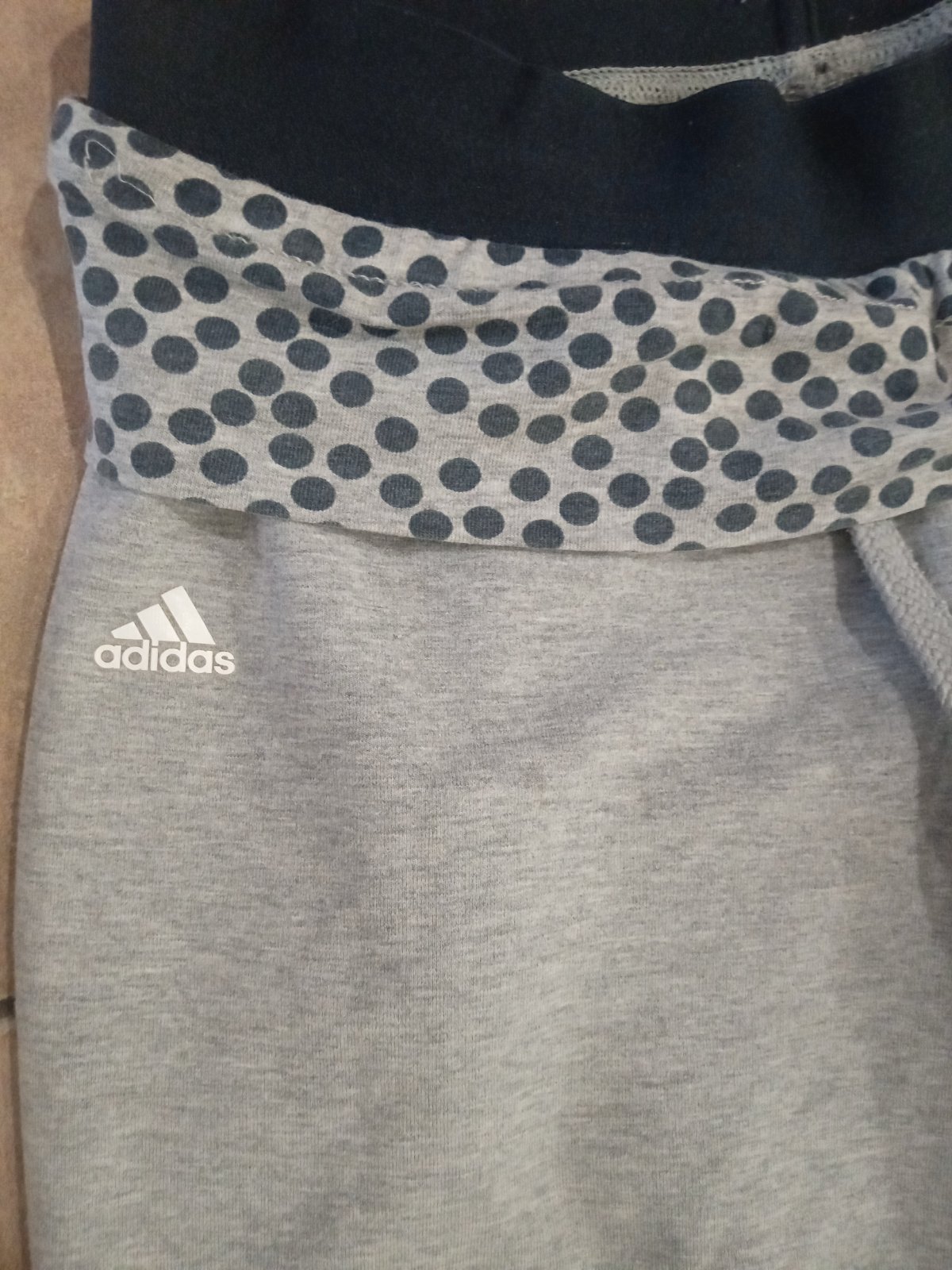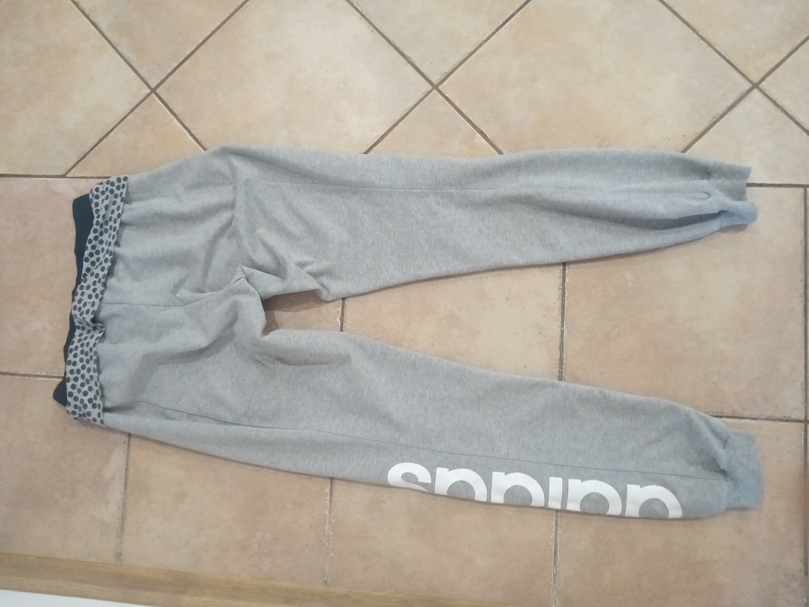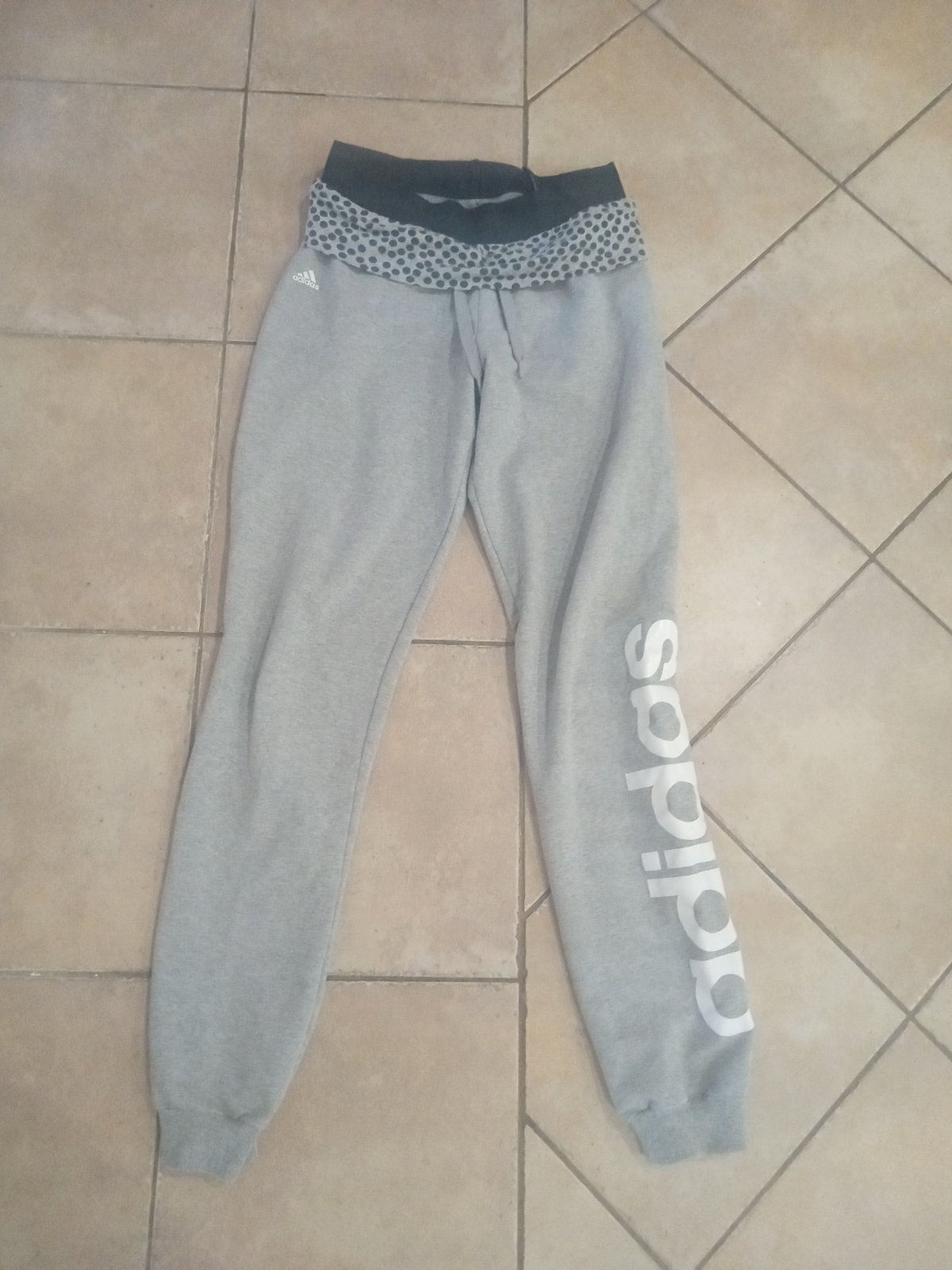 nosene sede teplaky Adidas s modrymi pasikmi, gumicka v pase, dolu volne, velmi prijemny hrubsi material. , zodpovedaju presne velkosti S teplaky boli nosene, pri kolene male pustene ocko. in...