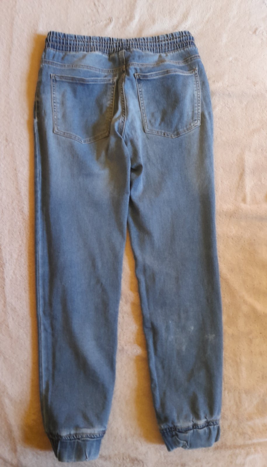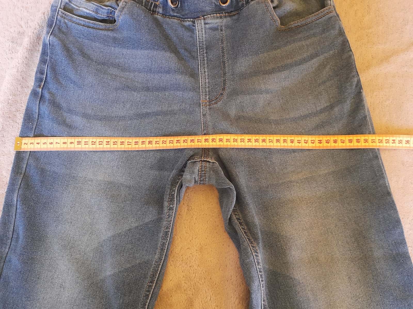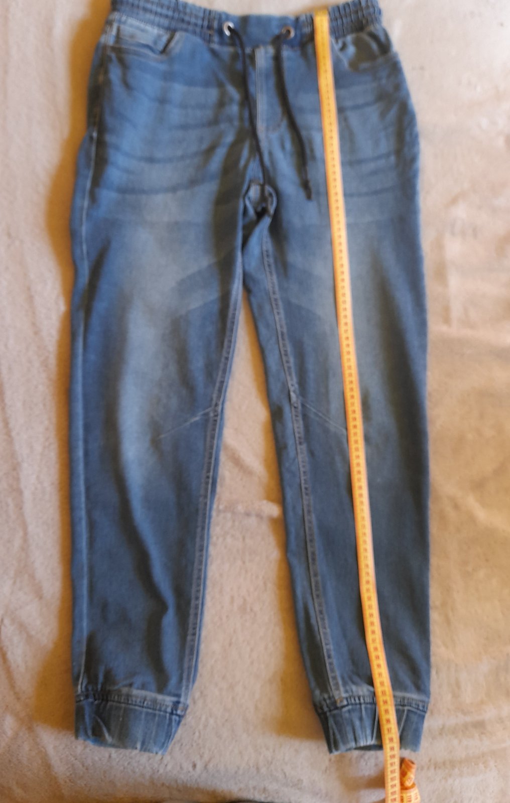 Len bežné známky nosenia , zachovalé , rozmery na fotkách , pre 14-15 ročného chalana, tenká čiastočne elastická rifľovina , šnúrka v páse funkčná. Zloženie : bavlna , polyester , elastan.