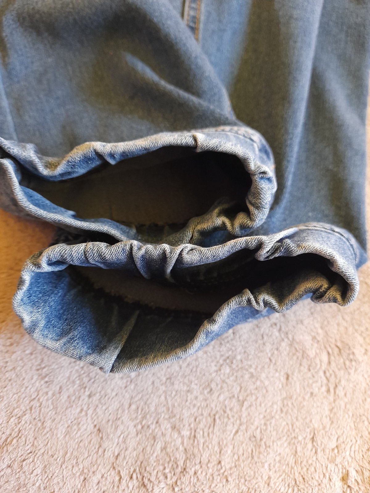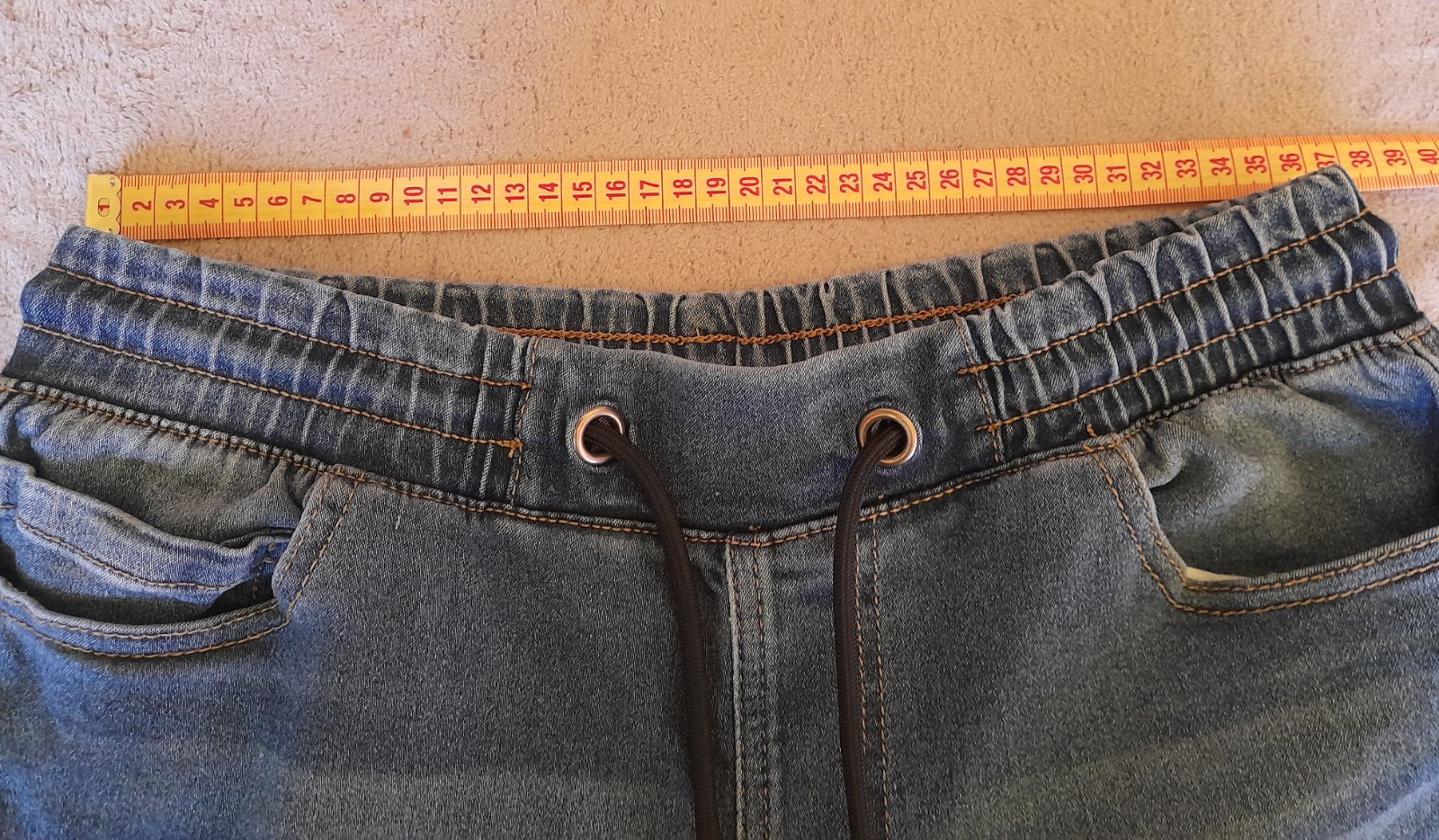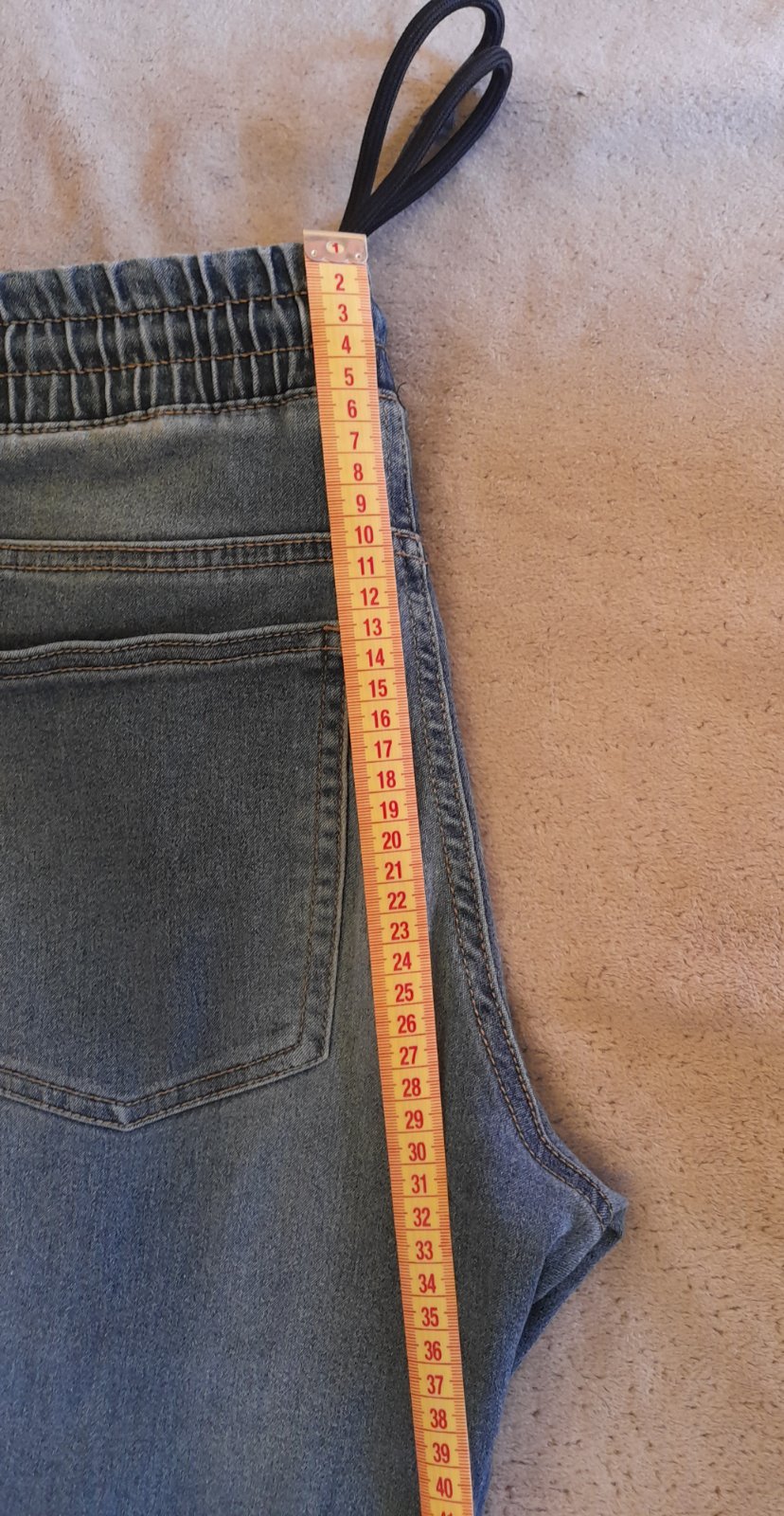 Len bežné známky nosenia , zachovalé , rozmery na fotkách , pre 14-15 ročného chalana, tenká čiastočne elastická rifľovina , šnúrka v páse funkčná. Zloženie : bavlna , polyester , elastan.