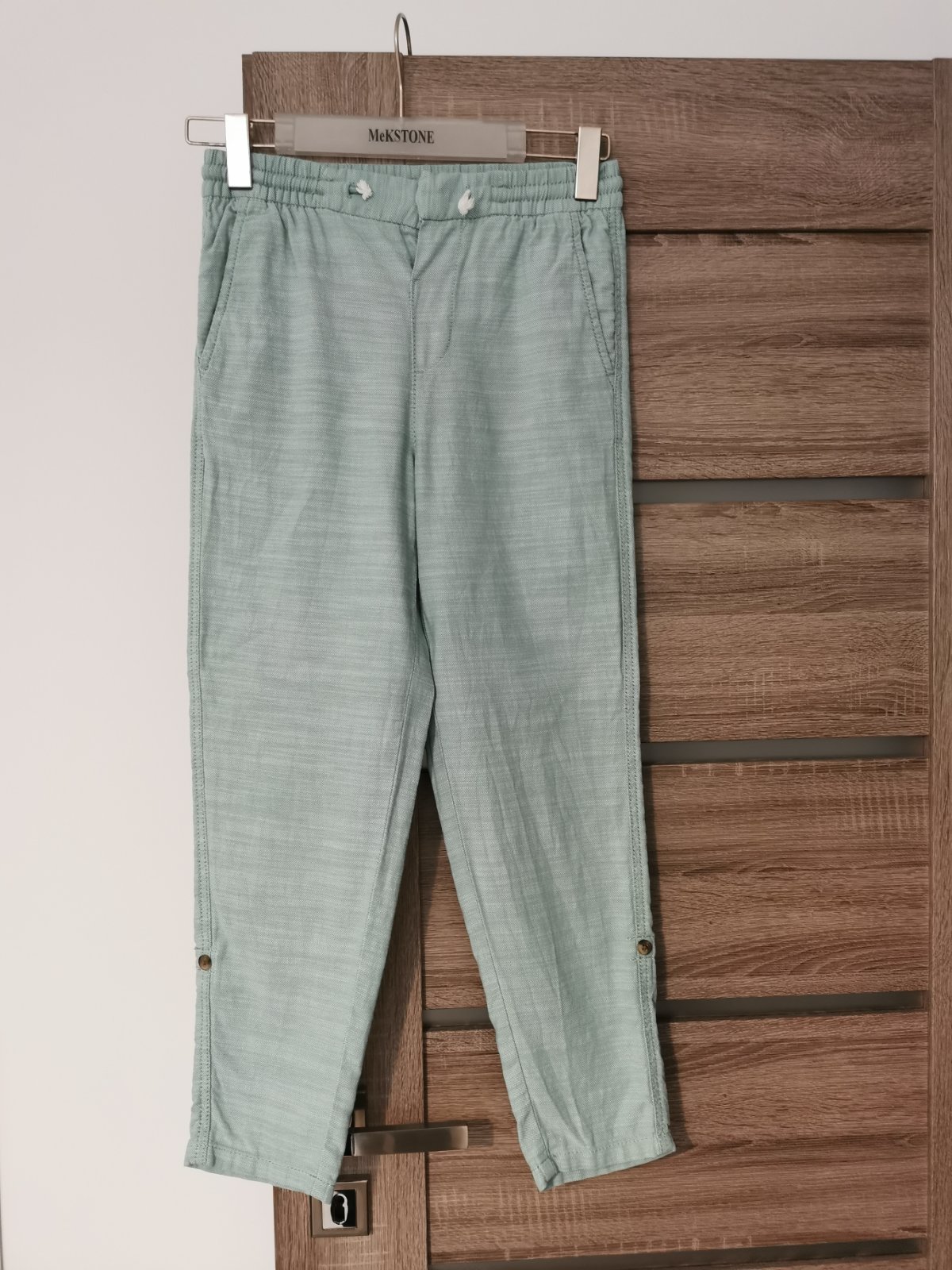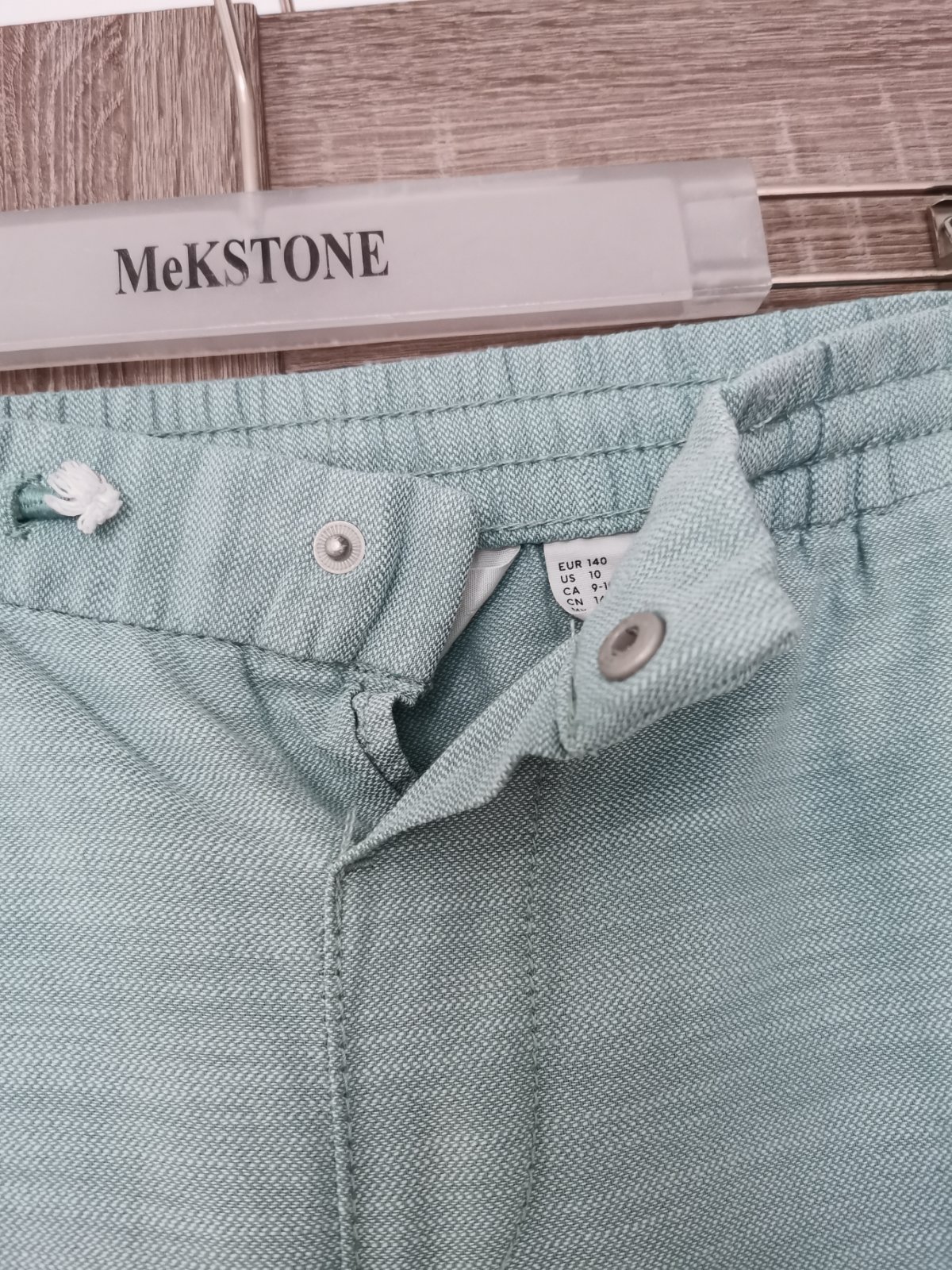 Predam nohavice znacky H&M, v krasnej jemnej zelenomodrej farbe, letne, prechodne, tenke. Raz oblecene. Velkost 140. Daju sa vyhrnut na 3/4ove. V top stave.