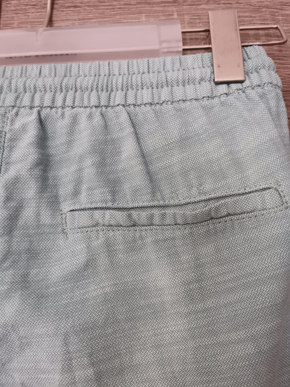 Málo nosené nohavice zelenej farby. Materiál podobný riflovine (denim). Pás nastaviteľný pomocou všitej gumy...