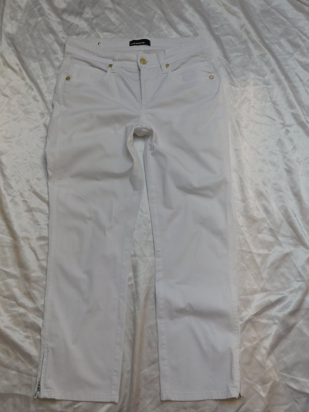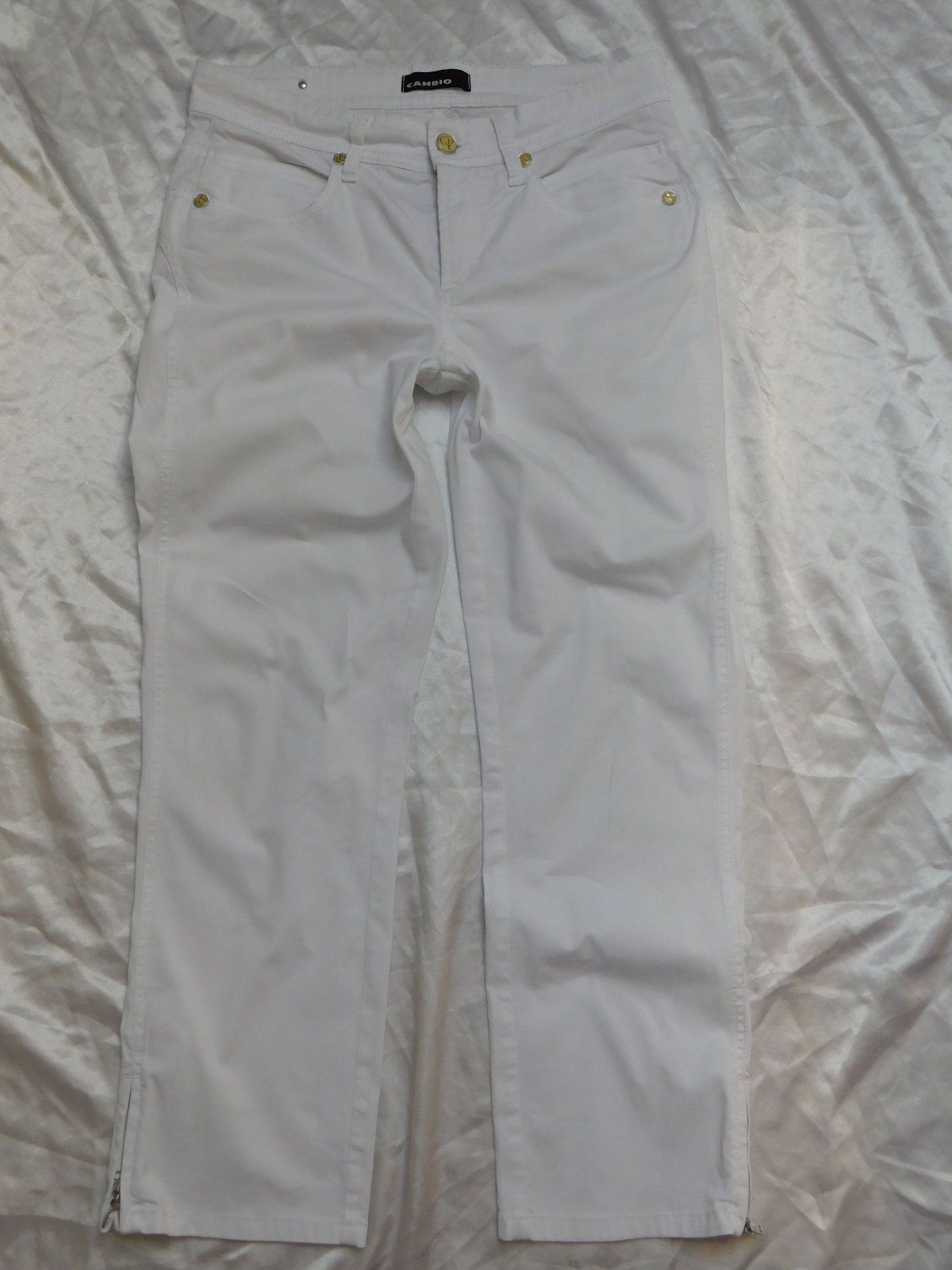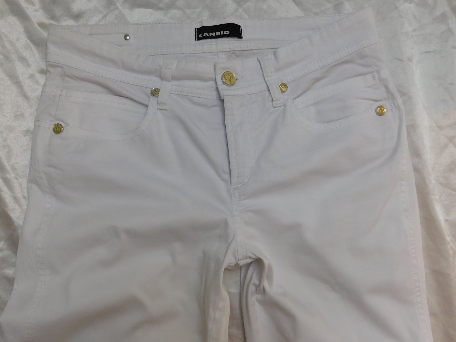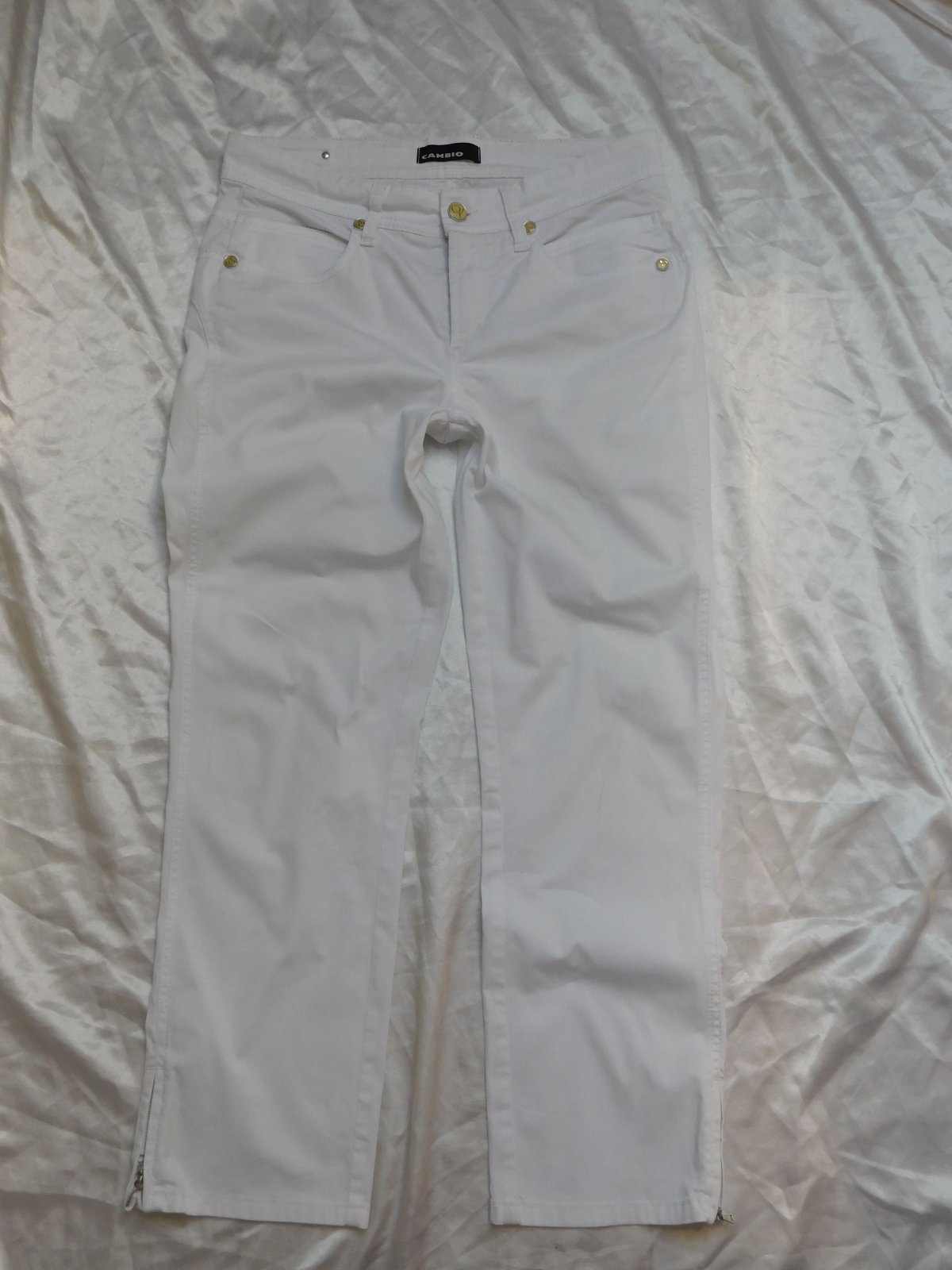 Luxusne damske rifle,bielej farby,dole po bokoch zips.dole slaboviditelny flačik/nevidno/,inak super stav ako nove. 97%cotton,3%elastan. se26