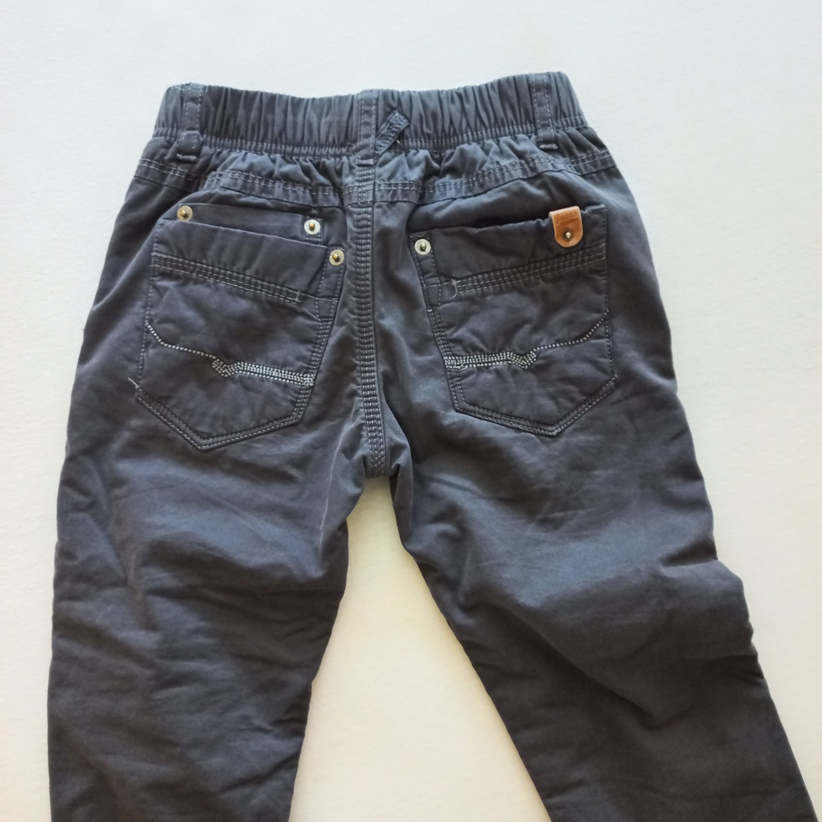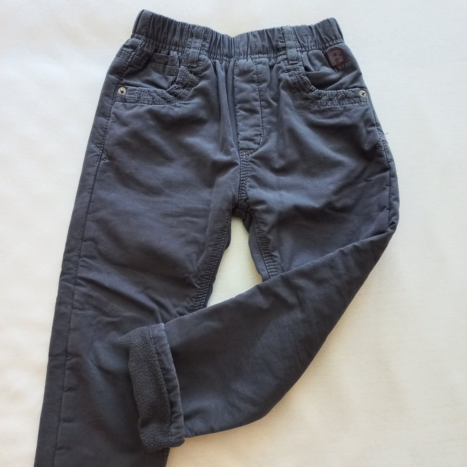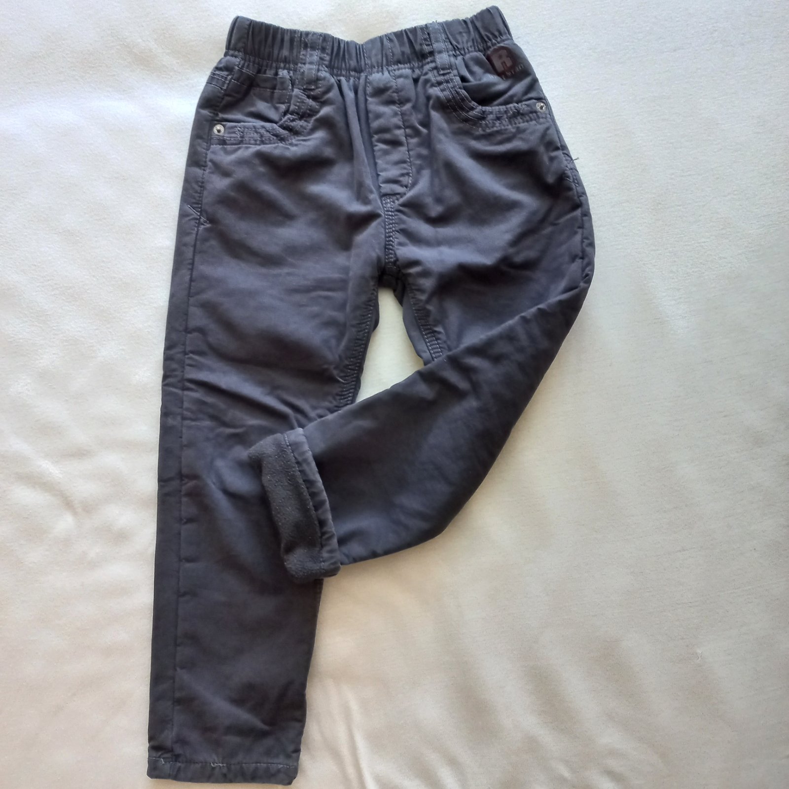 Zateplené nohavice jemnou dekovinou. Kolená trochu ošúchané, no bez dier. Ešte poslúžia.