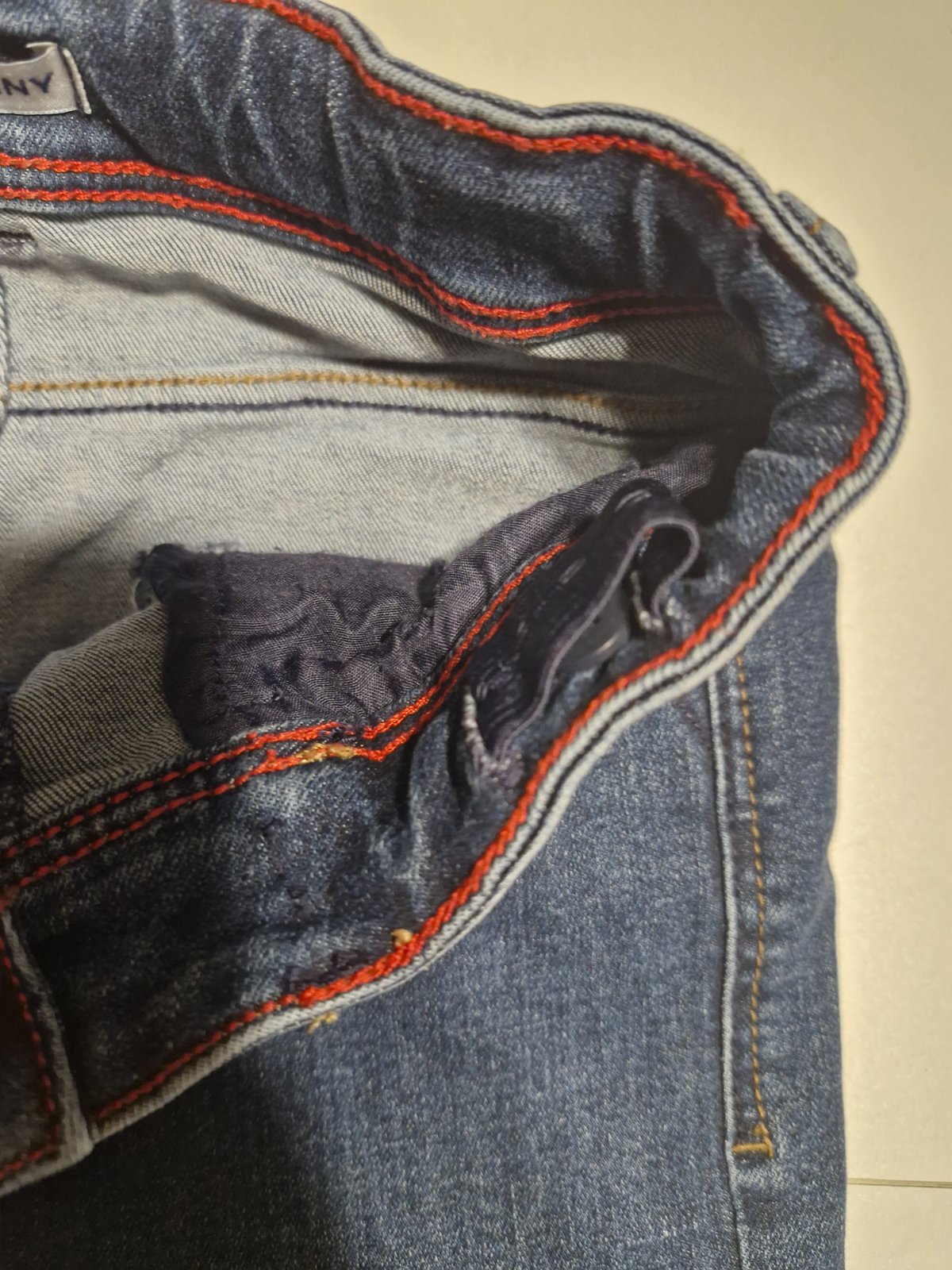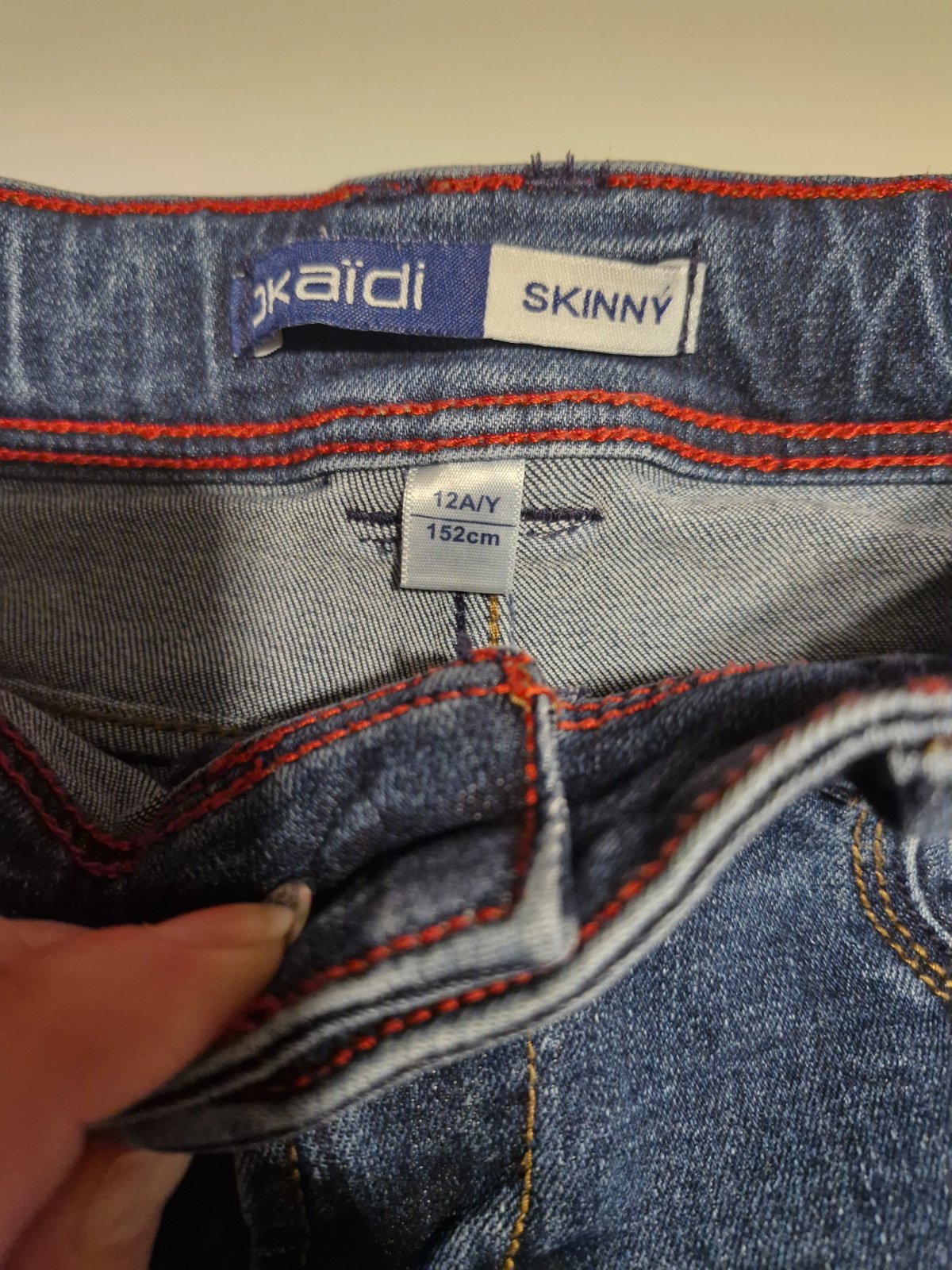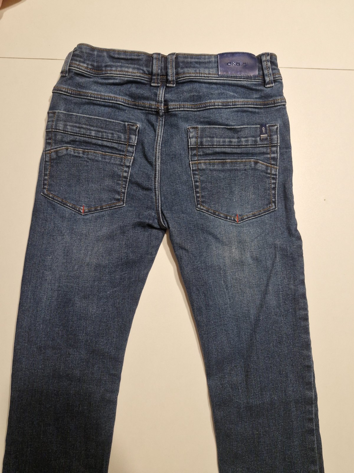 Bez poškodenia. Elastické, tenšia riflovina.