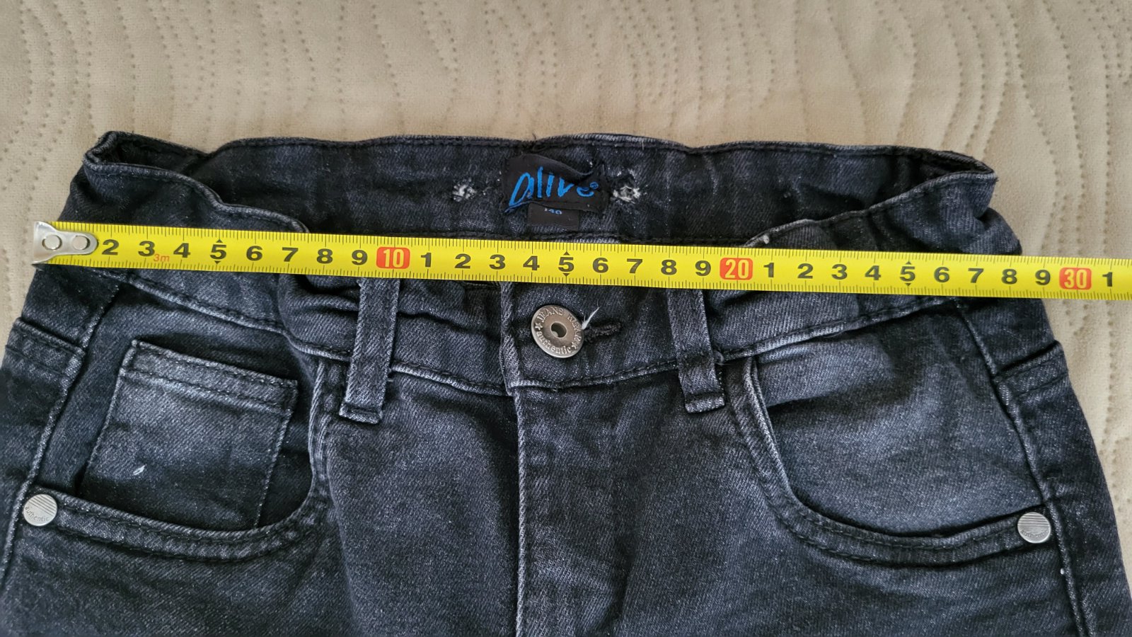 Chlapčenské rifle velk. 140, synovi boli široké, mali sme v nich natiahnutú gumu, preto tam zostali dierky, inak v poriadku