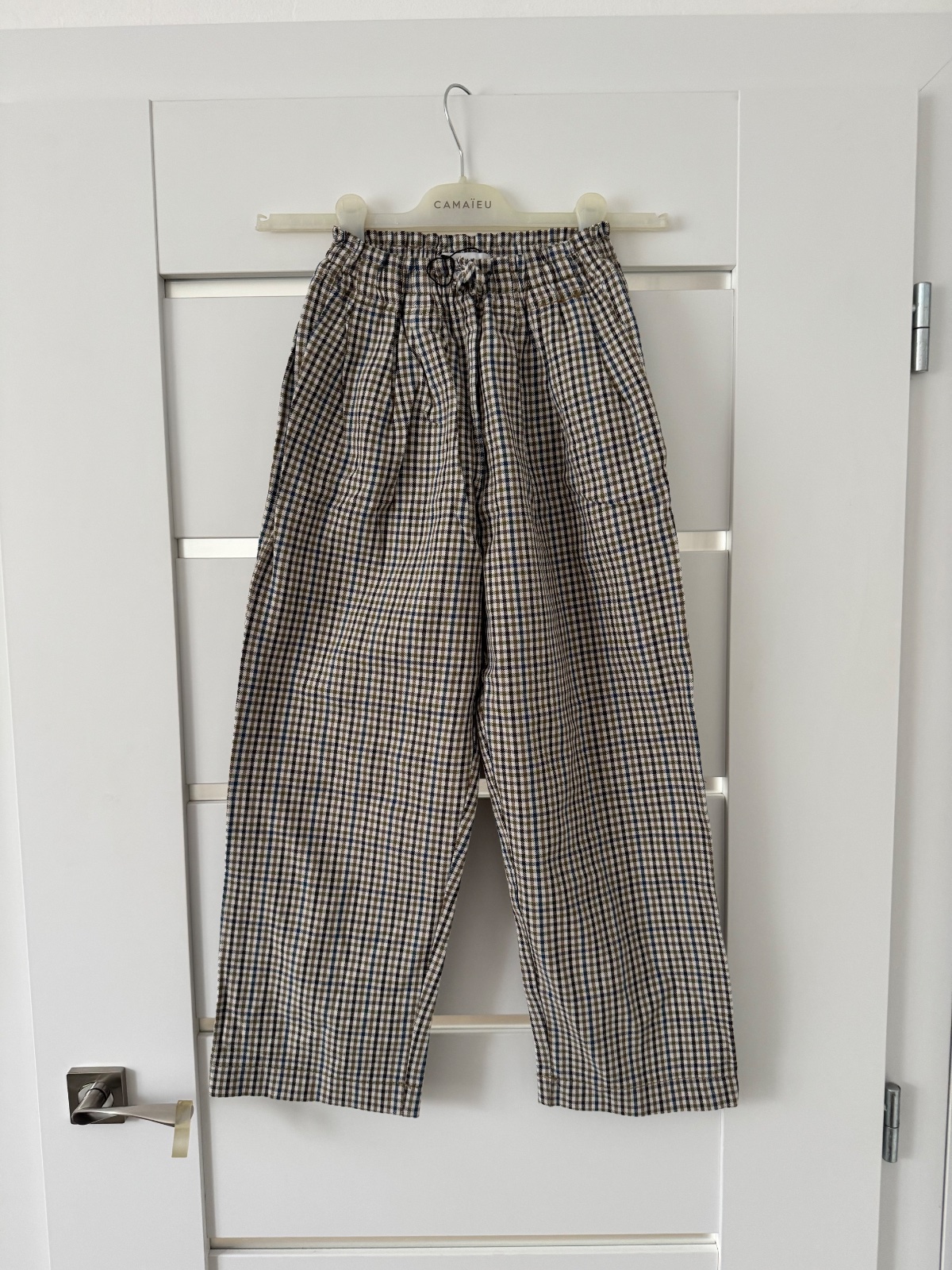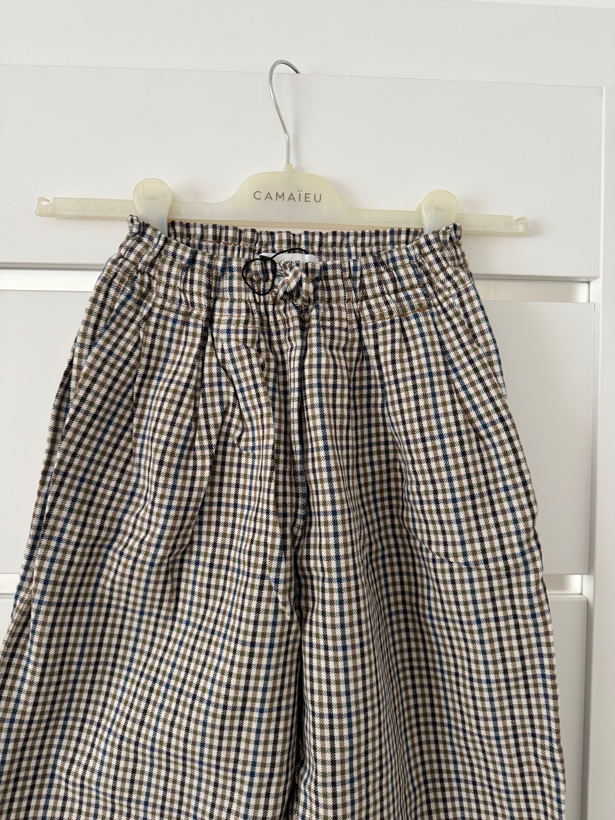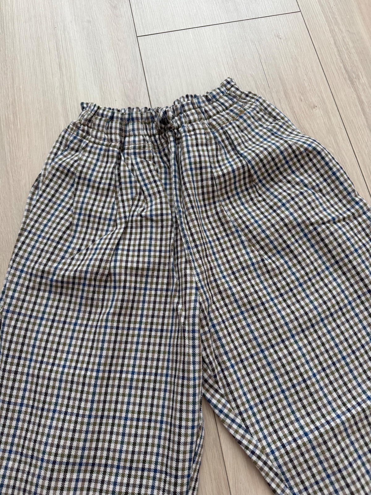 Nohavice s riasenim v pase a so vzorom kohutej stopy. Elegantne. Šedá a Modra. Oblecene raz do kina. Tip top stav. PC 23€ Dĺžka 84, pas v klude 31cm. V zadnej časti guma v pase, vrecka a zips.