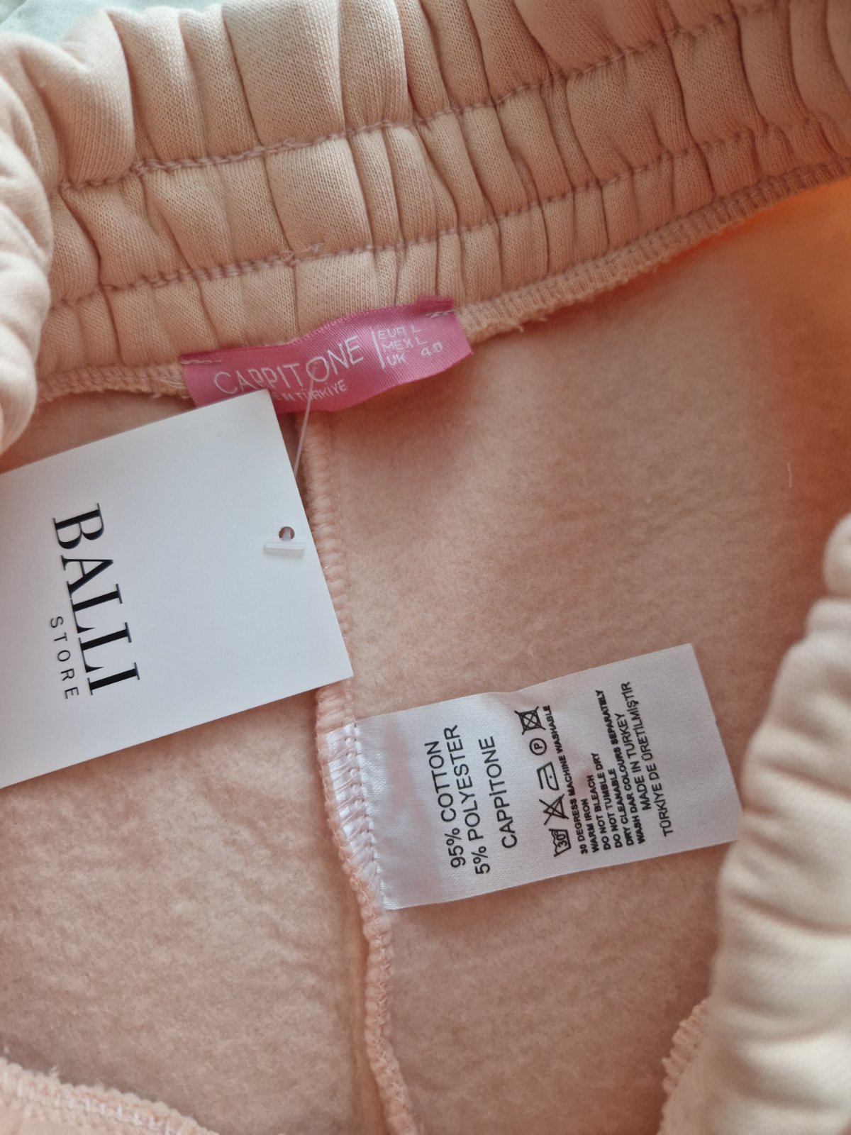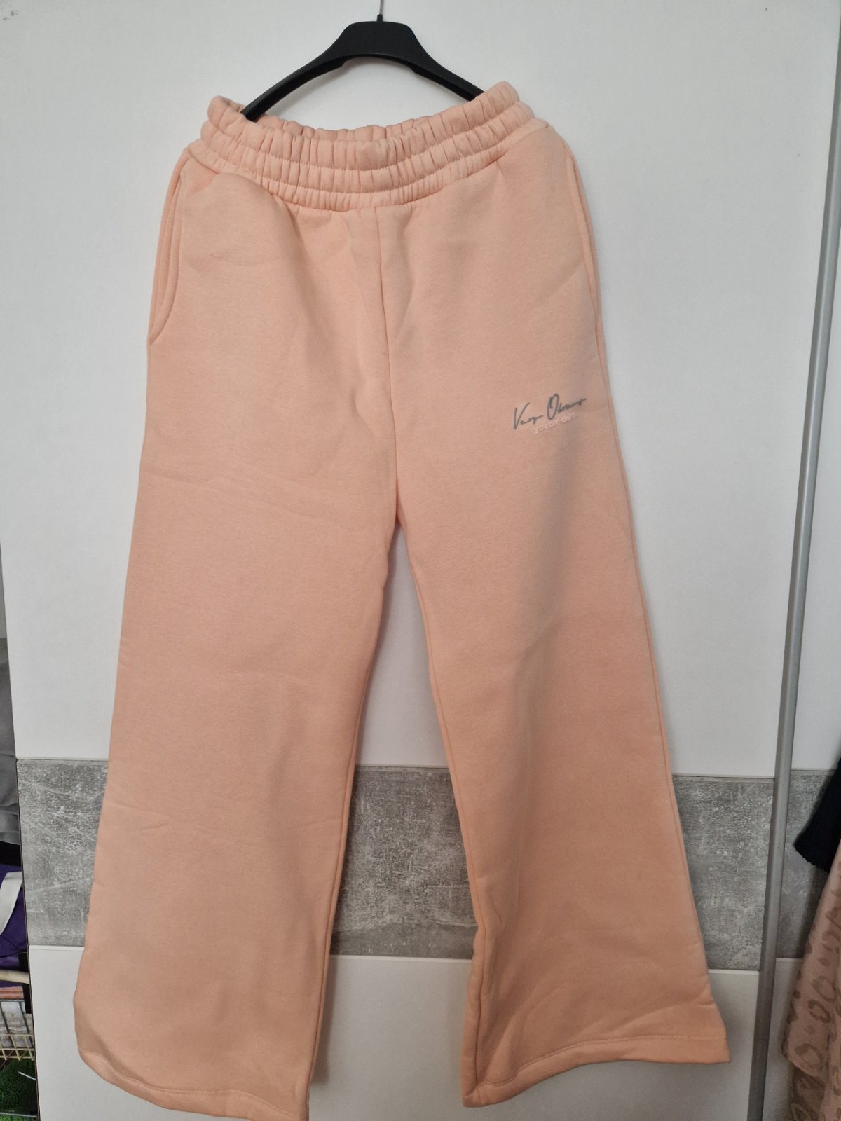 Posúvam nenosené zvonové tepláky, farba je broskyňová.