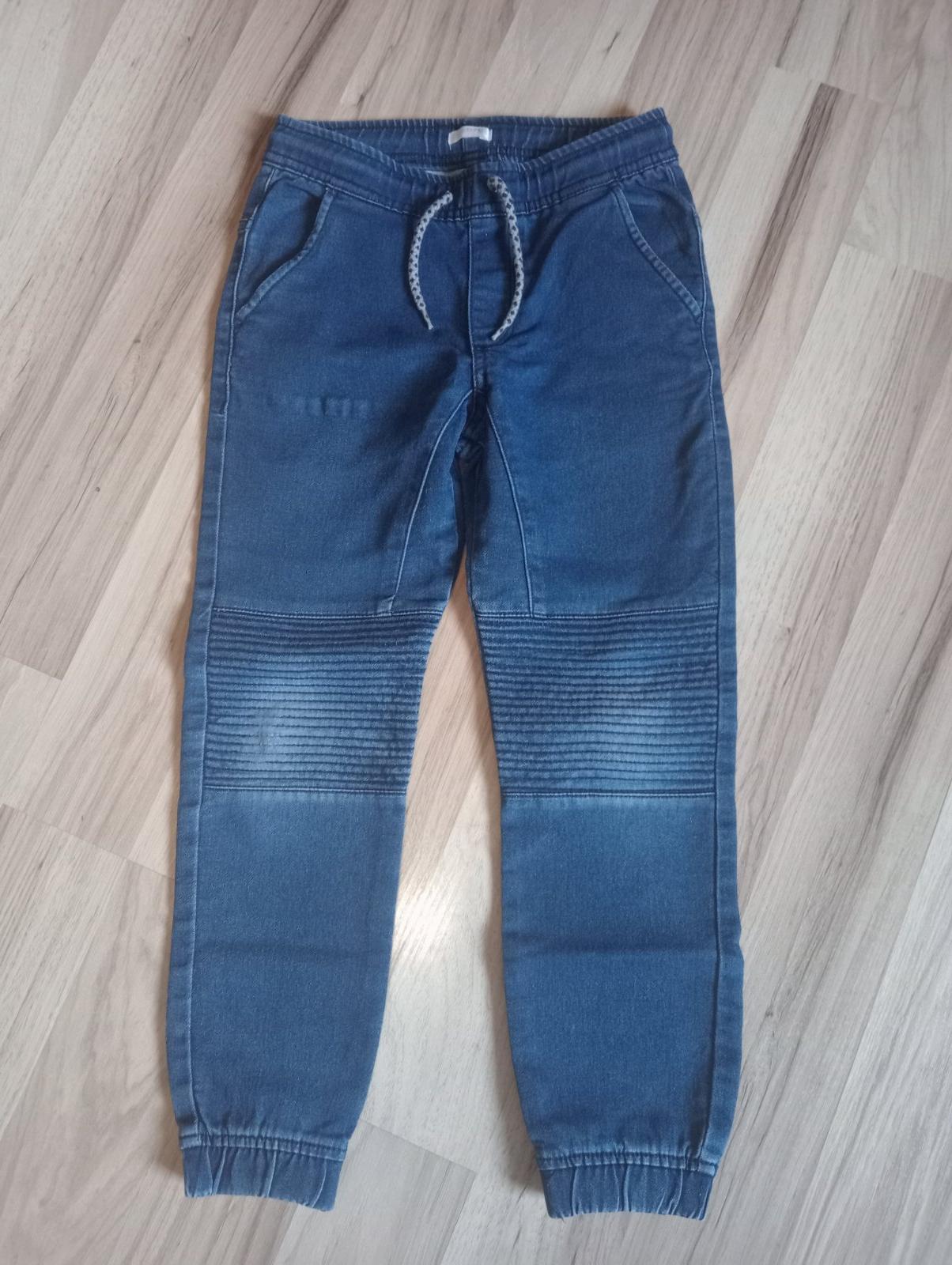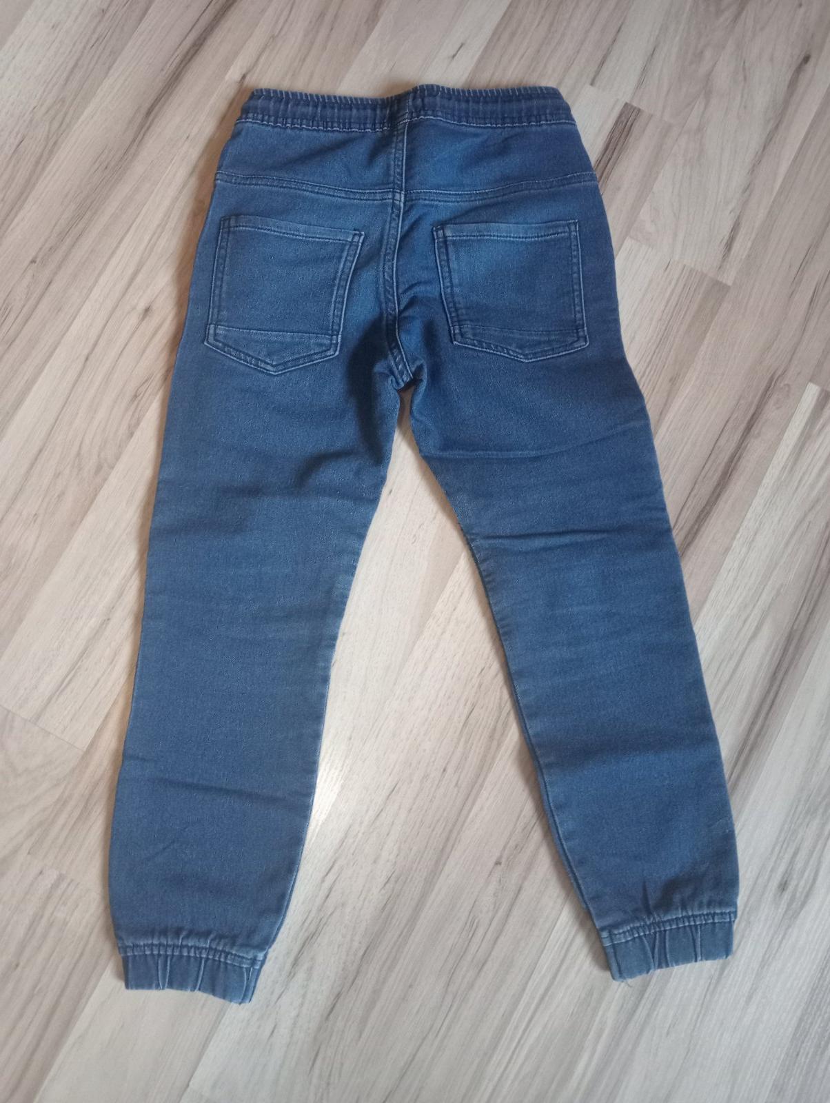 Pohodlné džínsy s nastaviteľným pásom, ako nové. Veľkosť 122 - 128 cm, vonkajšia dľžka od pása je 72 cm, vnútorná 54 cm a pás 30 cm.