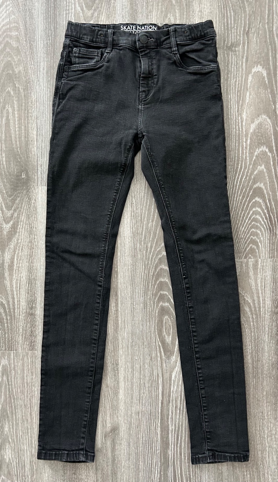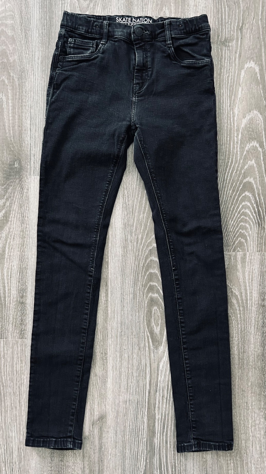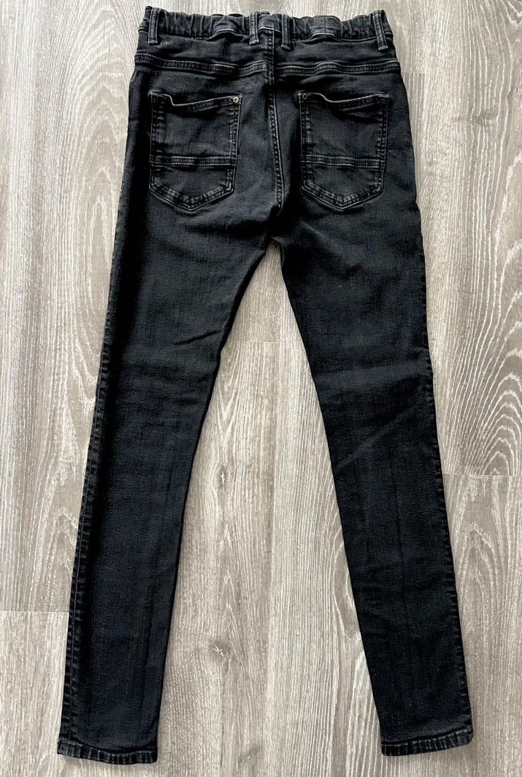 Čierne, mierne šúchané slimky rifle s nastaviteľným pásom; pre štíhlych chalanov; Uvedená veľkosť 176; Miery: dĺžka bočná 104 cm, pás 37cm x2, ešte sa natiahne a dá sa aj stiahnuť - je regulovateľný, zvnútra; klin 30cm;