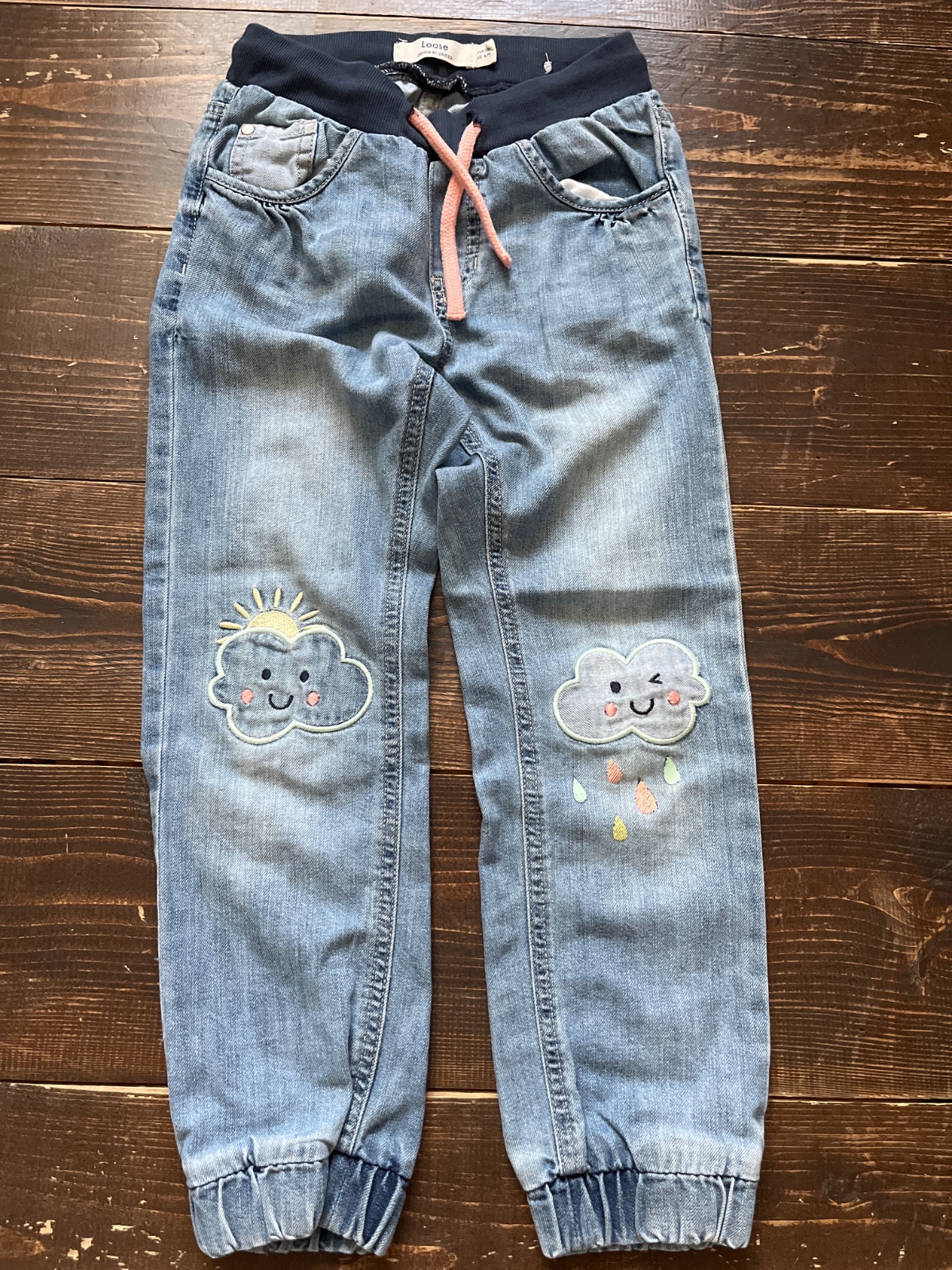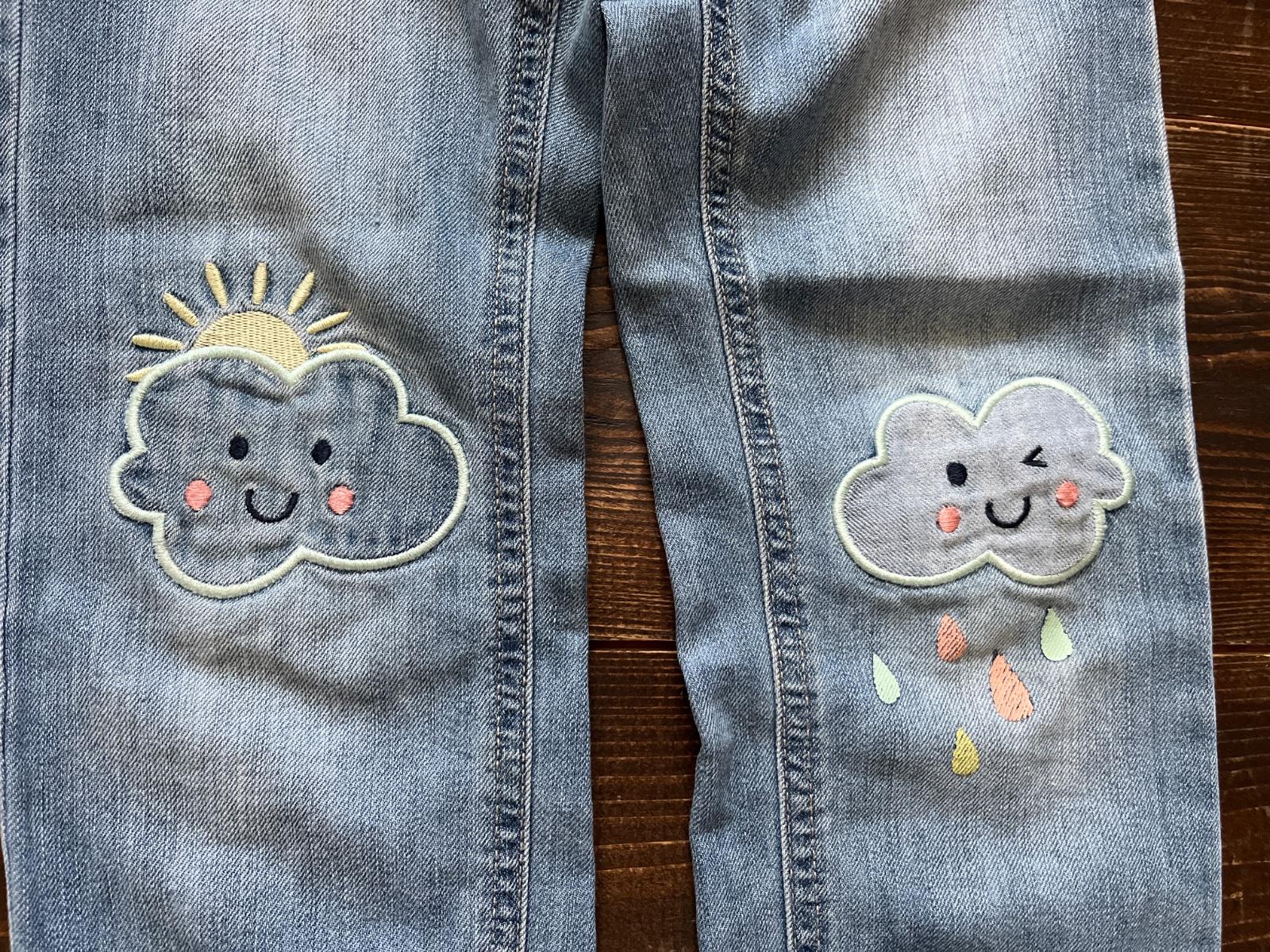 Veľmi pekné rifle s nášivkami, pás regulovateľný.