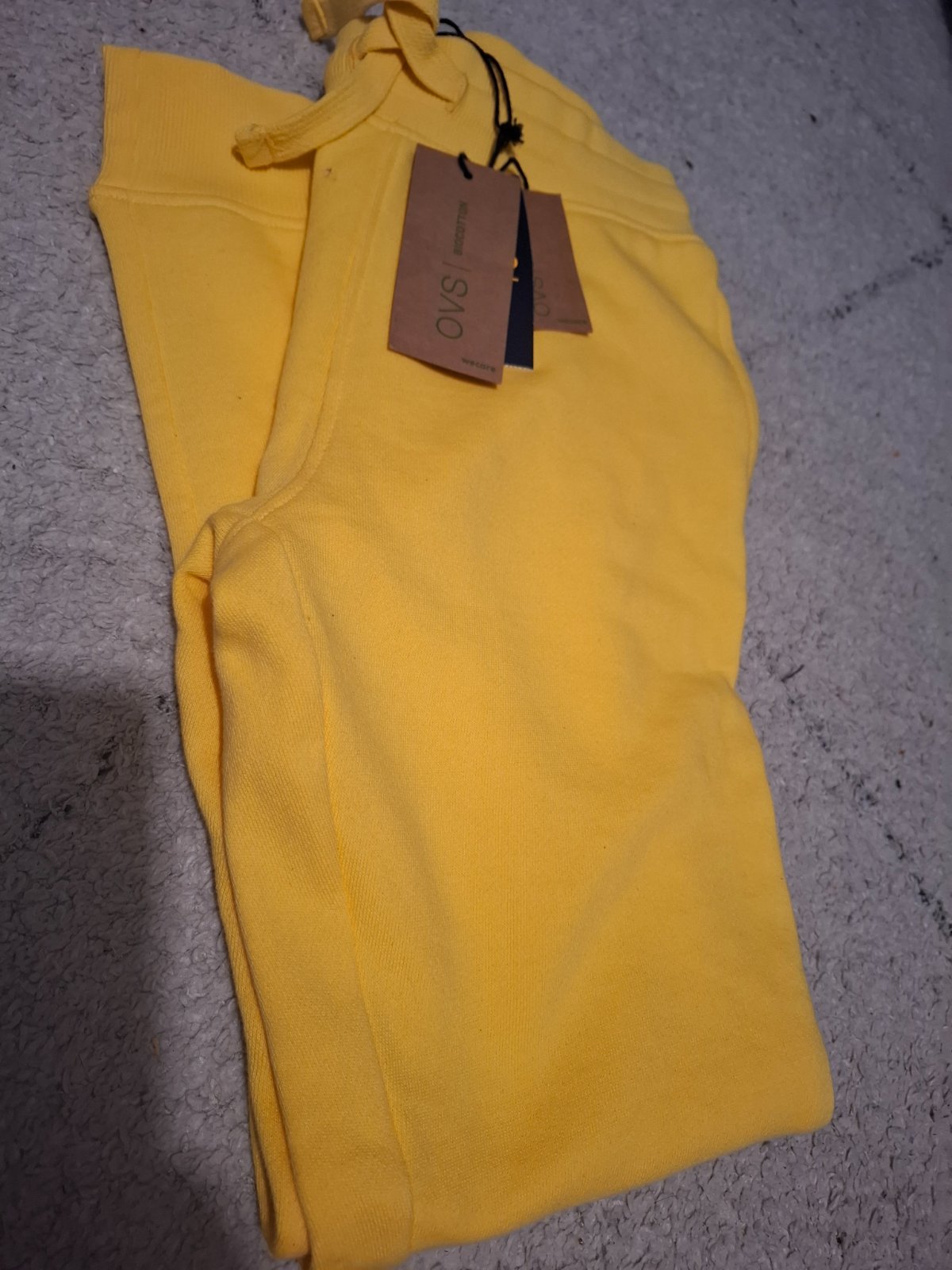 mäkkučké mierne zateplené tepláky v žltej farbe s malým nápisom Santa Monica. veľkosť M, jedná sa o volnejší model takže kľudne sadnú aj na väčšie veľkosti