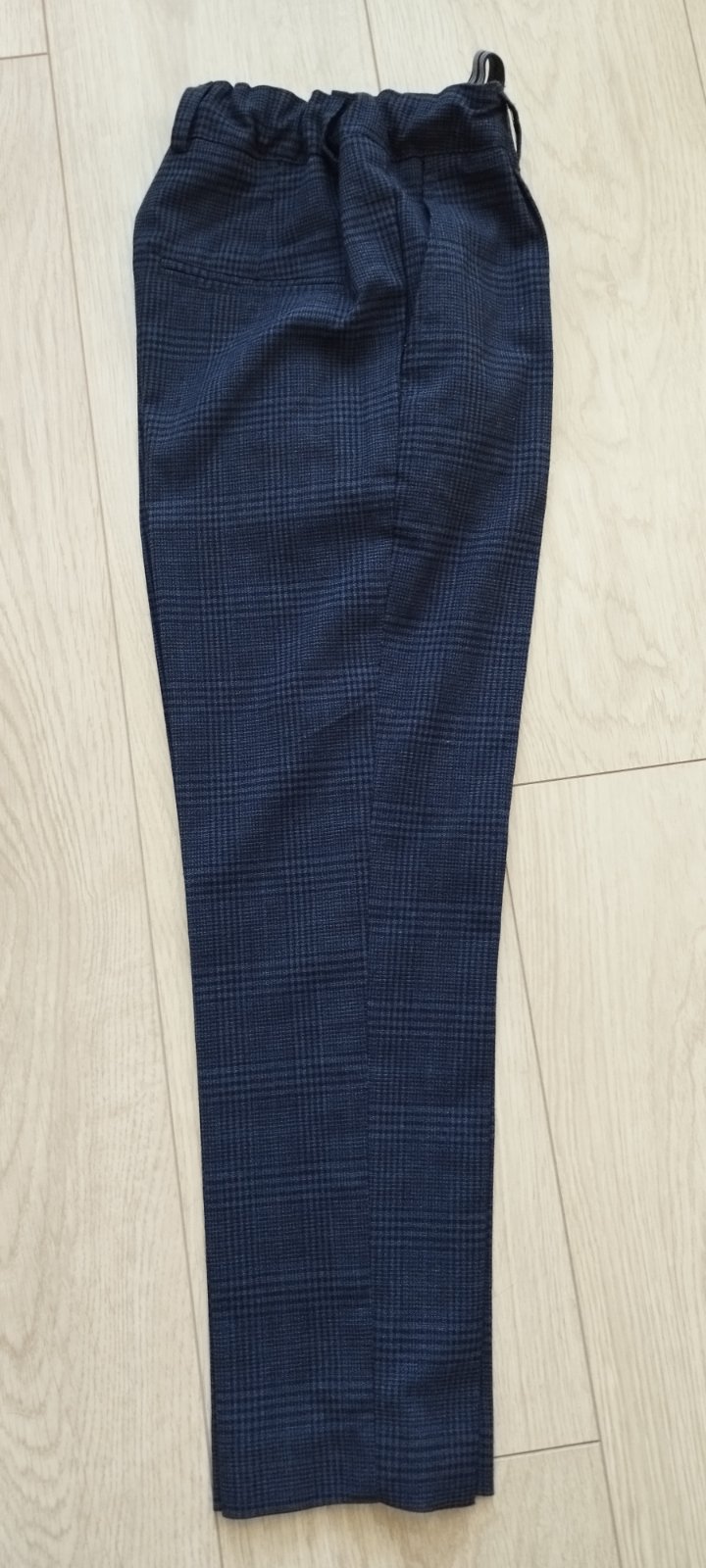 Veľmi pekne nohavice,dajú sa upraviť v páse na gumičku, Tmavamodráso vzorkou,dlzka74cm