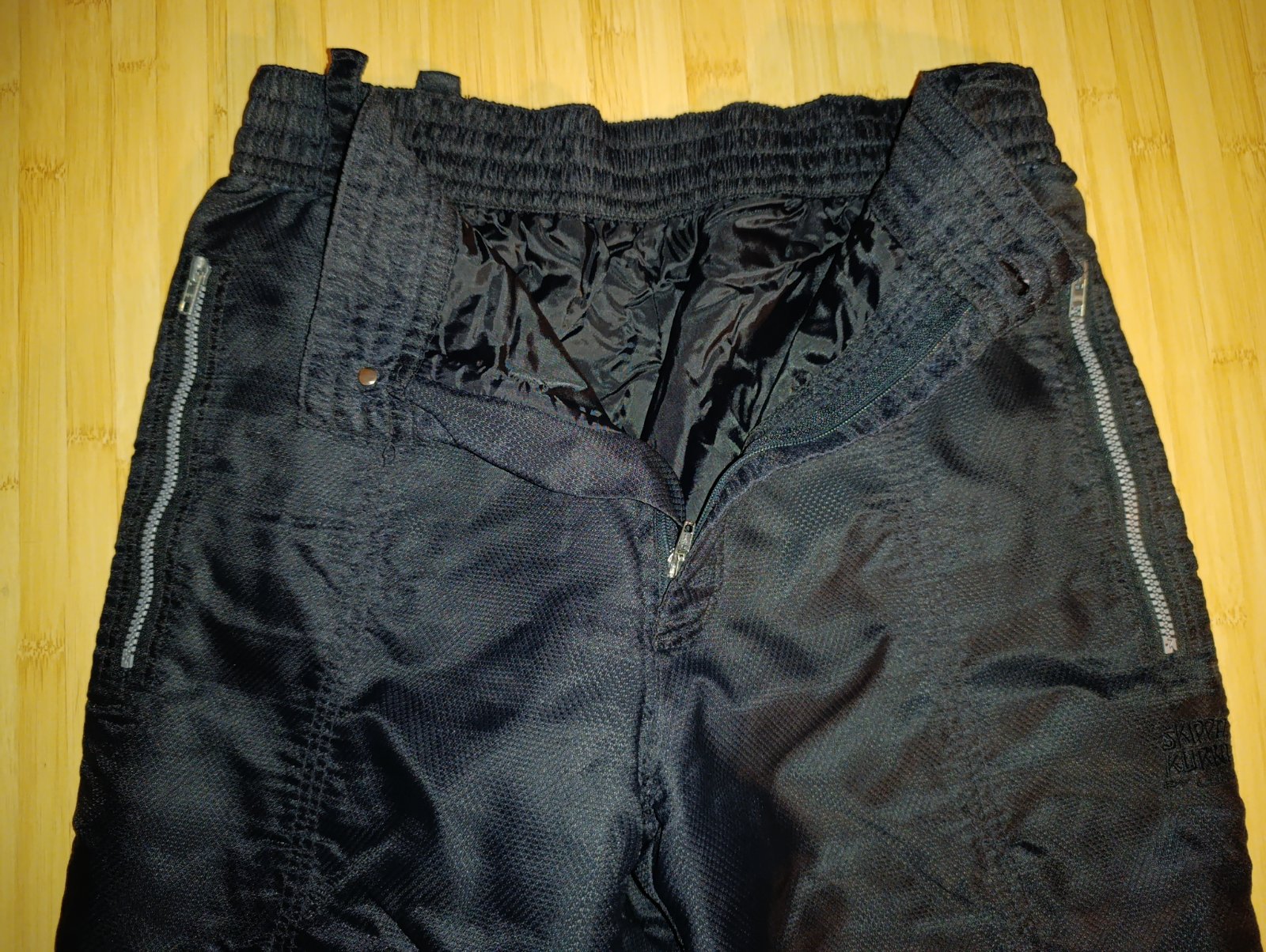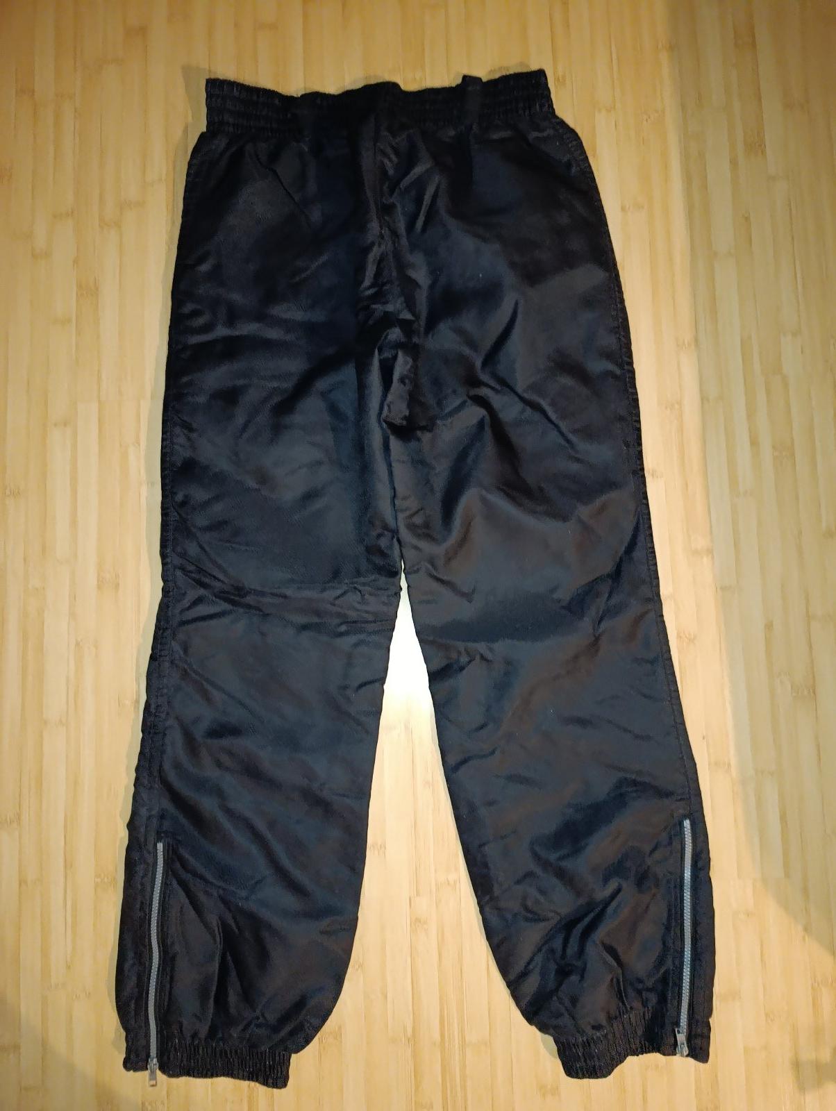 100% stav, 2 vrecká na zips, reflexné prvky, v páse guma a šnúrka, v dolnej časti zips na rozšírenie, vhodné aj na lyžovačku, D: 111 cm, VD 83 cm, pás 2x38-46 cm, predný sed? 29 cm, zadný sed 45 cm