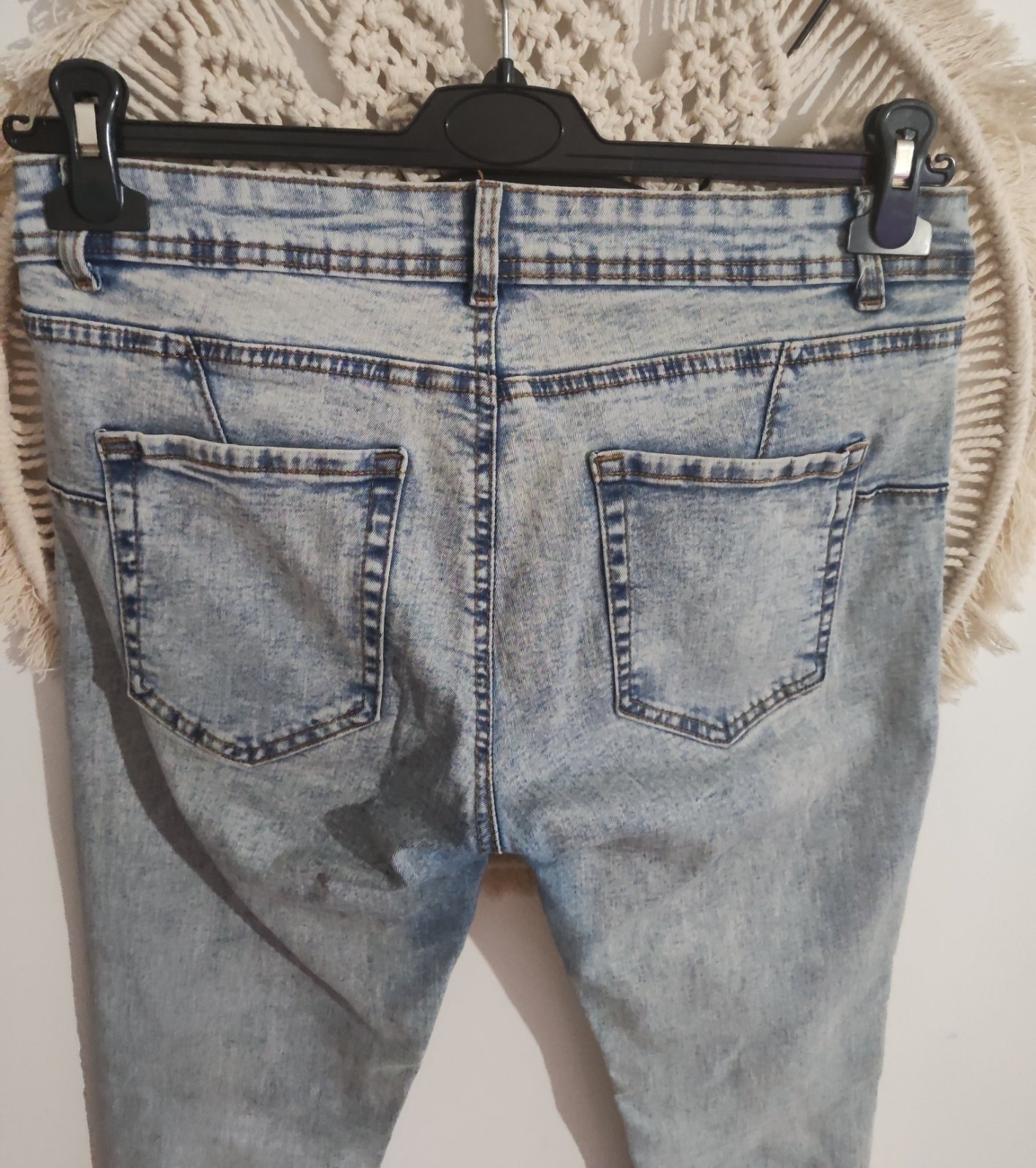 mäkká elastická riflovina - 98% bavlna, 2% elastan, veľkosť 40, sadnú na 38/M, premerajte - dĺžka 99cm, od rozkroku nadol 74cm, pás v kľude 39.5cm