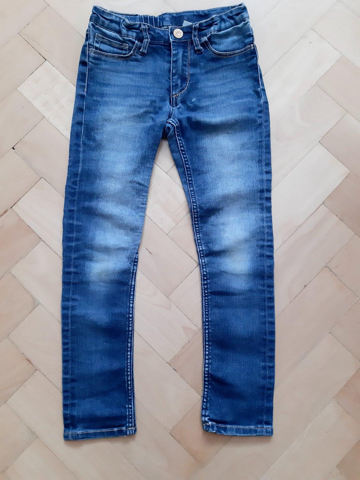 Značka: F&F Veľkosť: 122 (6-7 rokov) - aj tak presne sedia Farba: modrá Materiál: riflovina s 2 % elastanom Nie sú tvrdé ako klasická riflovina, ale materiál je príjemne mäkký a elastický. Majú z v...