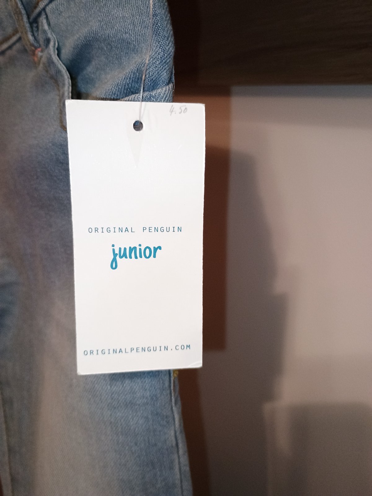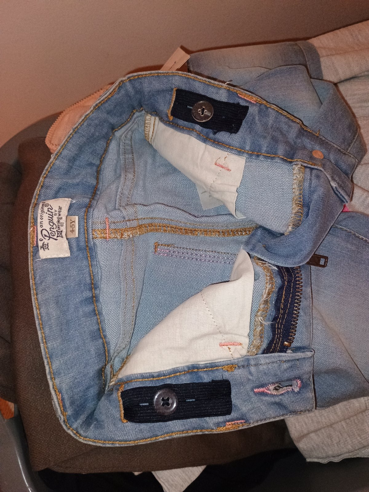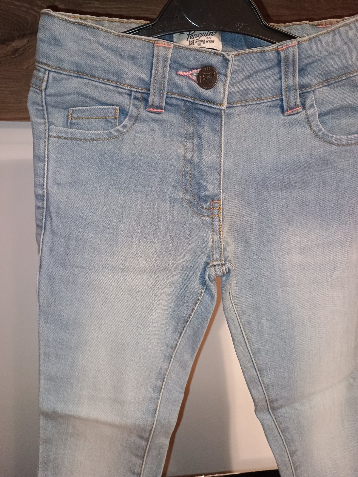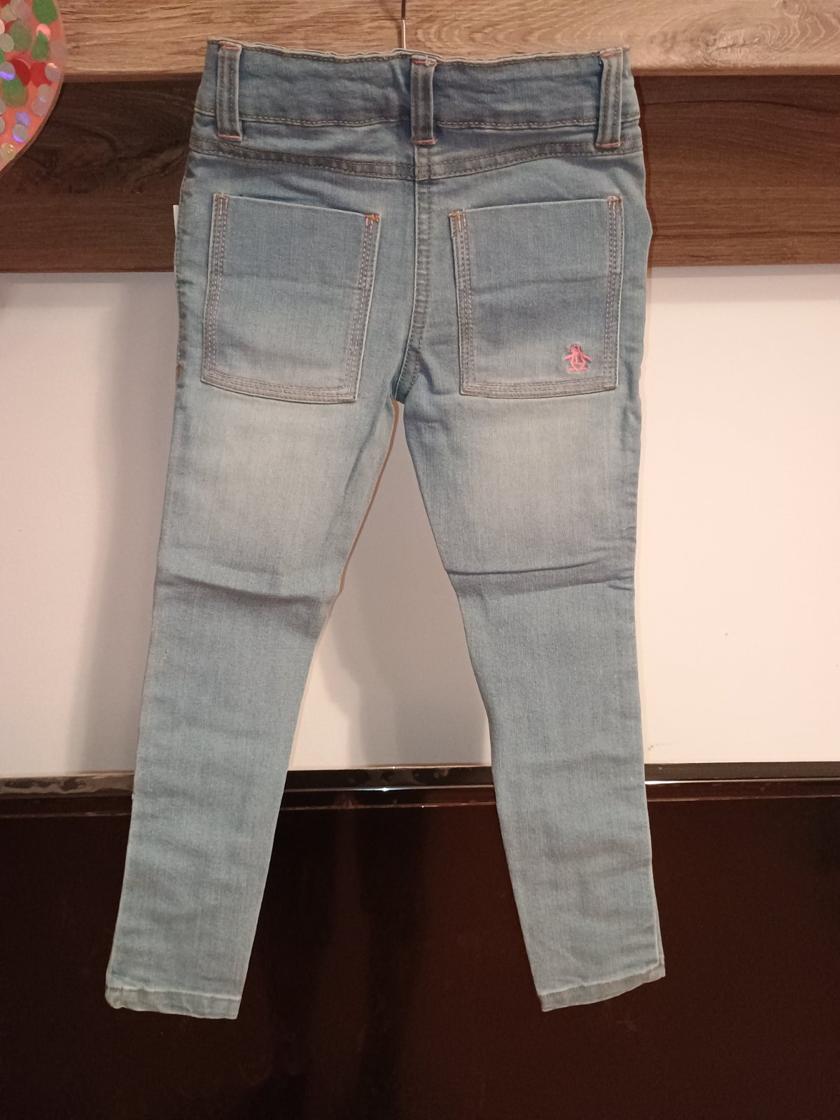 Bledomodré jemne vyšúchané rifle, značka Penguin. Zapínanie na zips a gombík, vpredu aj vzadu otvorené vrecká. Pás je jemne elastický a vnútri nastaviteľný.