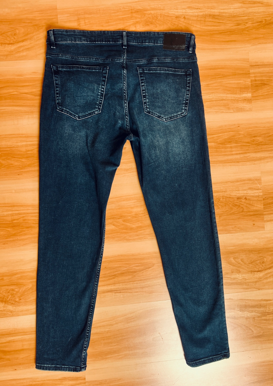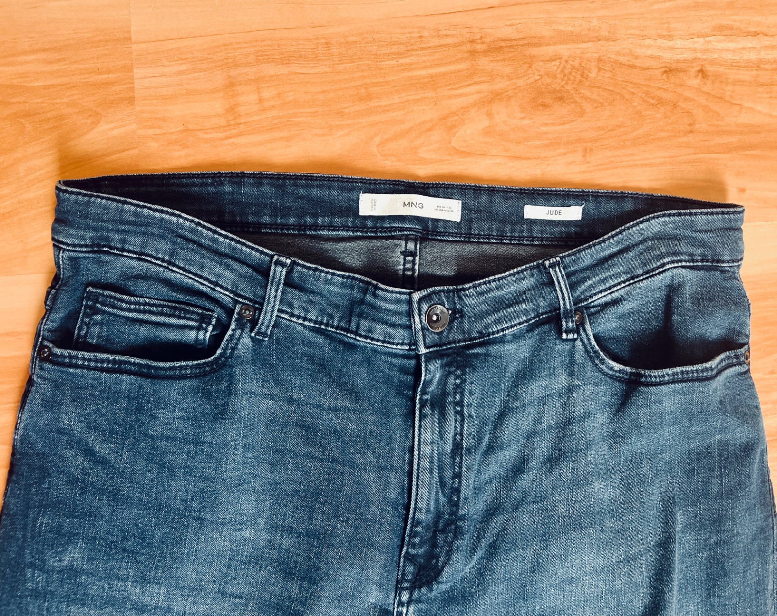 Tmavomodré rifle značky Mango. Jednoduché, takže sa hodia na každodenné nosenie. Veľkosť je písaná 46.