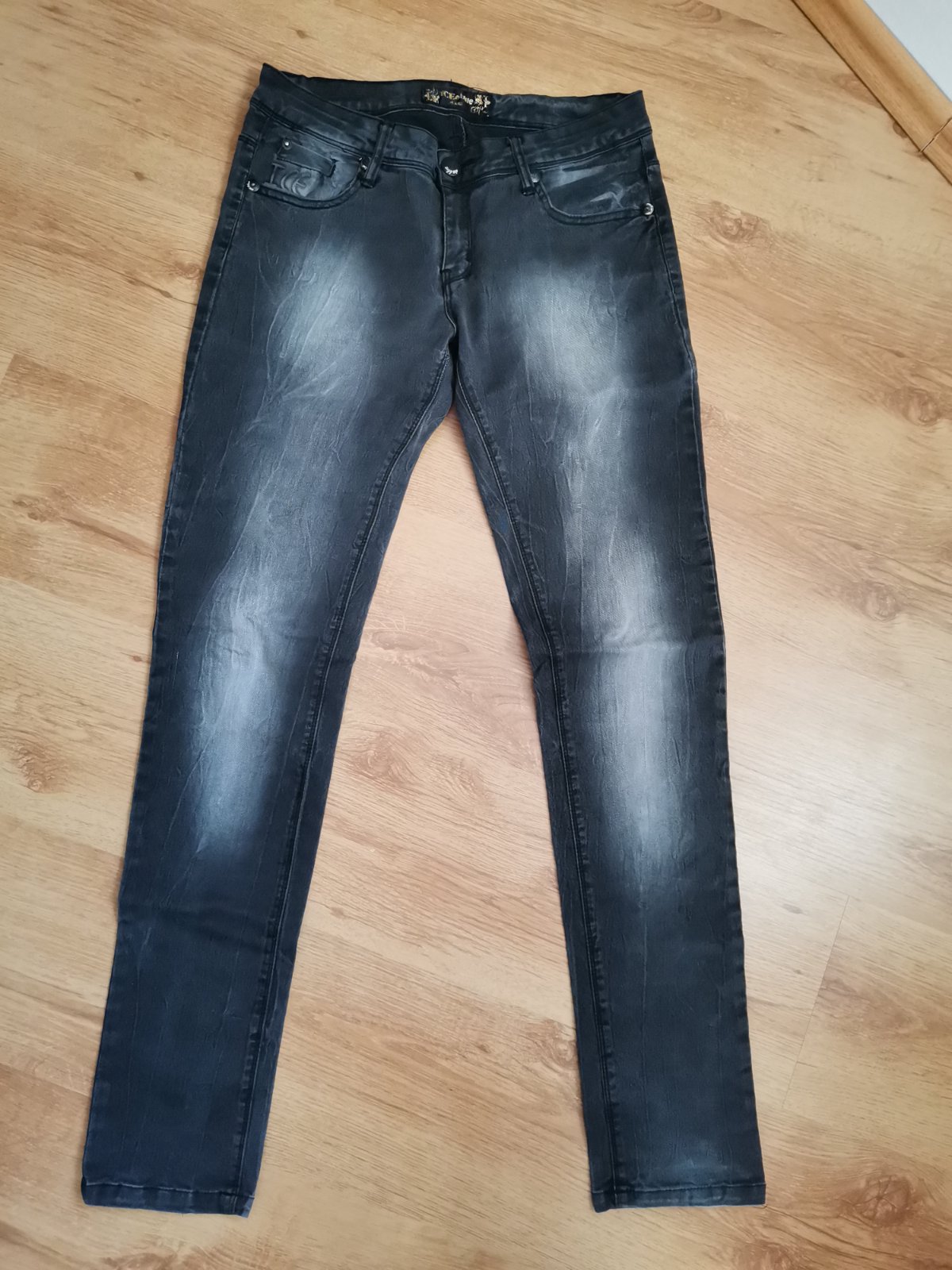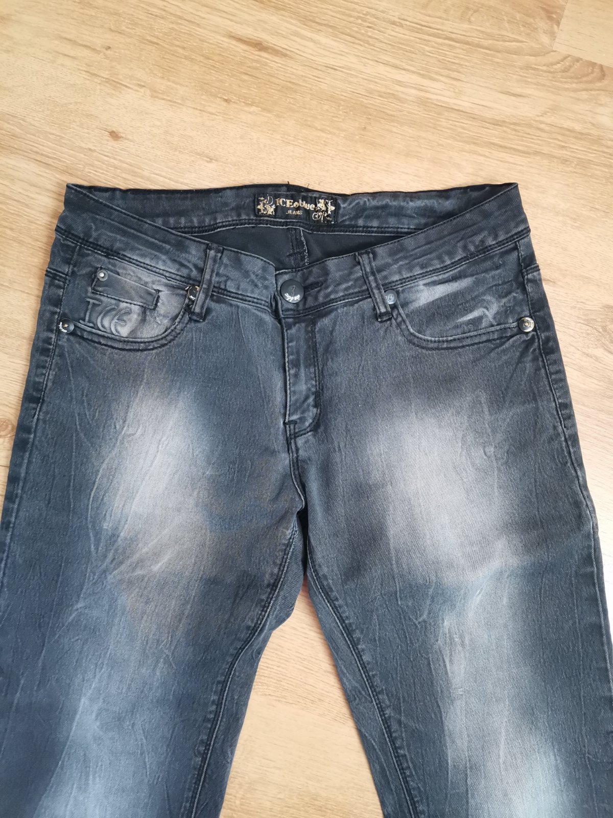 Mierne elasticke rifle, zn. Just Cavalli.Flitrova aplikacia na stehnach. Velkost 29. Dlzka 109 cm, pas 2x42 cm. Minimalne nosene.