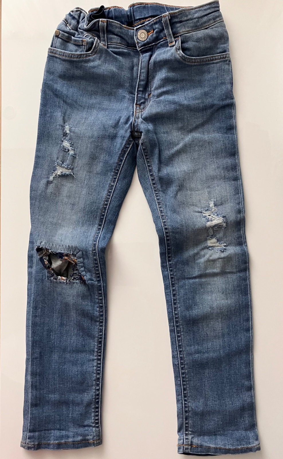 Zľava: Rifle modré, značka HM-stretch, veľkosť 7-8, 128, no nezodpovedá. Pevná riflovina, nie sú tenké. Dobrý nosený stav, len mi v nich malý spadol v škole, takže som musela dať zašiť. Spravili m...